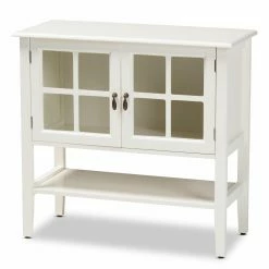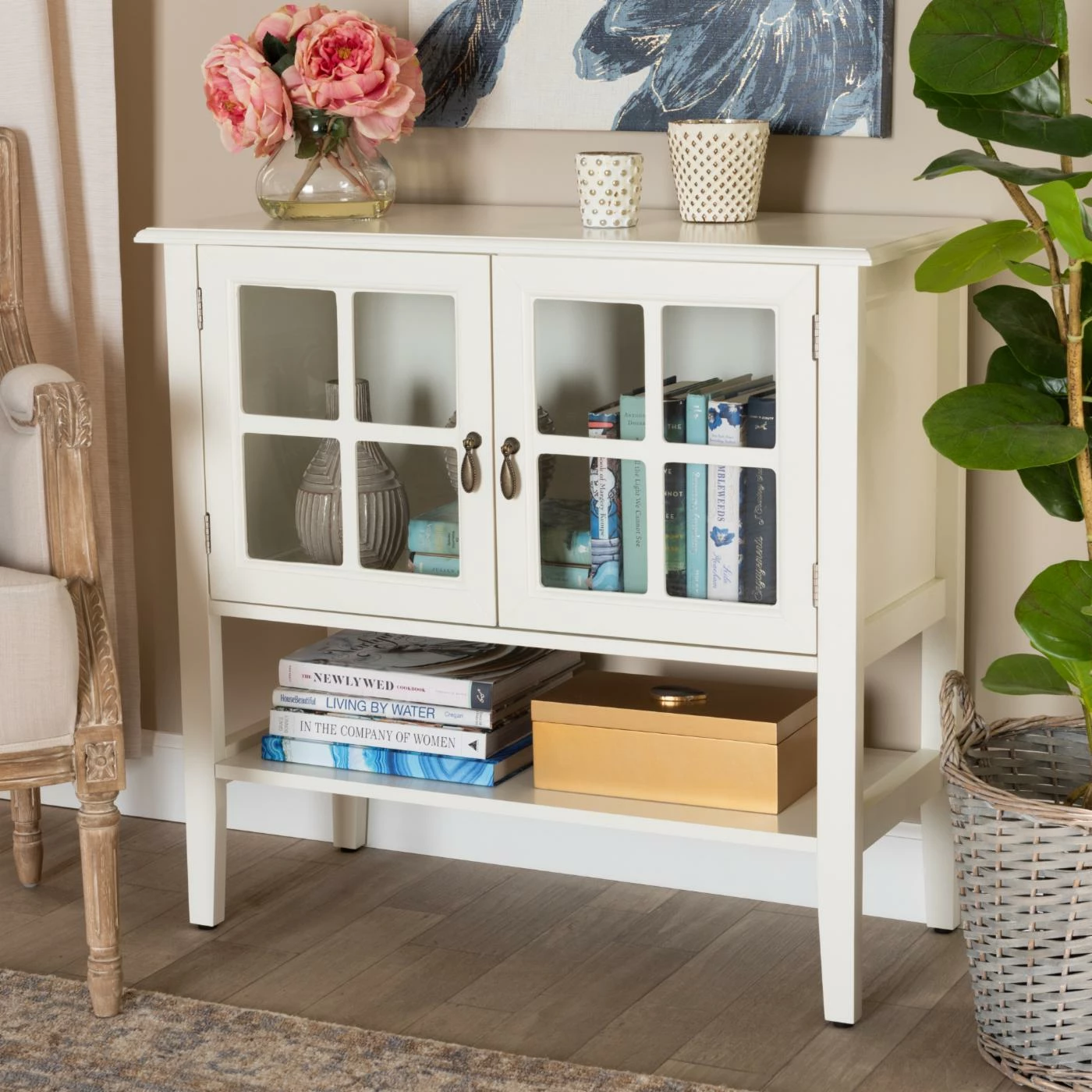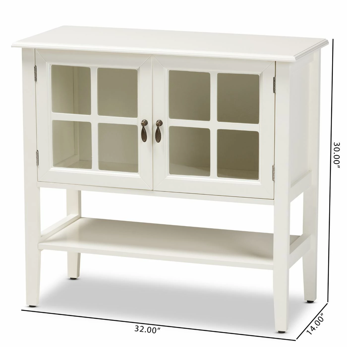 Keep your rooms organized in style with the Baxton Studio Chauncey 2 Door Accent Cabinet. Two glass doors provide easy access to one shelf that provides secure storage for all your favorite display items. Each door is fitted with an engraved bronze metal pull, lending a touch of elegance. A lower shelf provides additional storage space. Constructed from wood, the Chauncy features a white finish that illuminates any room. The Baxton Studio Chauncey 2 Door Accent Cabinet is made in China and requires assembly.