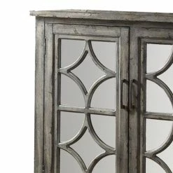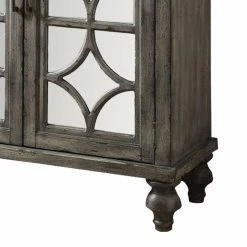 Offer an attractive, casual traditional storage space with the Benzara Accent Chest with 2 Doors. This cabinet is crafted from durable wood and perched on turned bun feet. A charcoal gray finish coats the wood and emphasizes its grain. A double-door cabinet is built into the face, opening to reveal an interior shelf. The doors are inset with polished mirrored panels and features a diamond design.