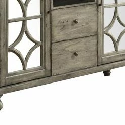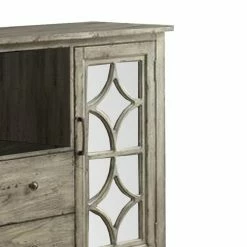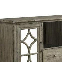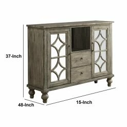 Provide a relaxed, classical feel to your room design with the Benzara Console Table with 2 Doors and 2 Drawers. This versatile console table features a wide top and open shelf for display. Two deep drawers and shelved side cabinets offer ample storage options. The frame is crafted from engineered wood with turned bun feet. A willow veneer and gray finish top the wood. Mirrored panels are inset in the doors, covered in a trellis slat design.