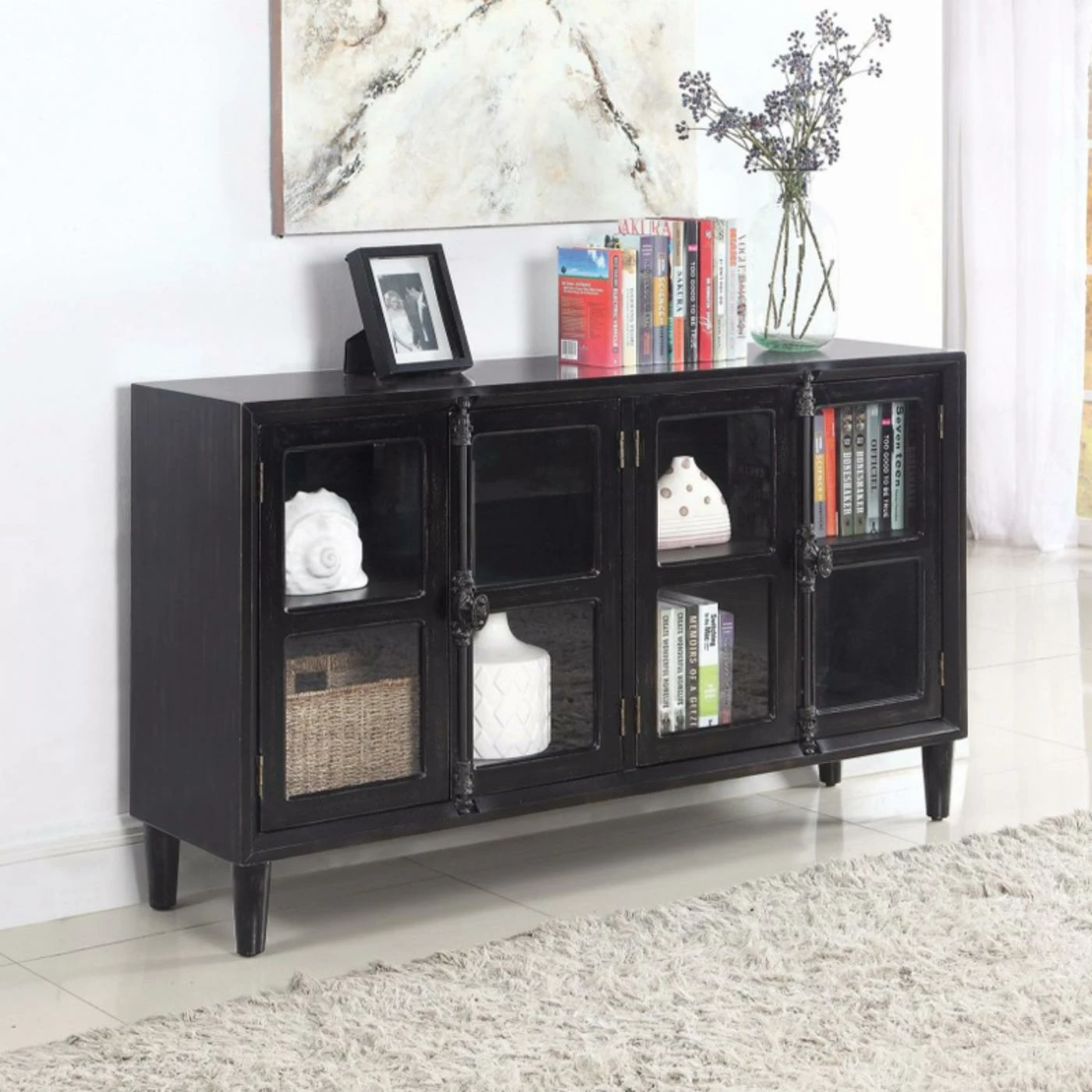 Intricate gothic details make the Benzara Traditional Wooden Accent Cabinet With Glass Doors a truly unique find. The distressed black finish conveys a timeworn feel. The pieces de resistance are the spindle-shaped door pulls with elaborate metal castings at the ends. Rosette-shaped knobs at center serve as handles. Glass doors showcase favorite books or other treasures while protecting against dust.
