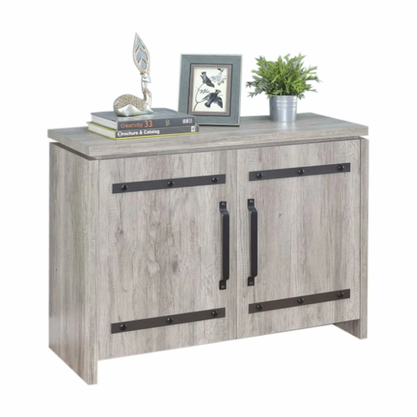 Add some warm, modern storage space into any area of your home with the Benzara Wood Accent Cabinet. This cabinet has a sharp modern profile built from solid wood with block legs. A light gray weathered finish accents the wood. The double-doors open to reveal an interior shelf to make the most of the space. Metal bar handles and riveted straps, both finished in black, lend an industrial touch to the design.