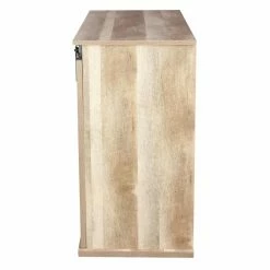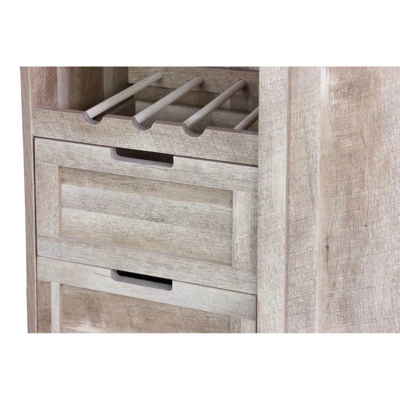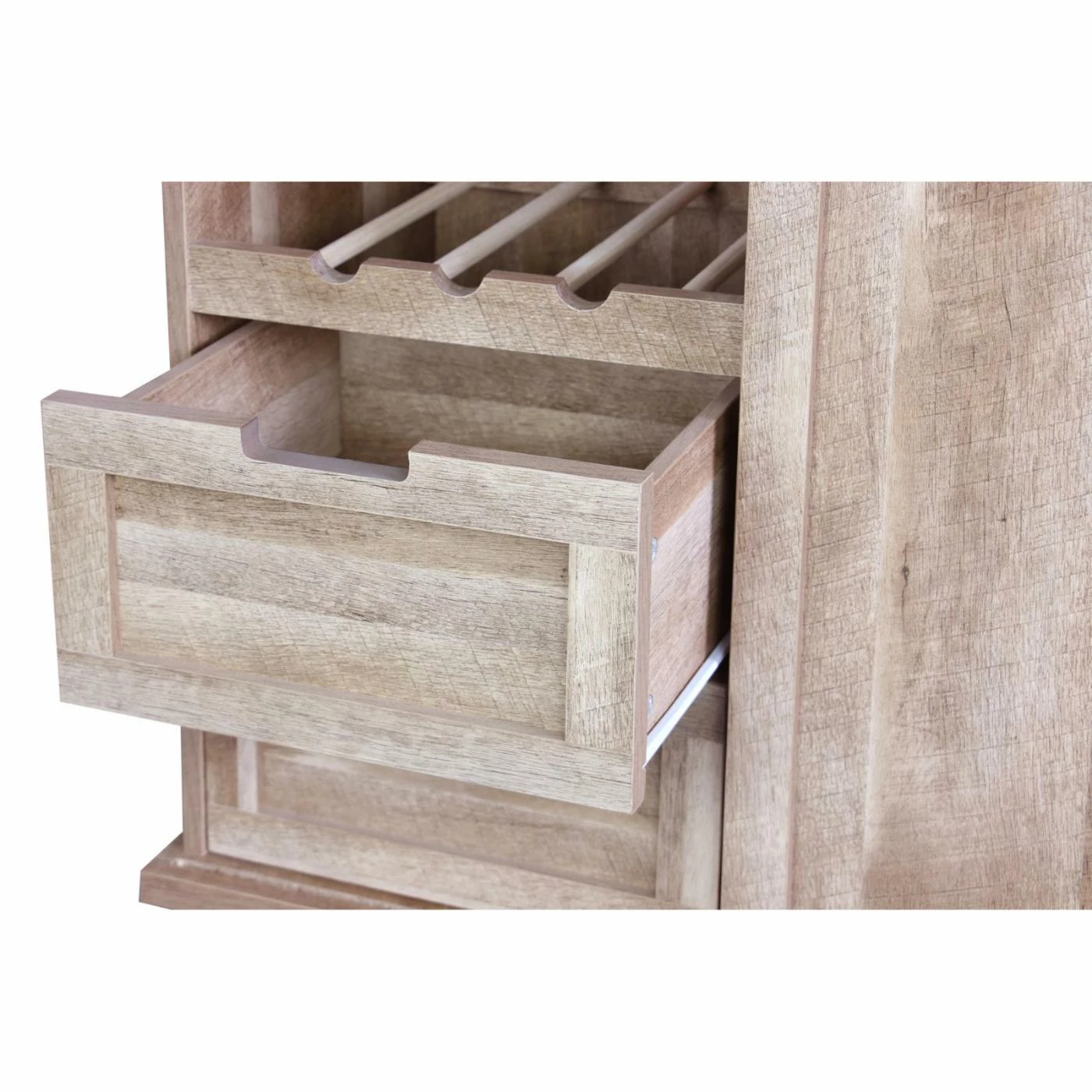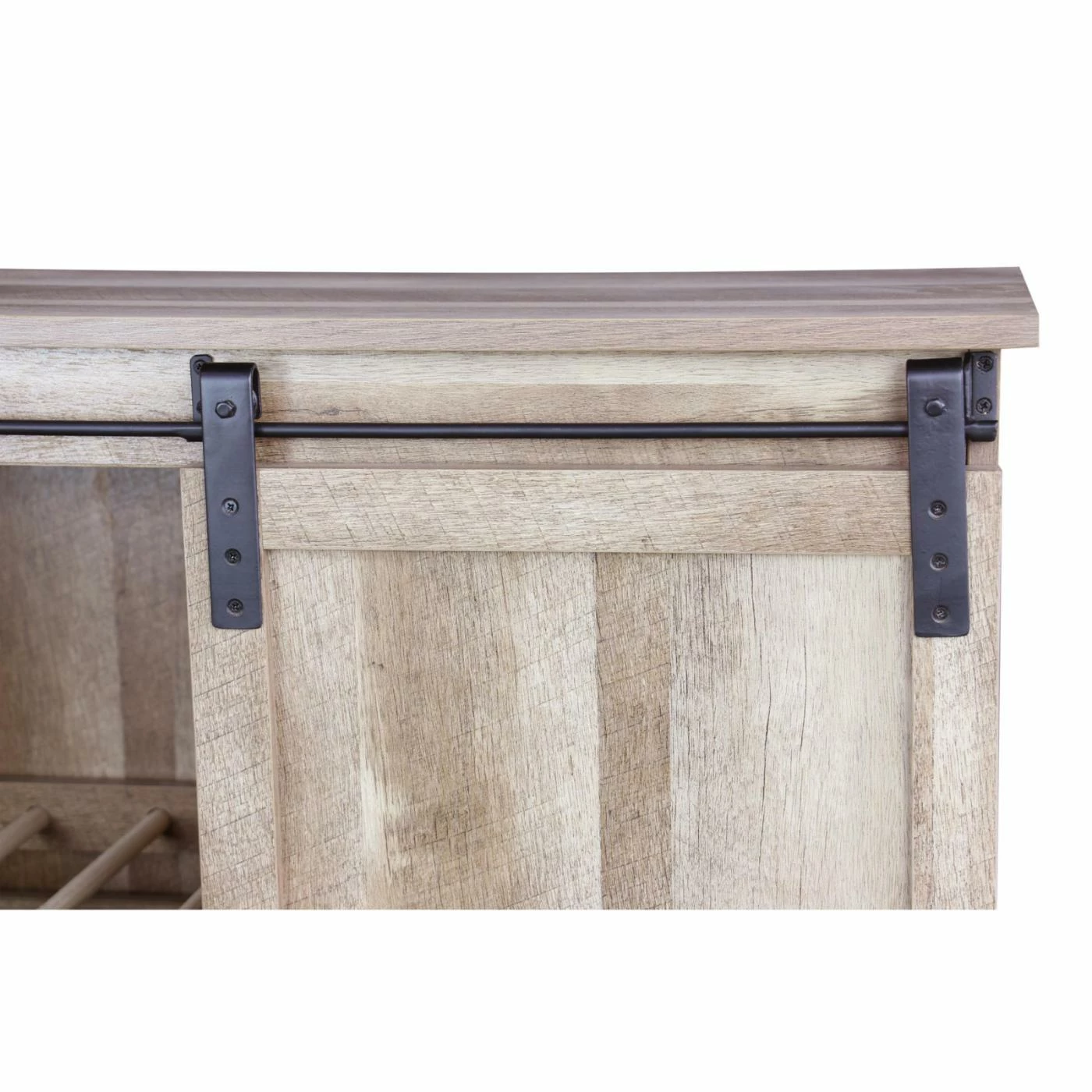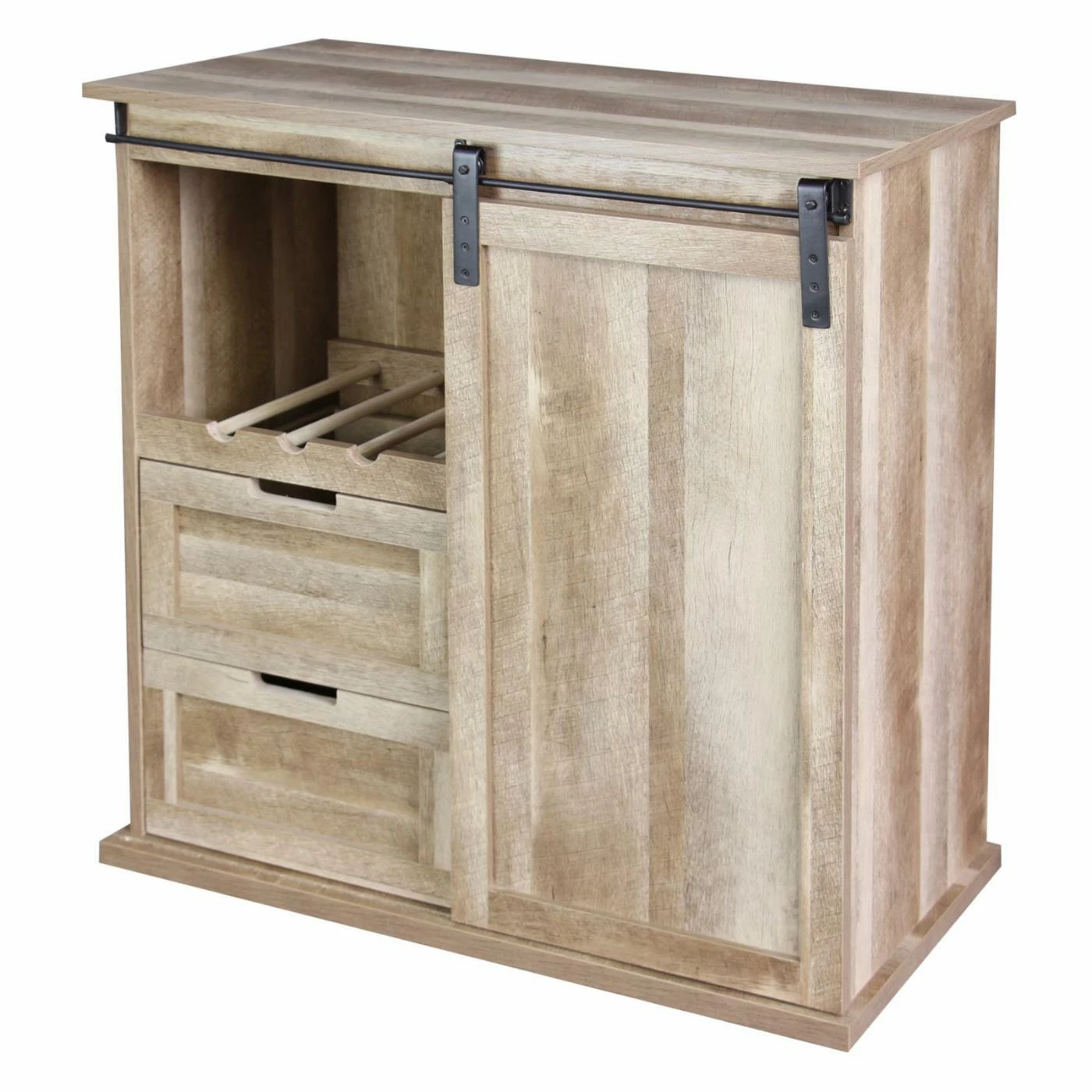 This Boraam Weston Sliding Barn Door Wine CabinetΒ is constructed with MDF, chipboard, and iron. It is available in a natural finish. This cabinet has one large sliding door that slides back and forth. Behind the sliding door is two cubbies and two drawers for storage and to put items. Ships ready to assemble.Β