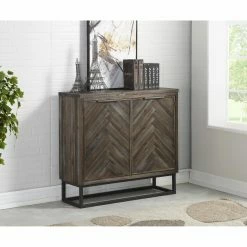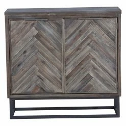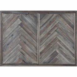 Dramatic chevron doors add detail to the Coast to Coast Aspen Court Two Door Cabinet. A weathered gray finish and open iron base give this cabinet its rustic, industrial vibe. The doors open to reveal interior shelving, making this cabinet as handy as it is handsome.