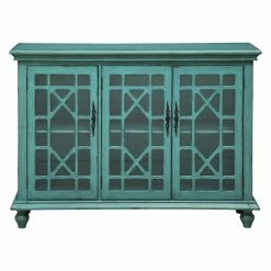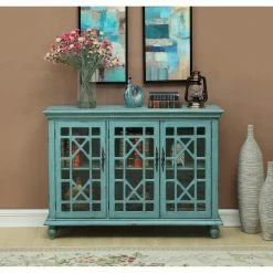 Brighten your home with the Coast to Coast Imports Three Door Media Console, which comes in a cheerful bayberry blue finish. Three doors feature a glass overlay, giving a peek of the storage space inside this piece. The interior includes two convenient shelves, along with access for cords and media cables.