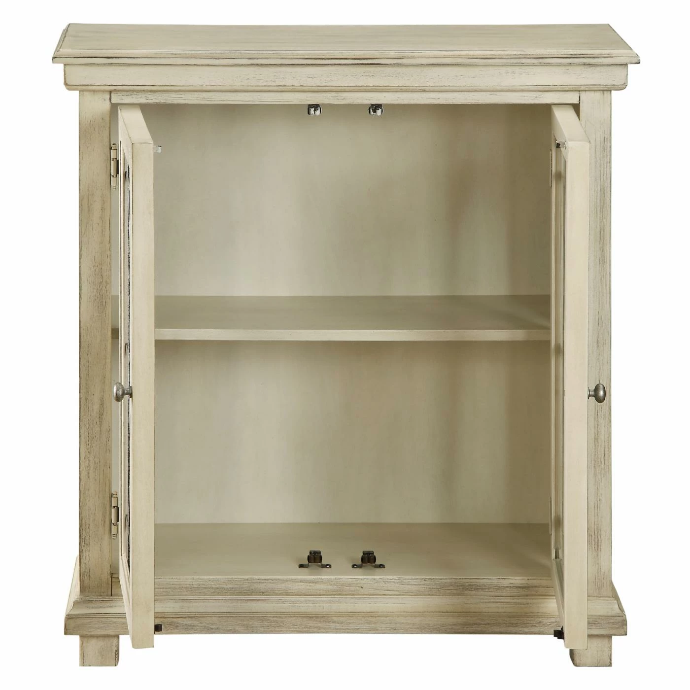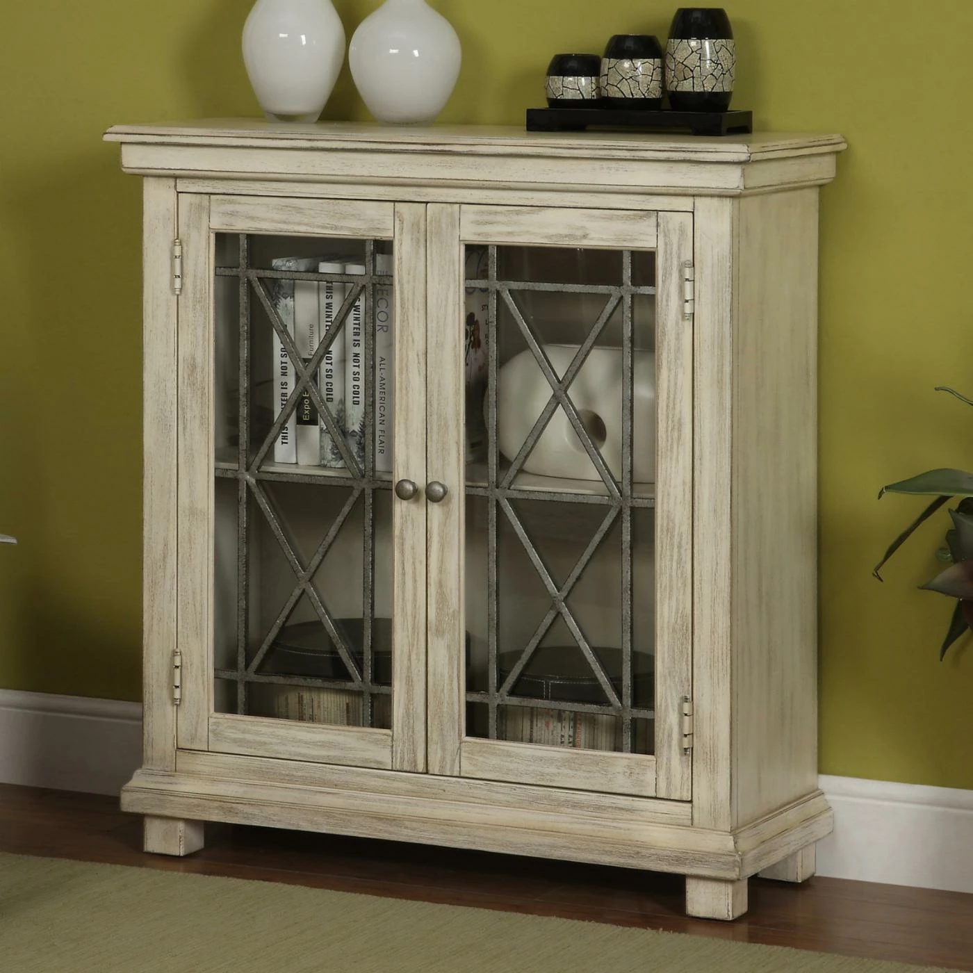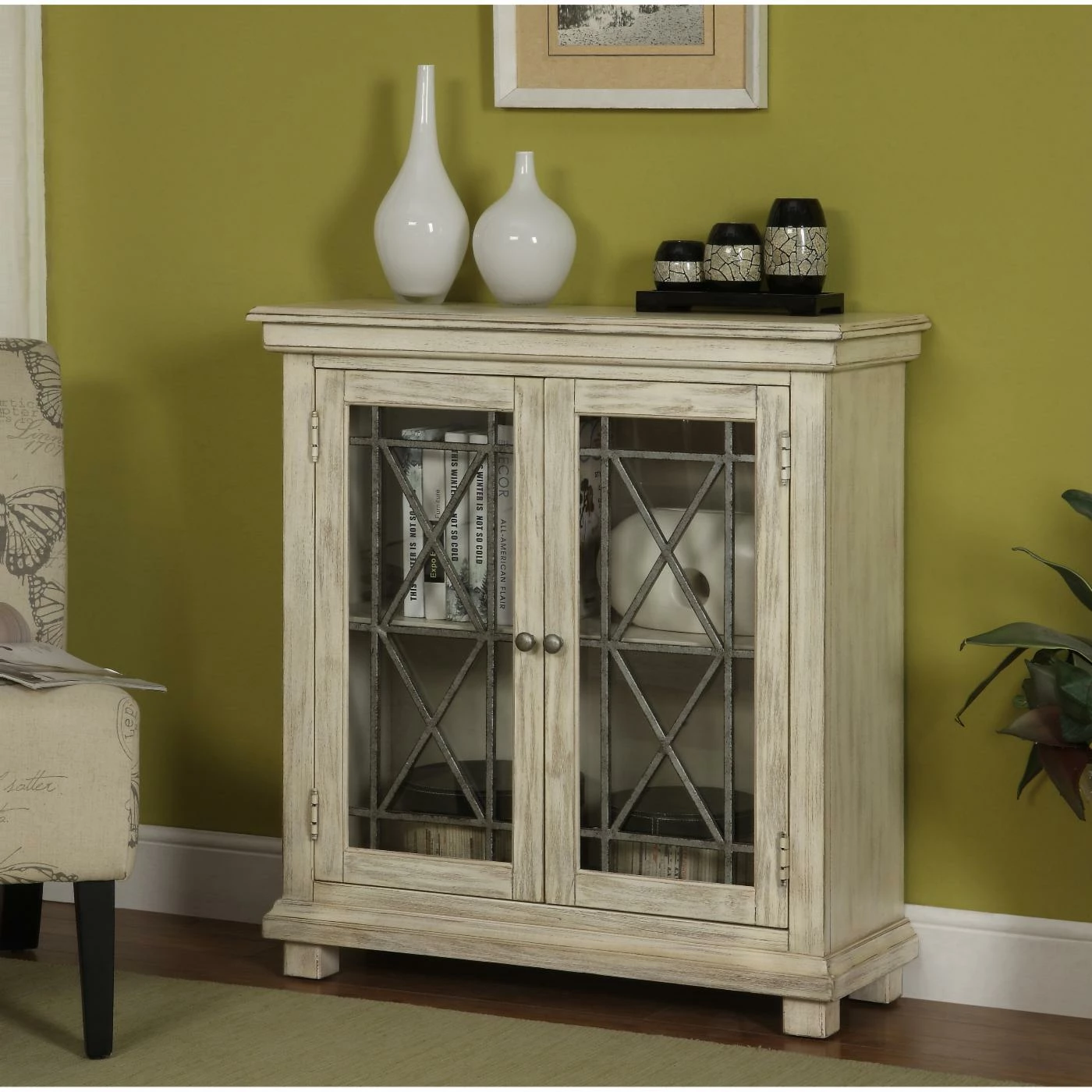 The Coast to Coast Knob Hill Ivory 2 Door Cabinet brings plenty of charm and appeal to your kitchen or dining area. The burnished ivory finish, decorative molding, and simple square feet add interest and character. A fixed shelf lines the interior and doubles the storage space. The two doors have glass panels and simple metal knobs, decorated with metal caning in a square-and-cross pattern.