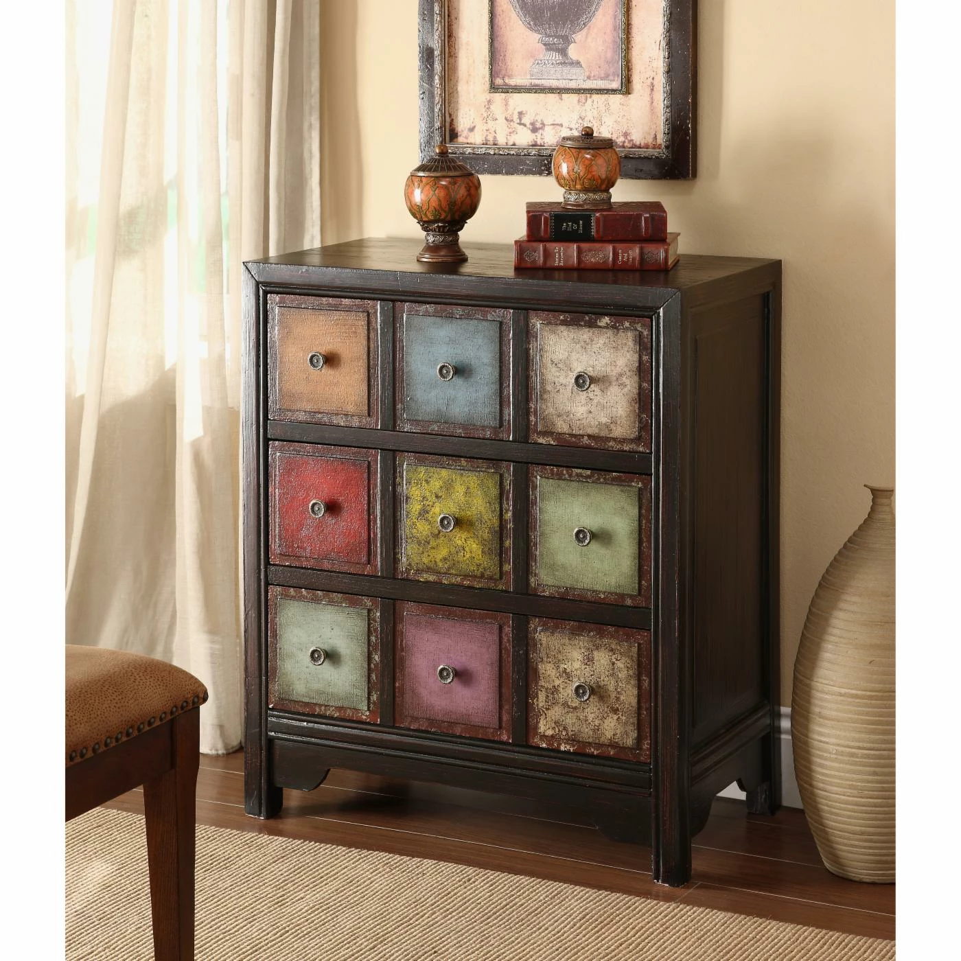 This Coast to Coast Multicolored 3 Drawer Chest makes a cheerful addition to any room. The three spacious drawers neatly organize and store clothes, books, and more. The hand-painted squares pop against the black frame and take center stage. Each beveled square features a metal drawer pull.