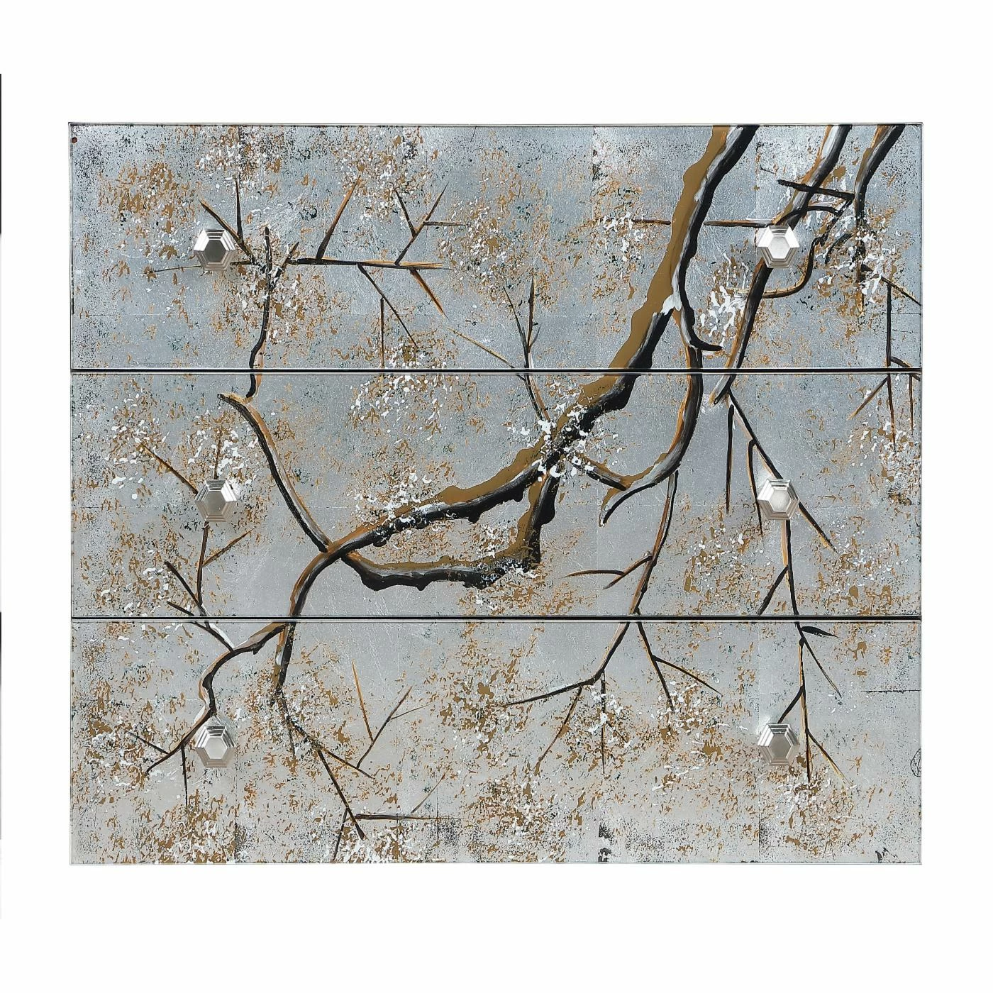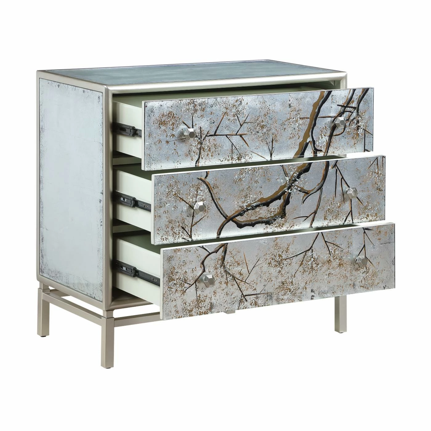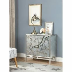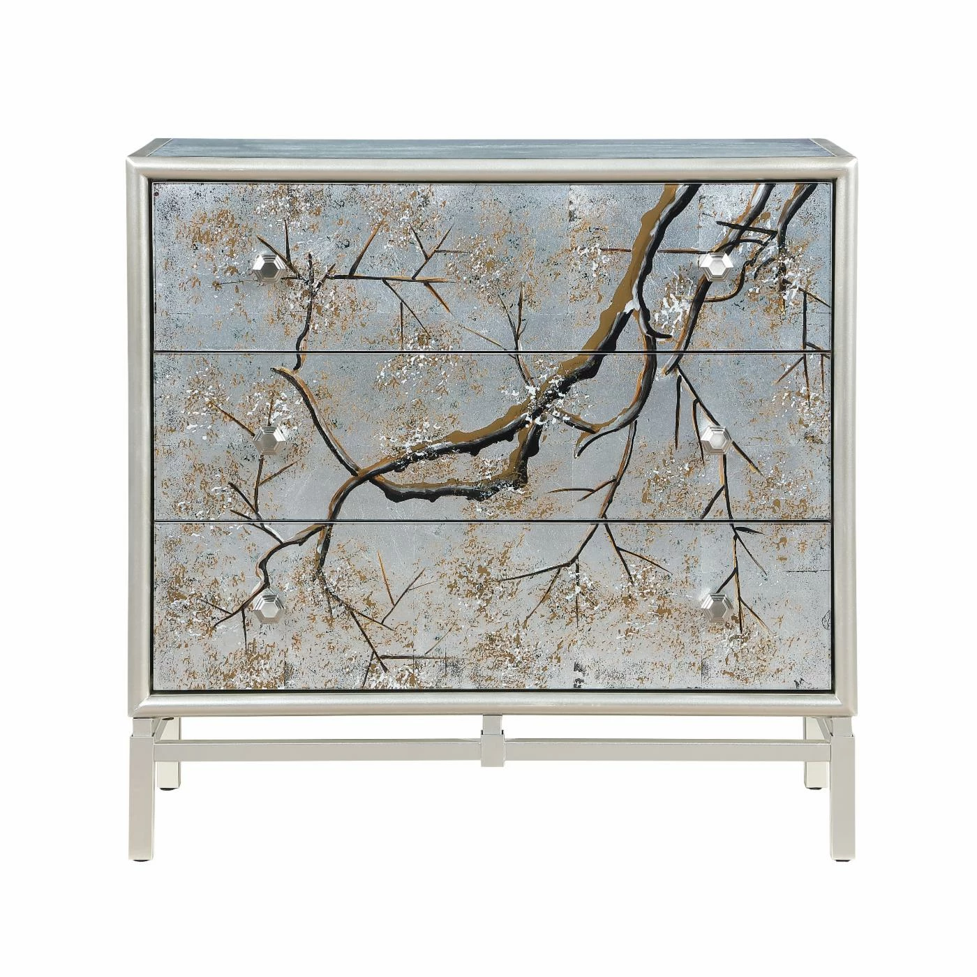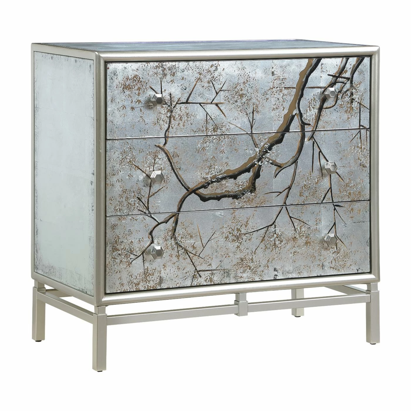 The Coast to Coast Silvermist Accent Chest is full of shimmer with some artistic detail. This elegant, glamorous accent chest features three spacious drawers with reverse-painted glass fronts. A beautiful tree branch crawls across the front of the accent chest and complements the silver leaf finish. Put this showstopper in your modern bedroom or glam living room.