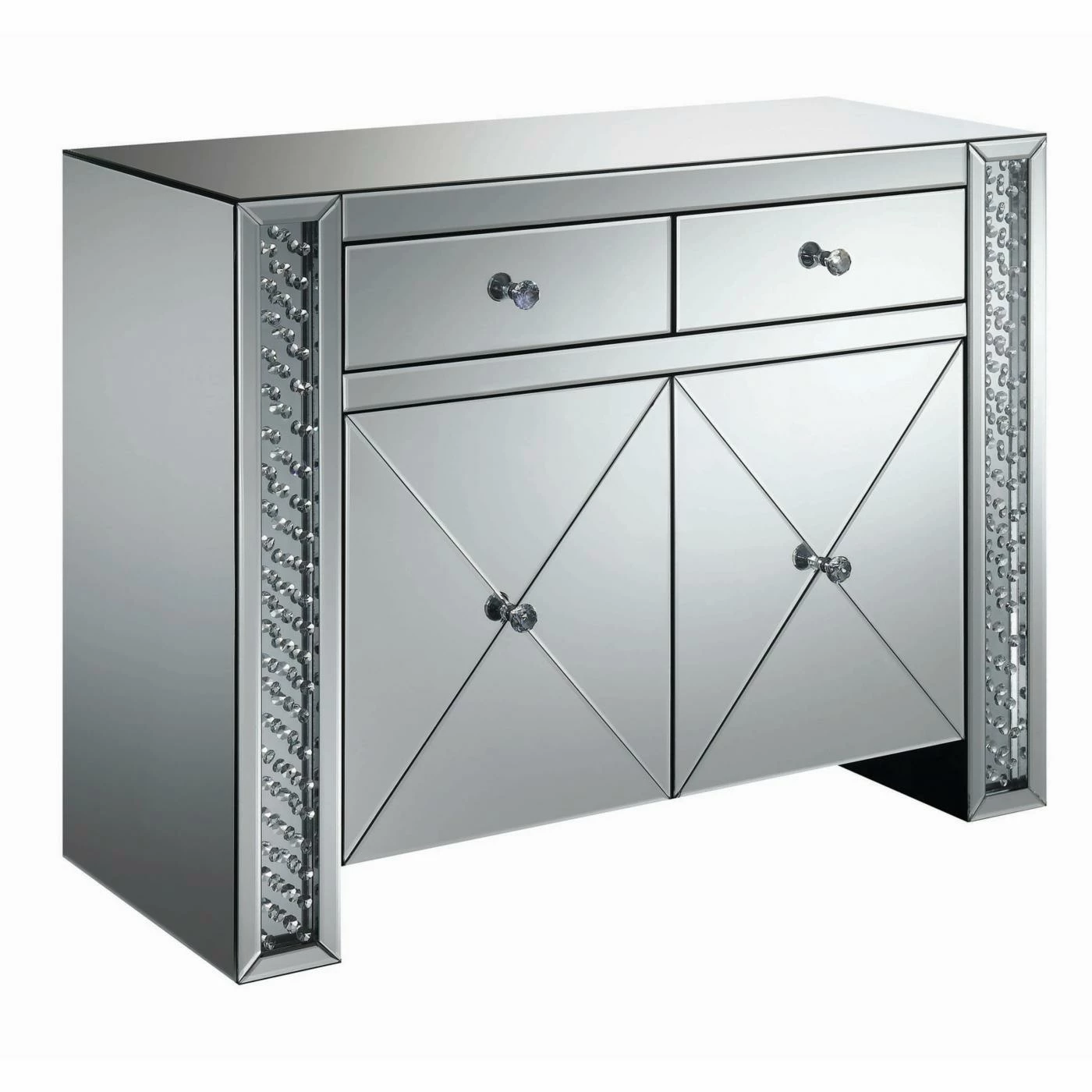 The Coaster Furniture Silver Crystal Mirrored Geometric 2 Drawer Accent Cabinet looks at home next to glam accents like faux fur and crystal lighting or surrounded by industrial accents and dark-finished metals. This accent cabinet features all mirrored surfaces and crystal-like accents on the front for a look that stands out. Two cabinet doors with X-shaped etching and two drawers have crystal knobs and offer plenty of concealed storage. Add some glam to a wall in your bedroom or in your modern living space.