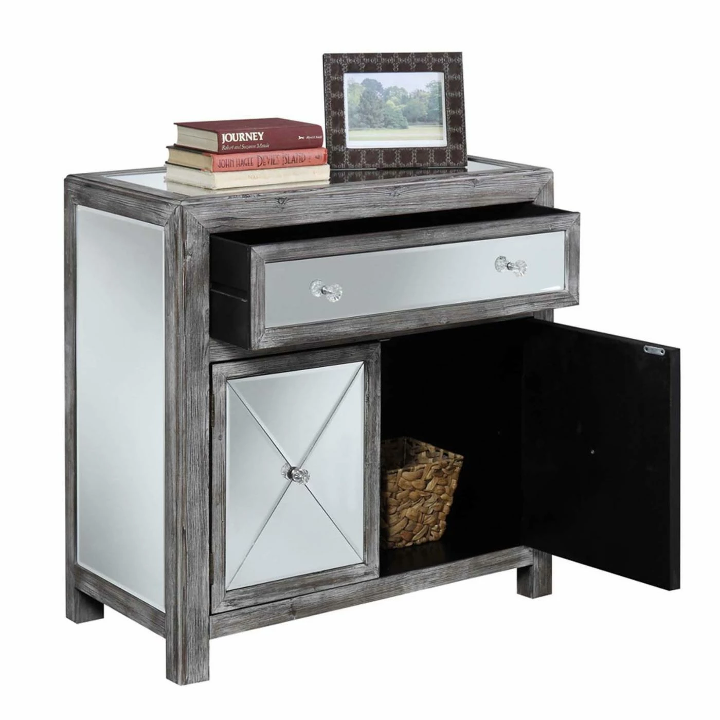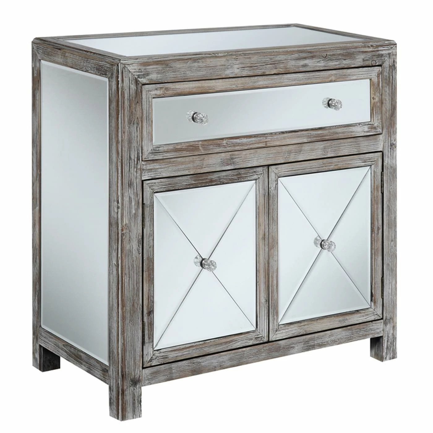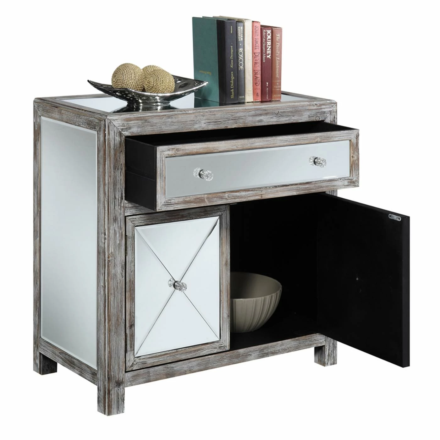 The Convenience Concepts Gold Coast Vineyard Mirrored Cabinet is a definite show-stopper with sleek mirrored panels on the front and sides. This amazingly bright and reflective cabinet includes a large center drawer and two bottom cabinet doors that open to give you plenty of storage. The fir wood frame comes in your choice of weathered finish to create a customized look with a glamorous edge.