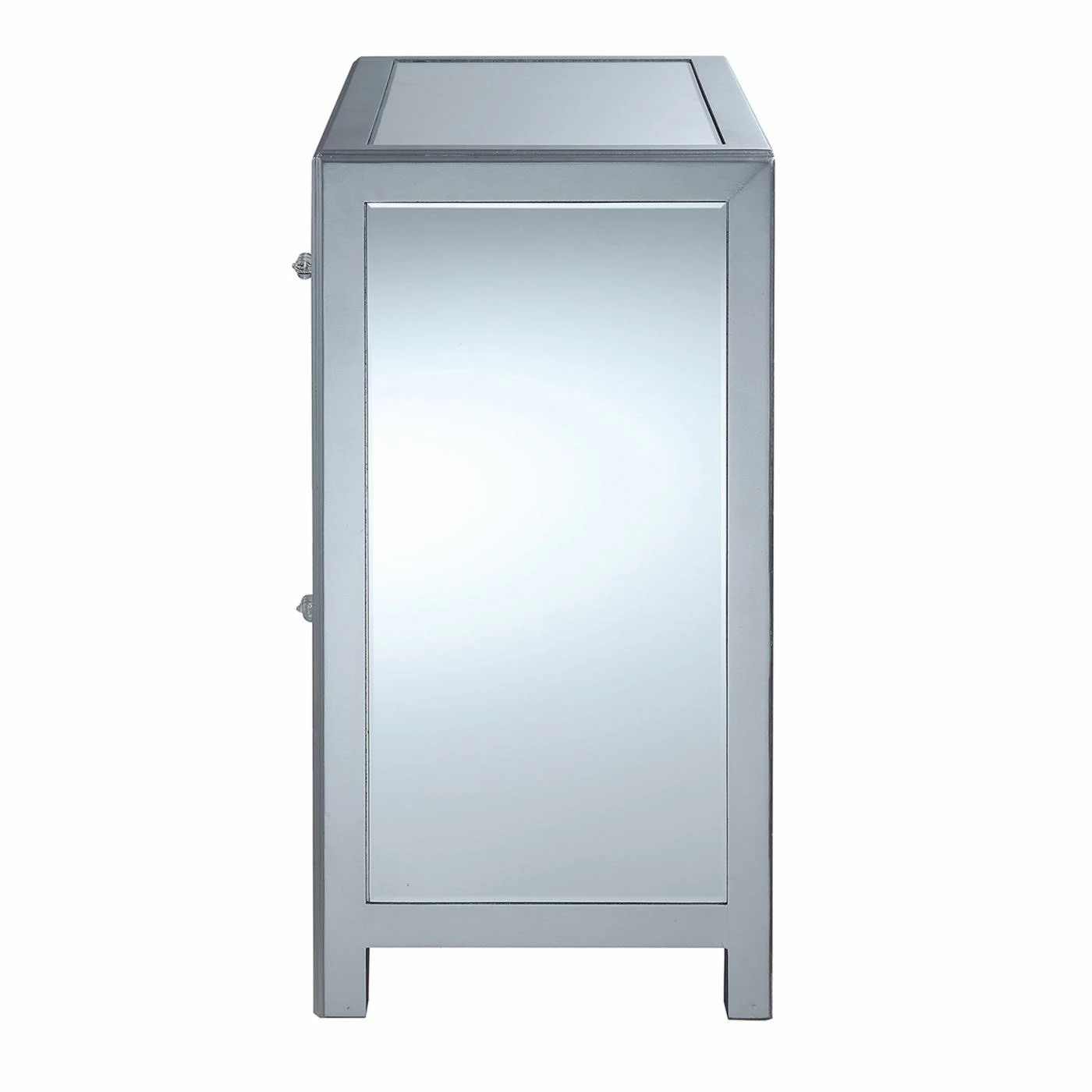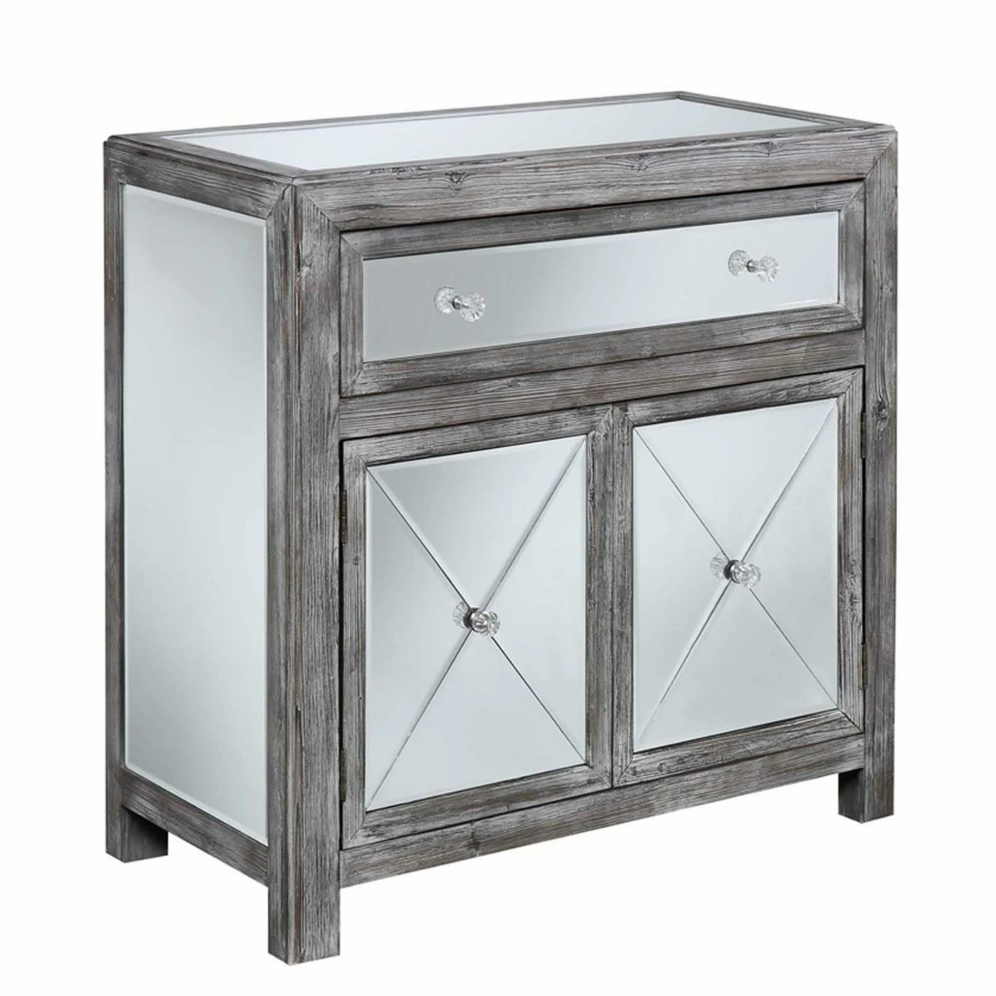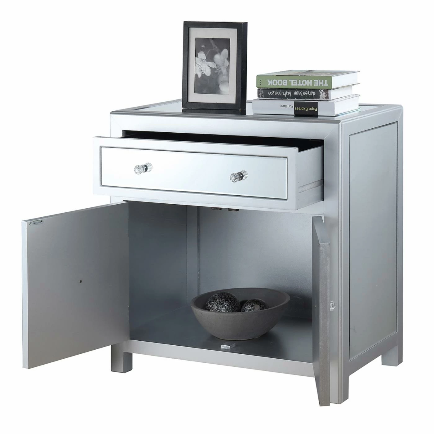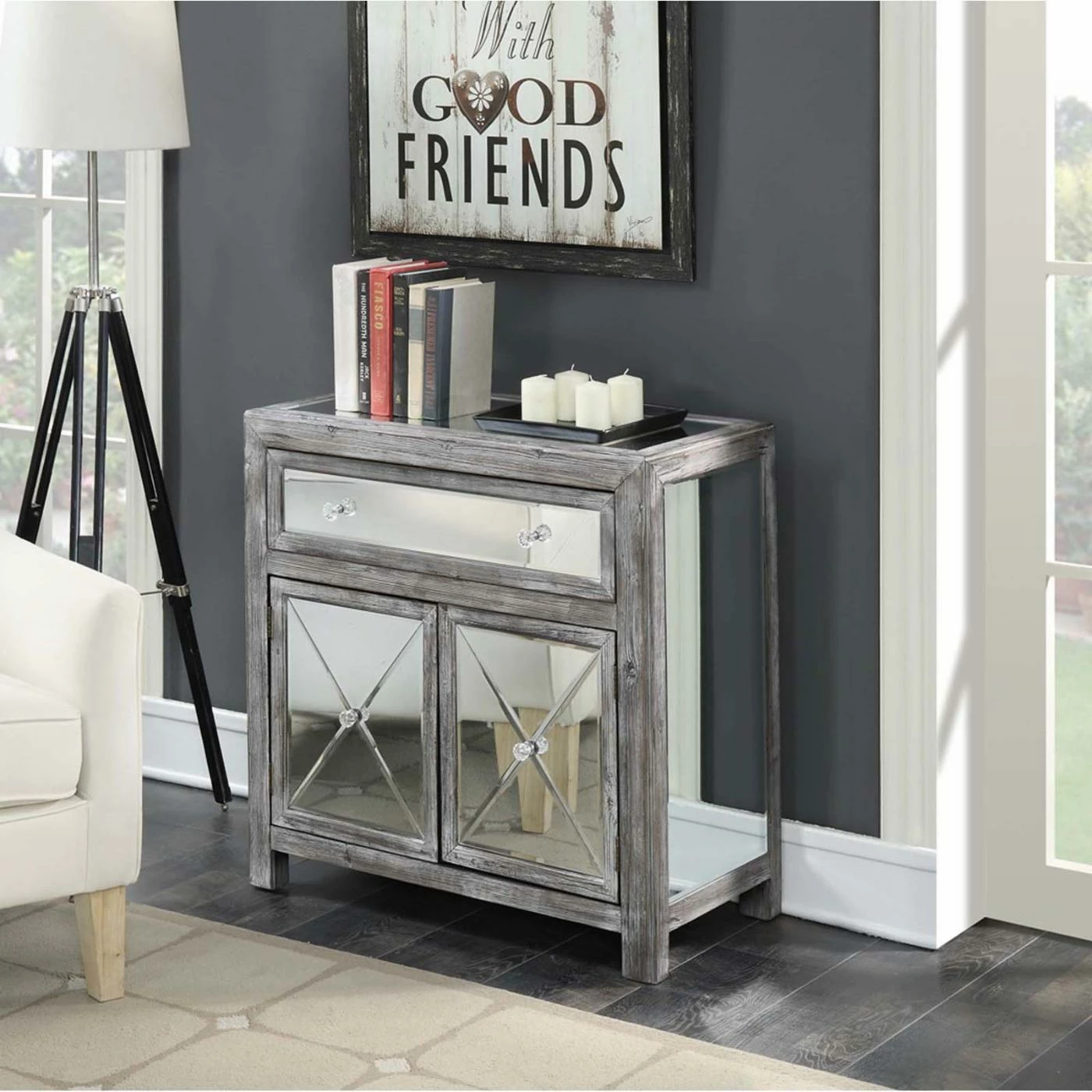 The Convenience Concepts Gold Coast Vineyard Mirrored Cabinet is a definite show-stopper with sleek mirrored panels on the front and sides. This amazingly bright and reflective cabinet includes a large center drawer and two bottom cabinet doors that open to give you plenty of storage. The fir wood frame comes in your choice of weathered finish to create a customized look with a glamorous edge.