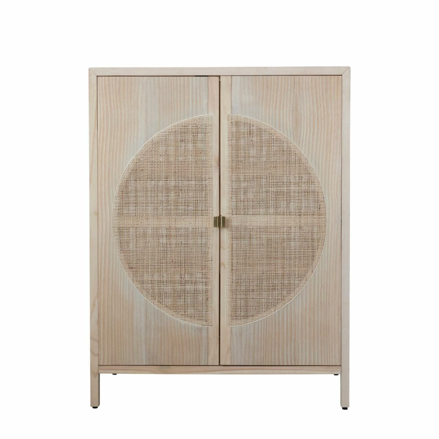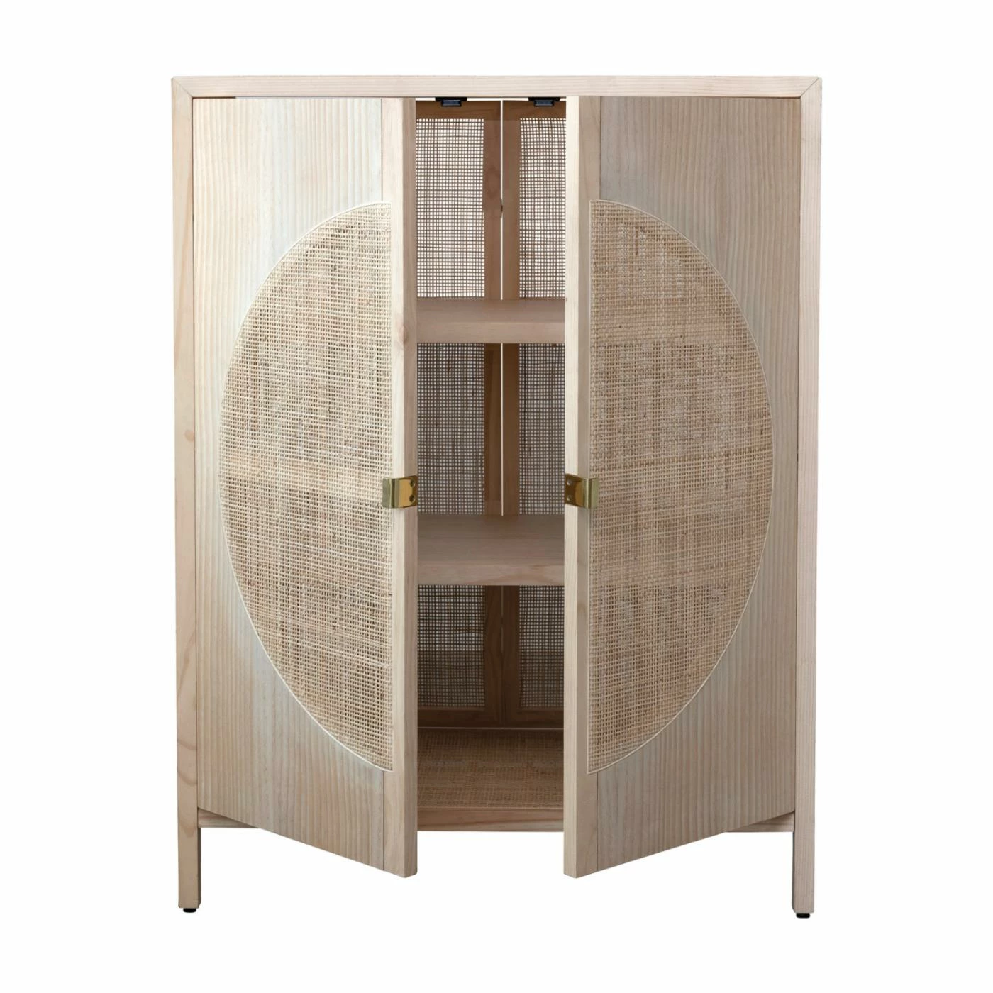 Beige pine wood cabinet with 2 doors, 2 shelves, and caning. Display treasured memories or decorative accents atop this stunning cabinet. Made from pine wood, webbing, and sustainable MDF. Curate a space that reflects your unique sense of style with intentionally designed home décor.