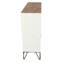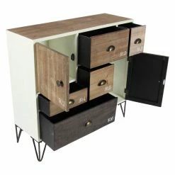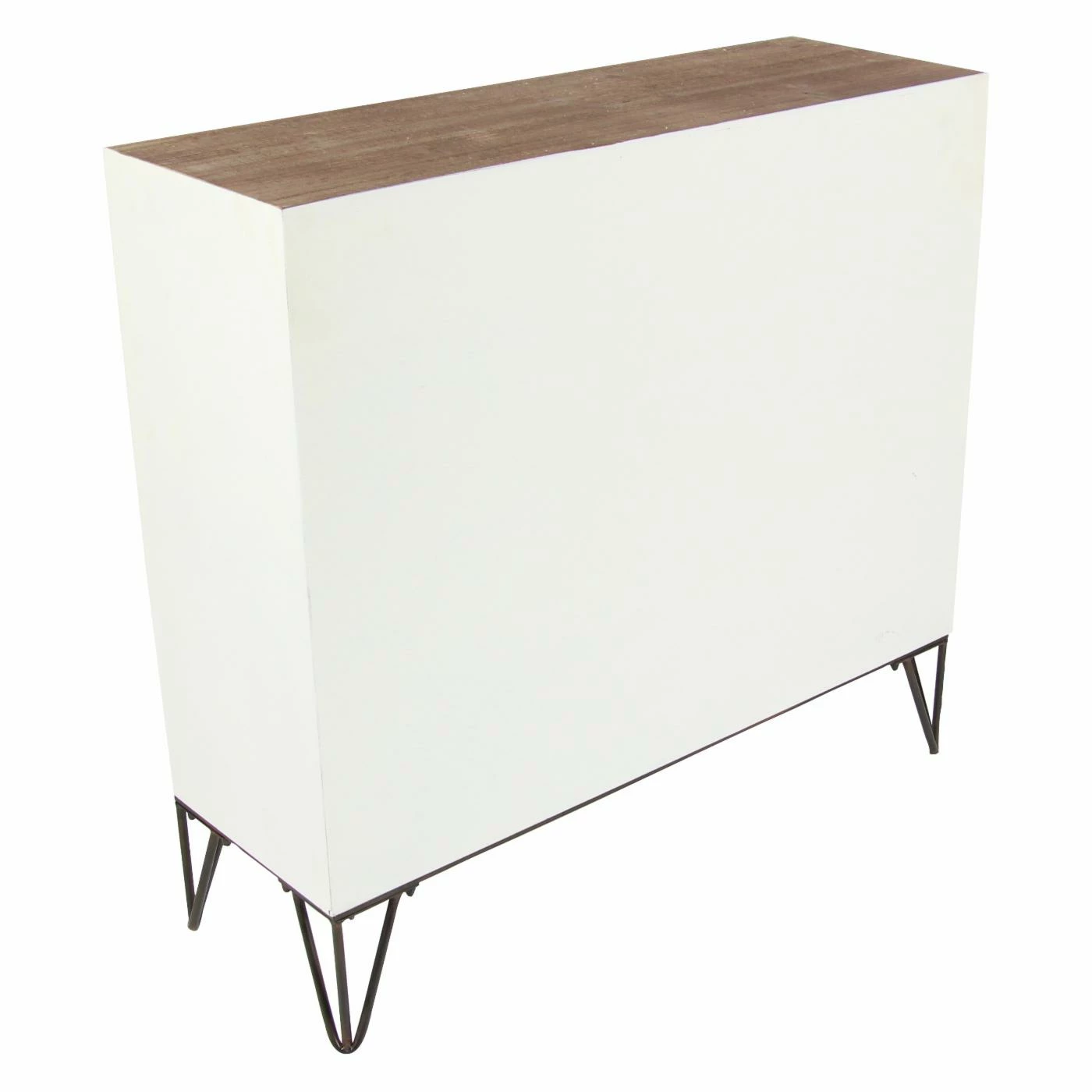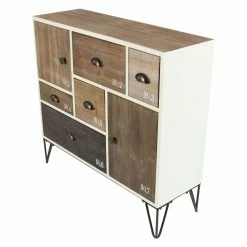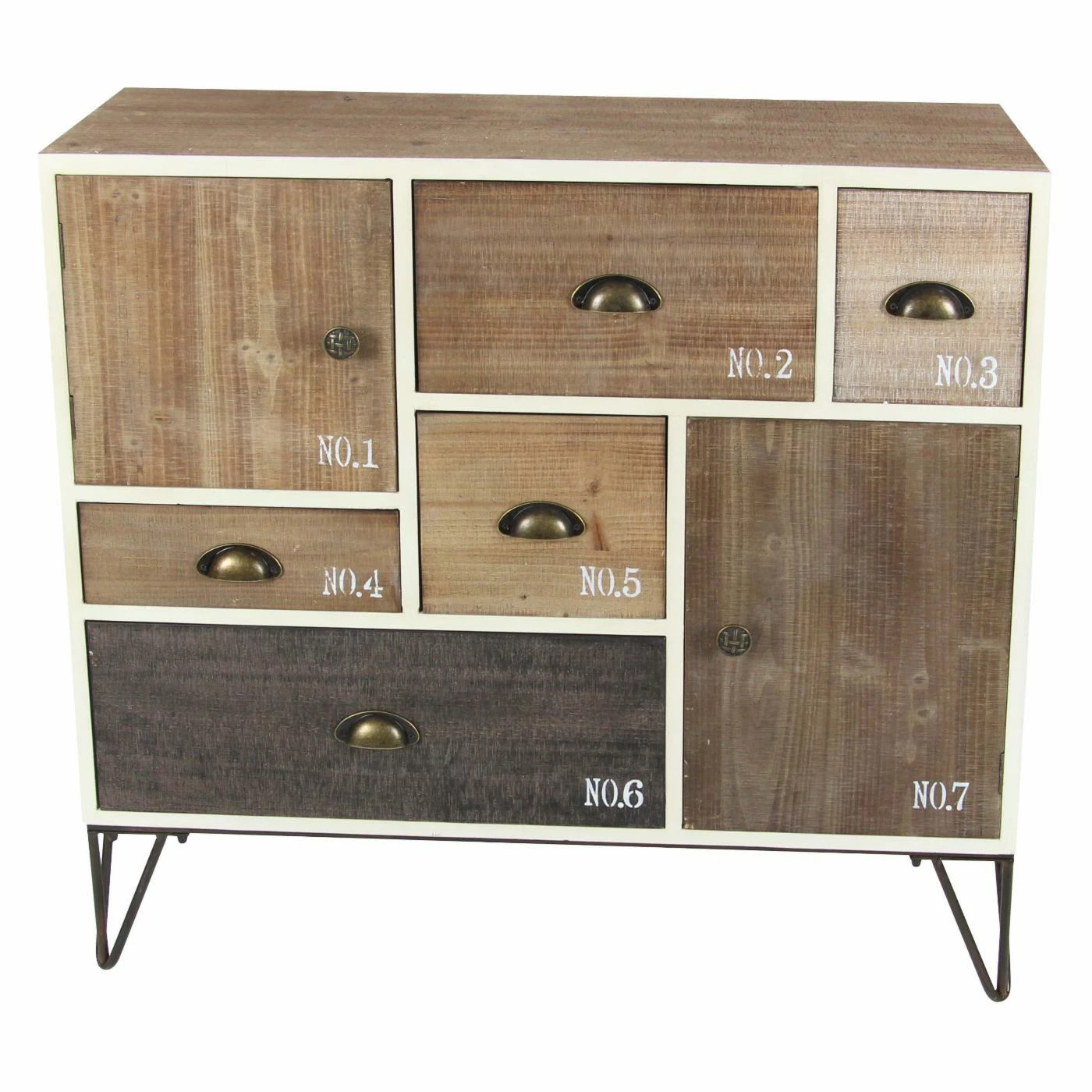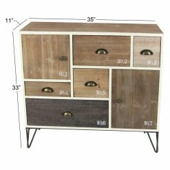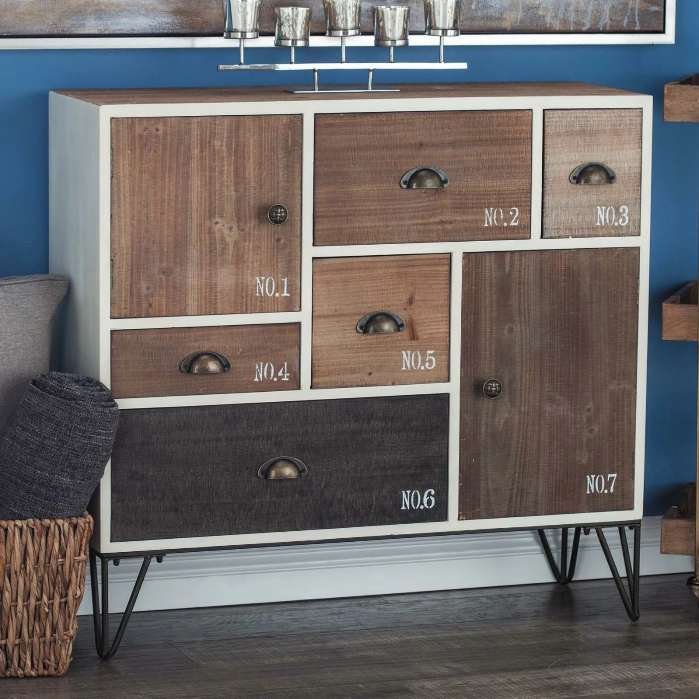 Stenciled with numbers, the DecMode 7-Drawer Stencil-Marked Wooden Cabinet resembles a storage solution one would expect to find in an office or factory. The industrial engineered wood cabinet provides plenty of storage space with five drawers and two doors in varying sizes. Iron hairpin legs add a touch of retro appeal and provide sturdy support.