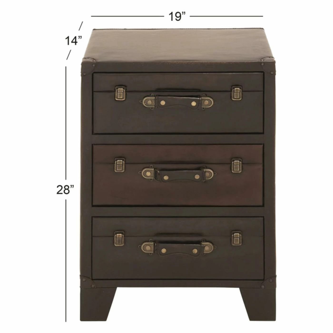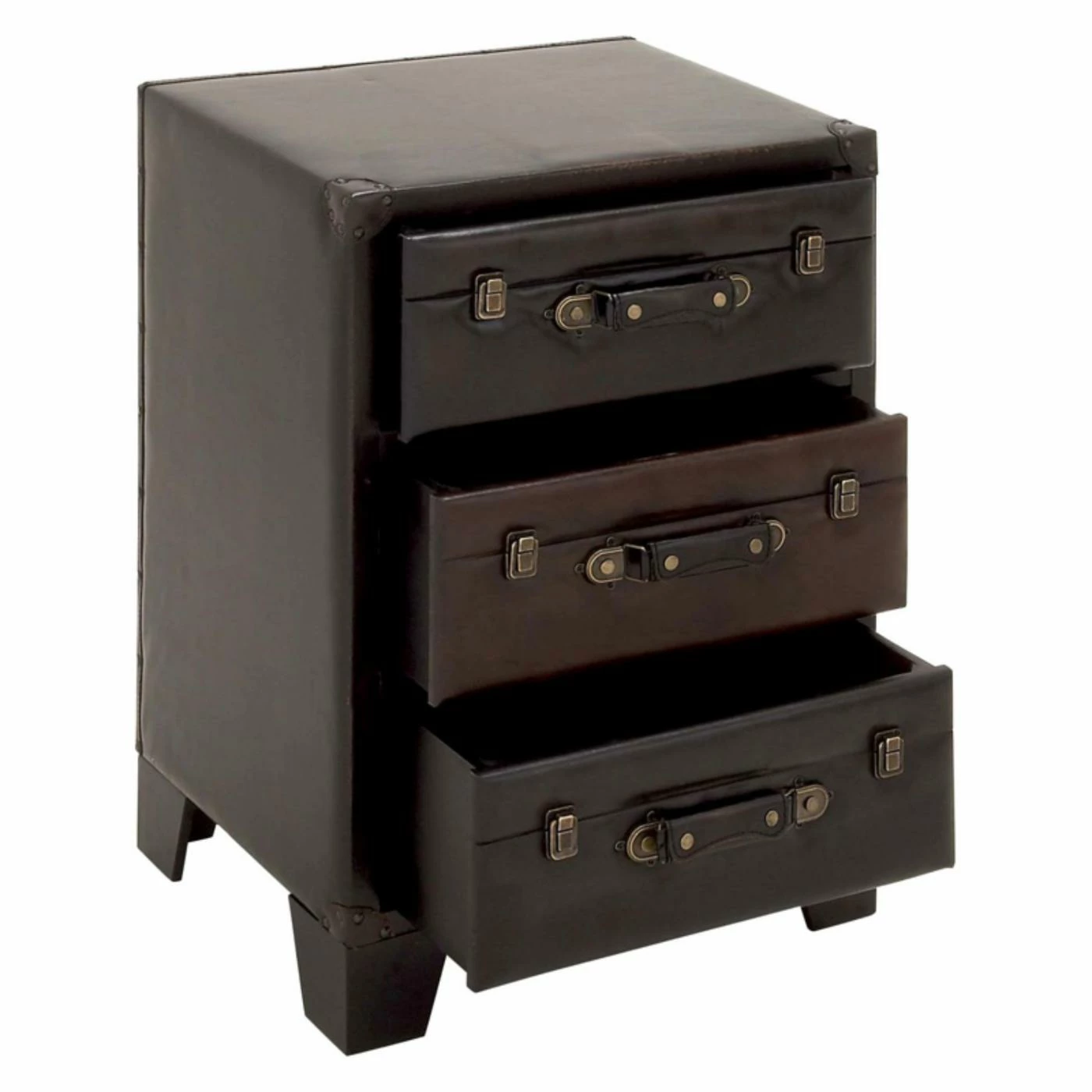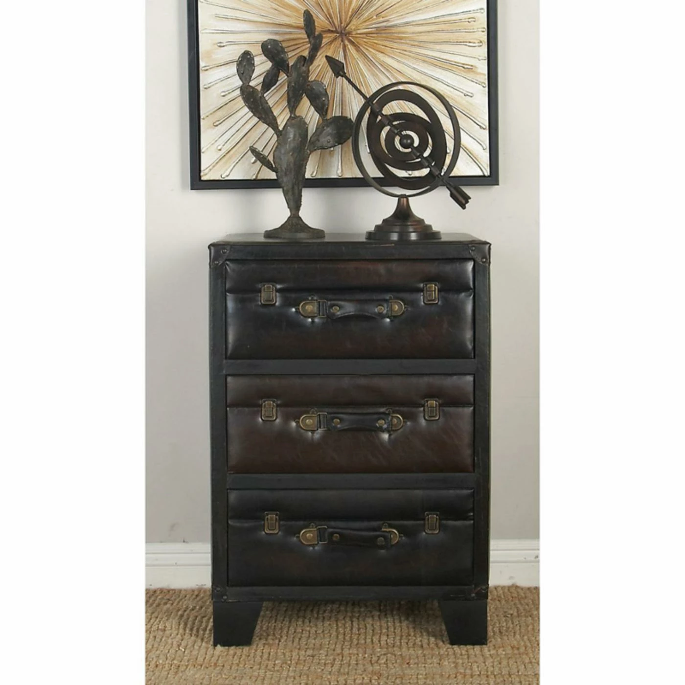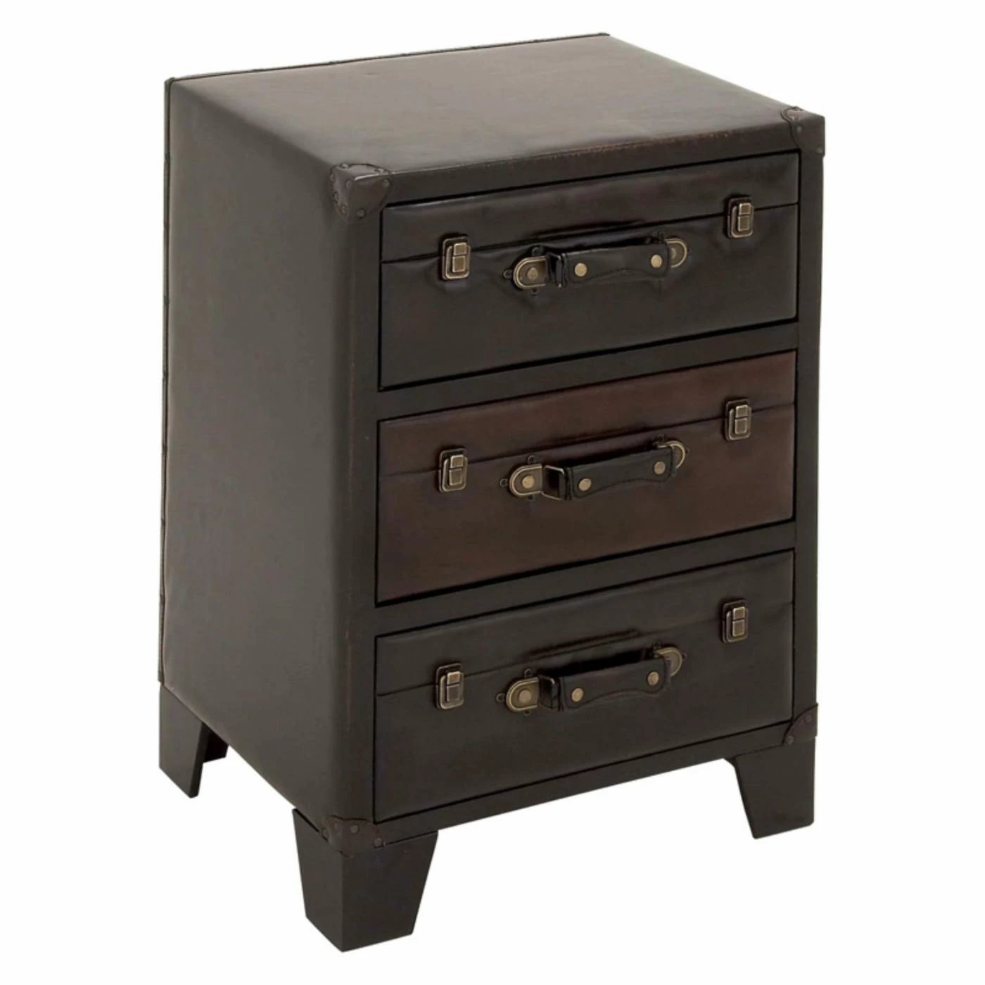 Dark espresso faux leather and decorative strap and edge embellishments give the DecMode Decorative Chest with 3 Drawers its vintage appeal. This decorative chest includes three drawers for stylish storage.