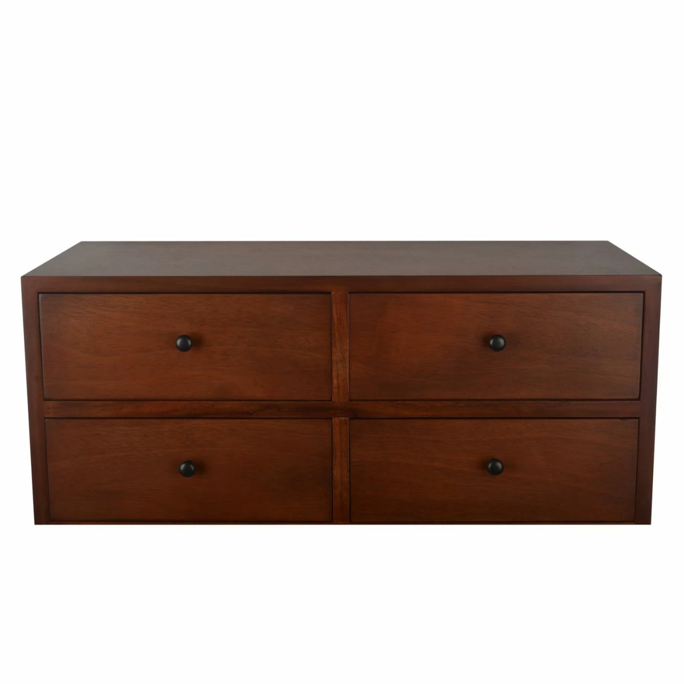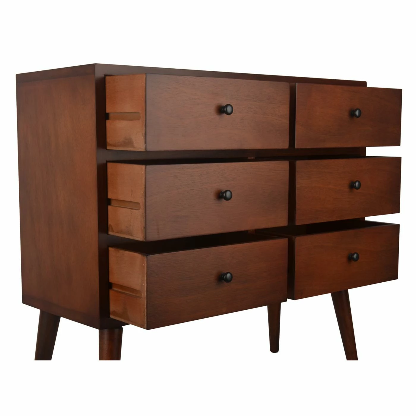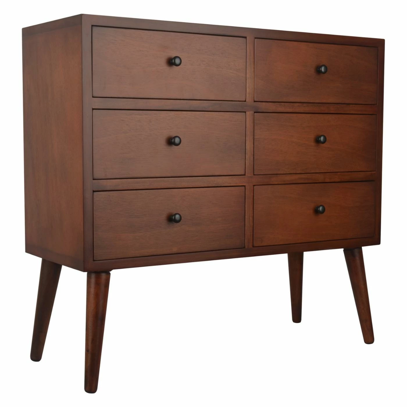 Like you, this Decor Therapy Mid Century 6 Drawer Accent Chest End Table is inspired by mid-century furniture design. Long, tapering wood post legs plus a simple case give this accent table is mid-century look. Six side-by-side drawers and a versatile light walnut finish make it perfect as a hall chest or in the bedroom.