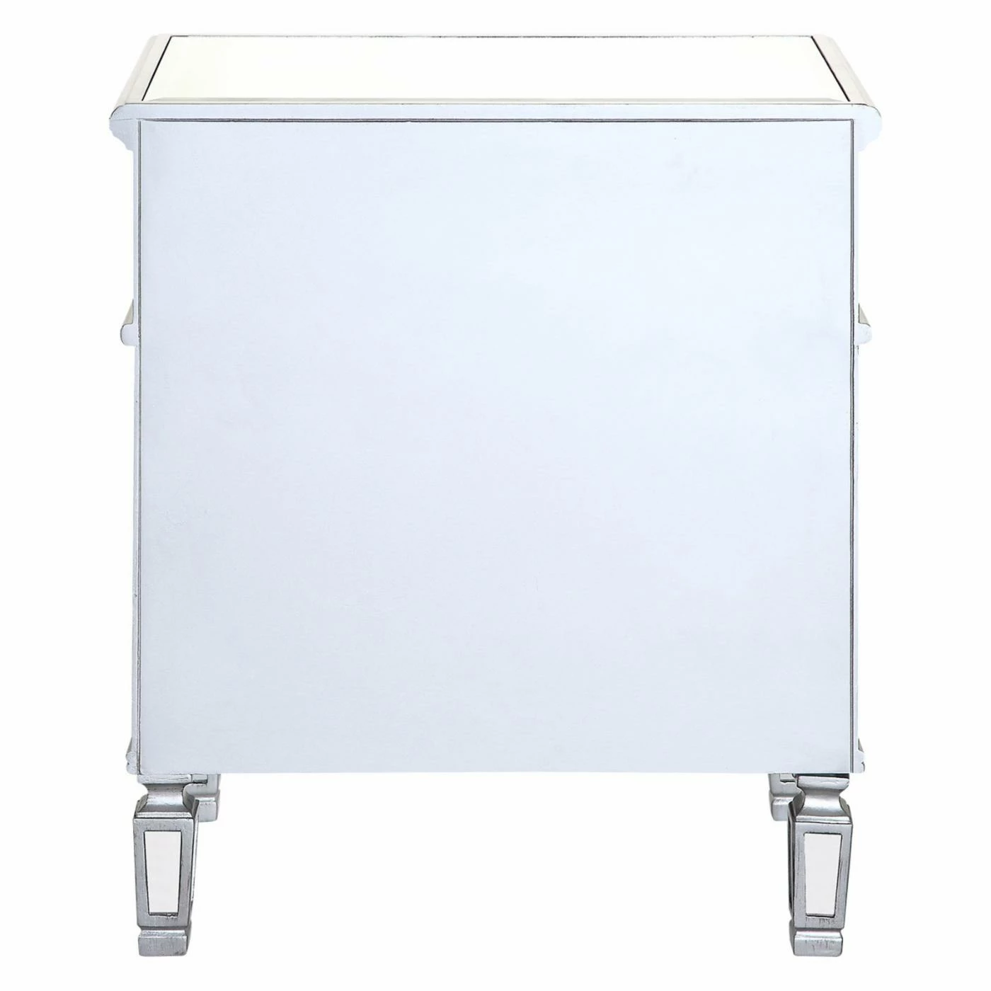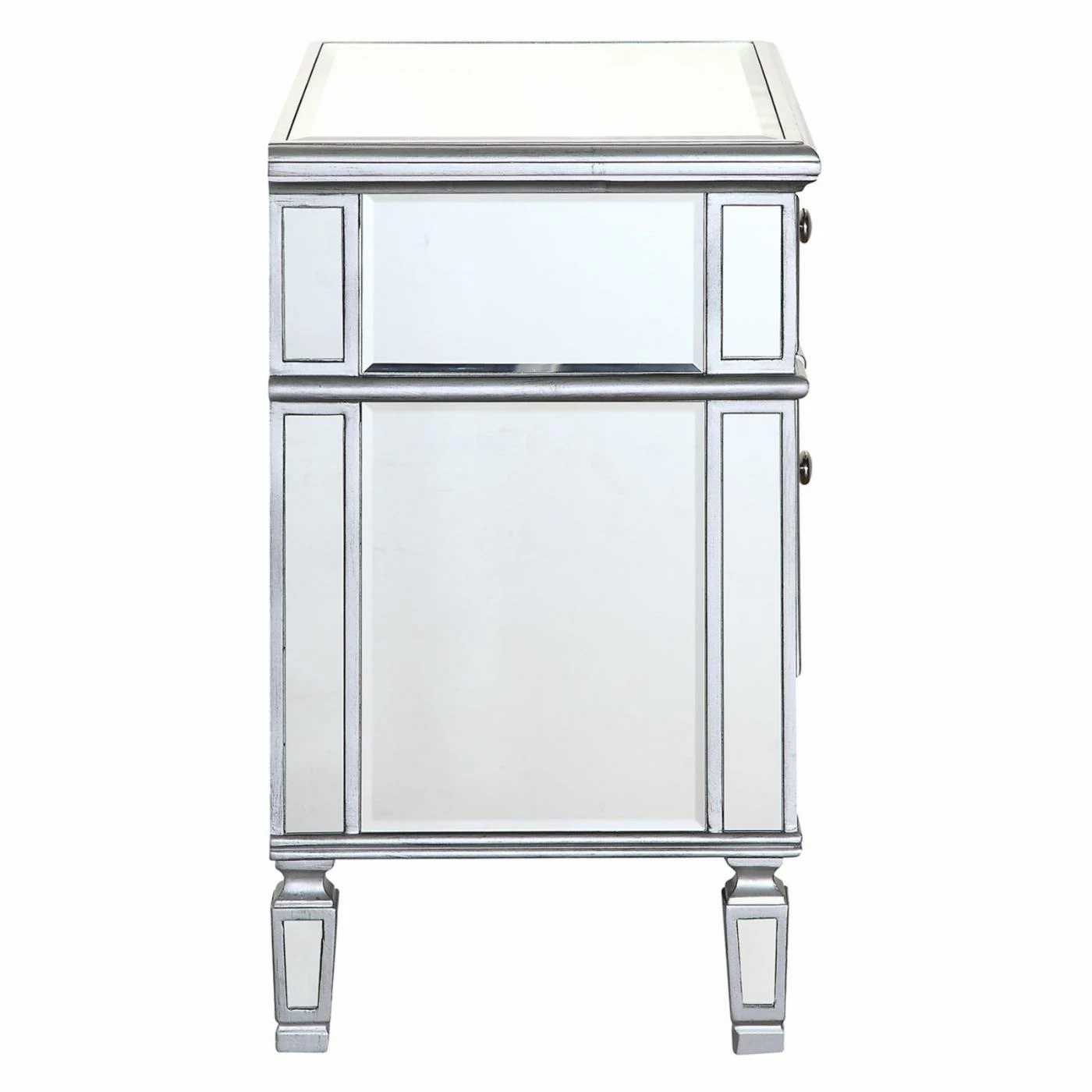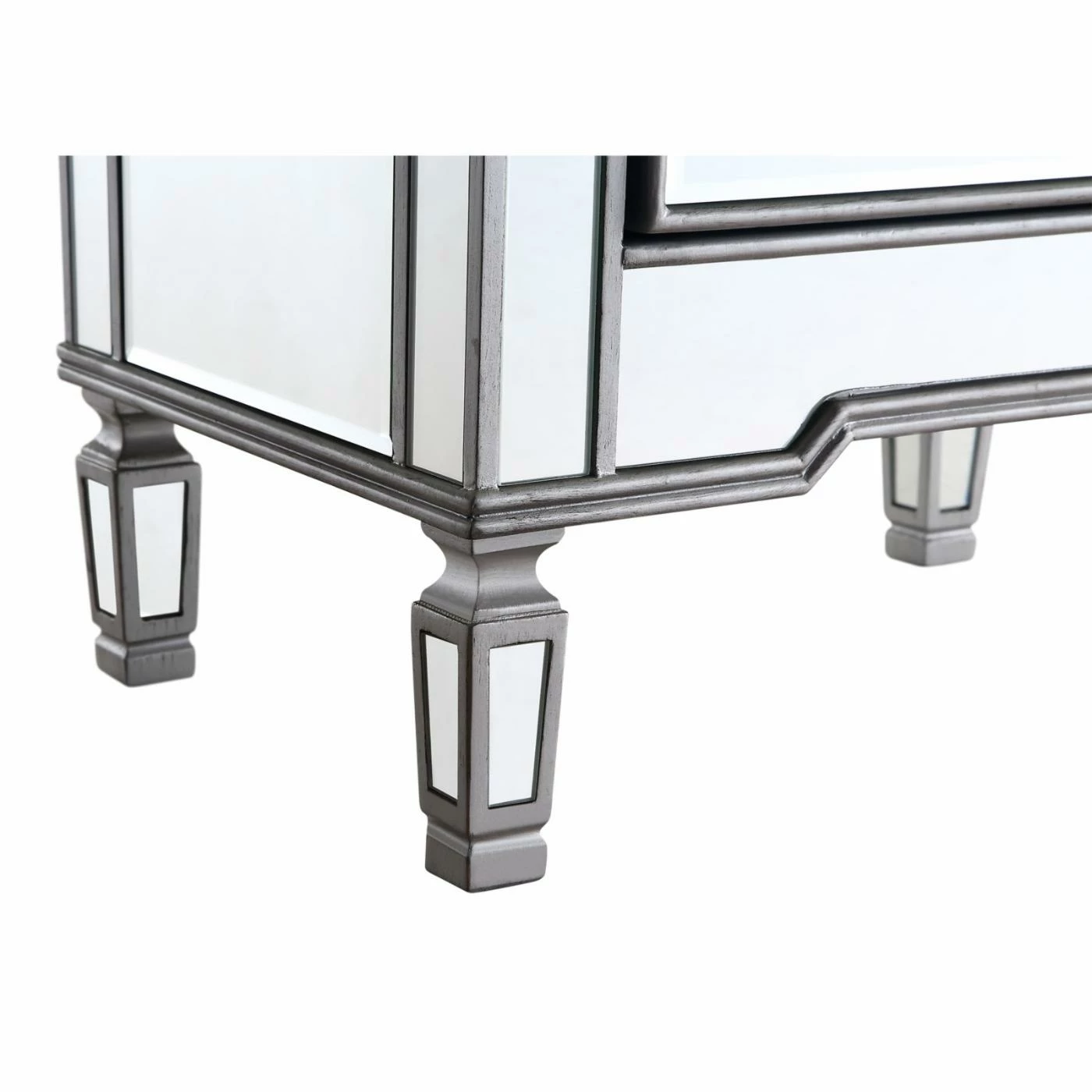 The Elegant Decor 1 Door Living Room Decorative Chest provides opulence and storage space to your living room, bedroom, or bathroom. This sophisticated chest features mirrored panels over a wood frame. The hand-rubbed silver finish and brushed steel knobs create upscale appeal. Stow away all of your essentials in the two drawers.