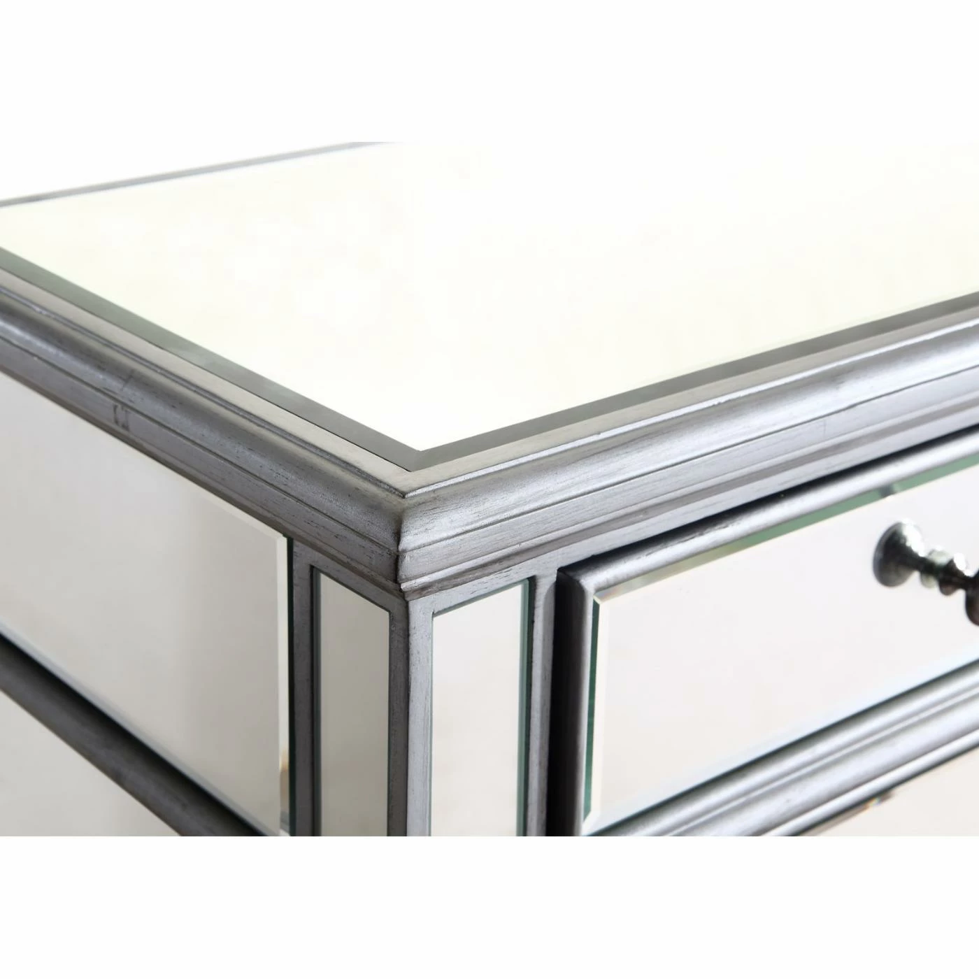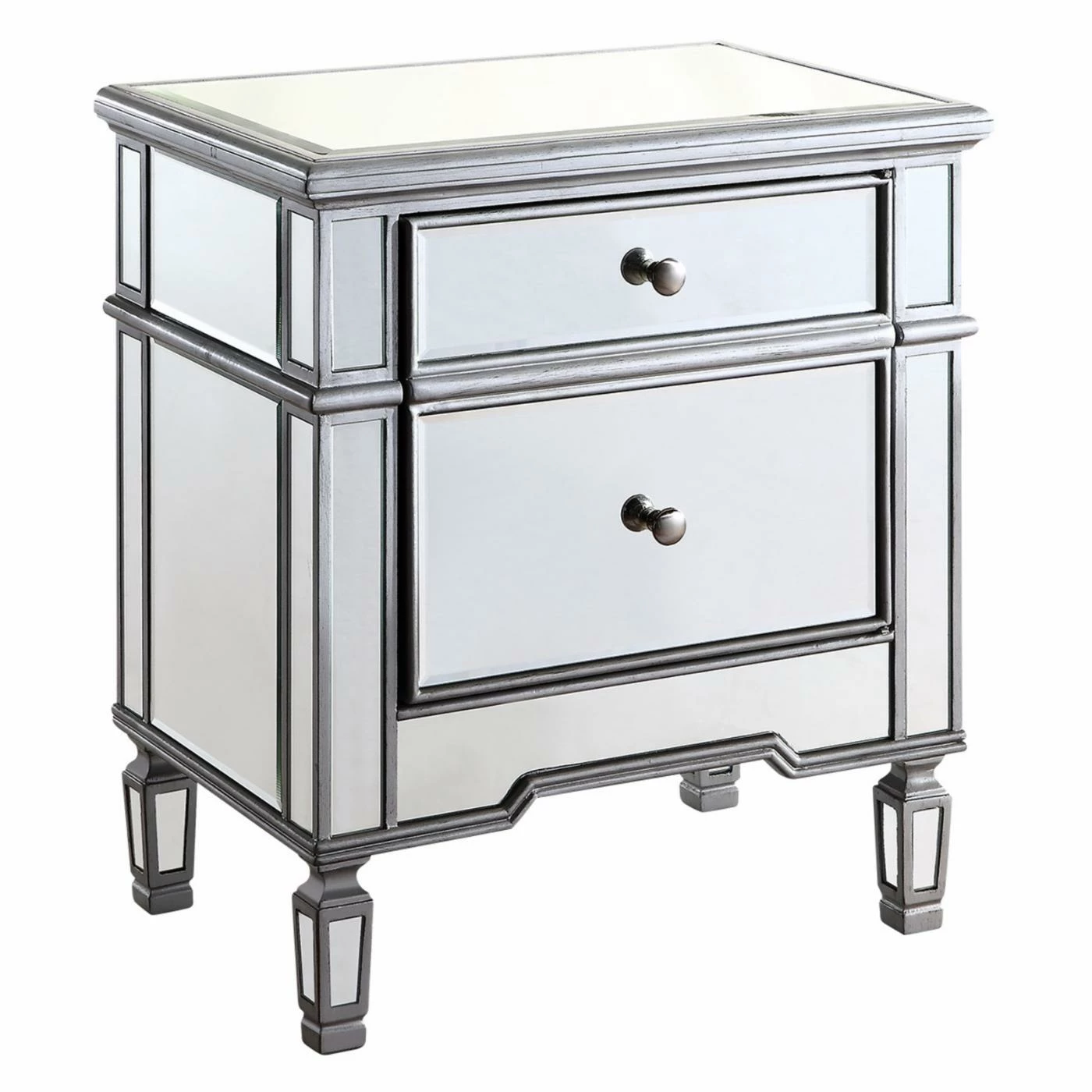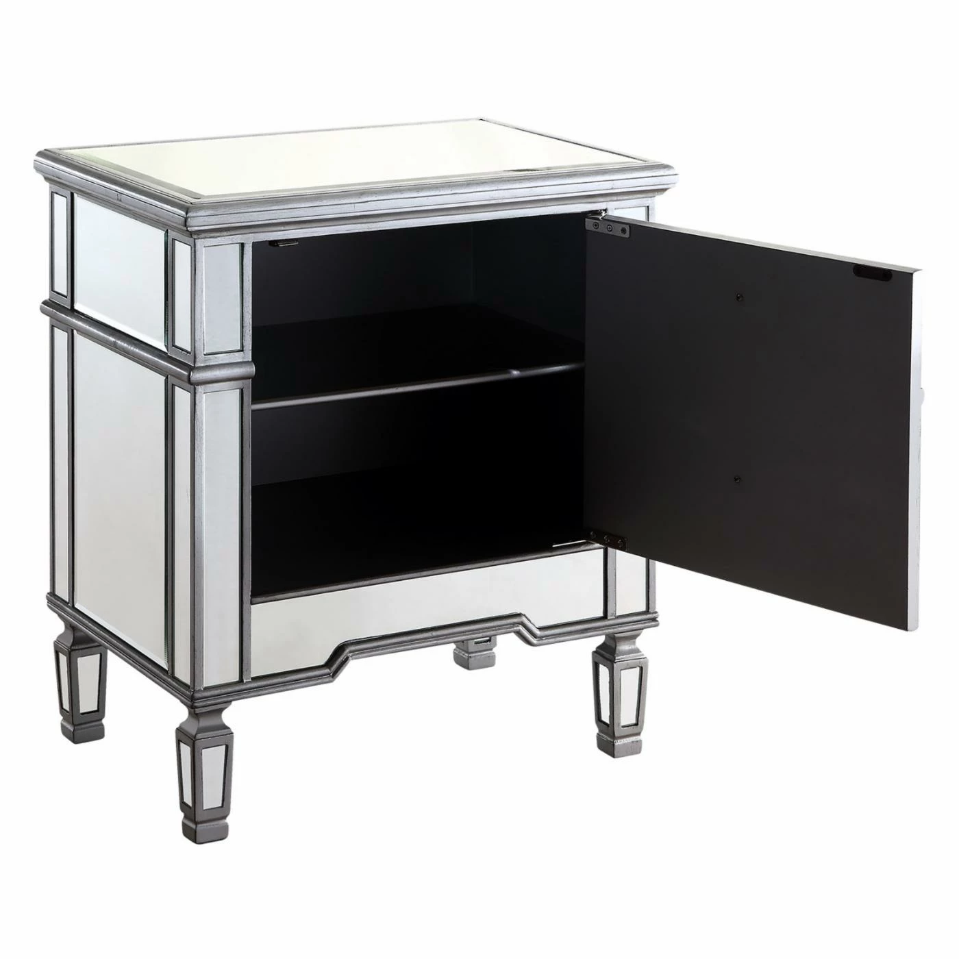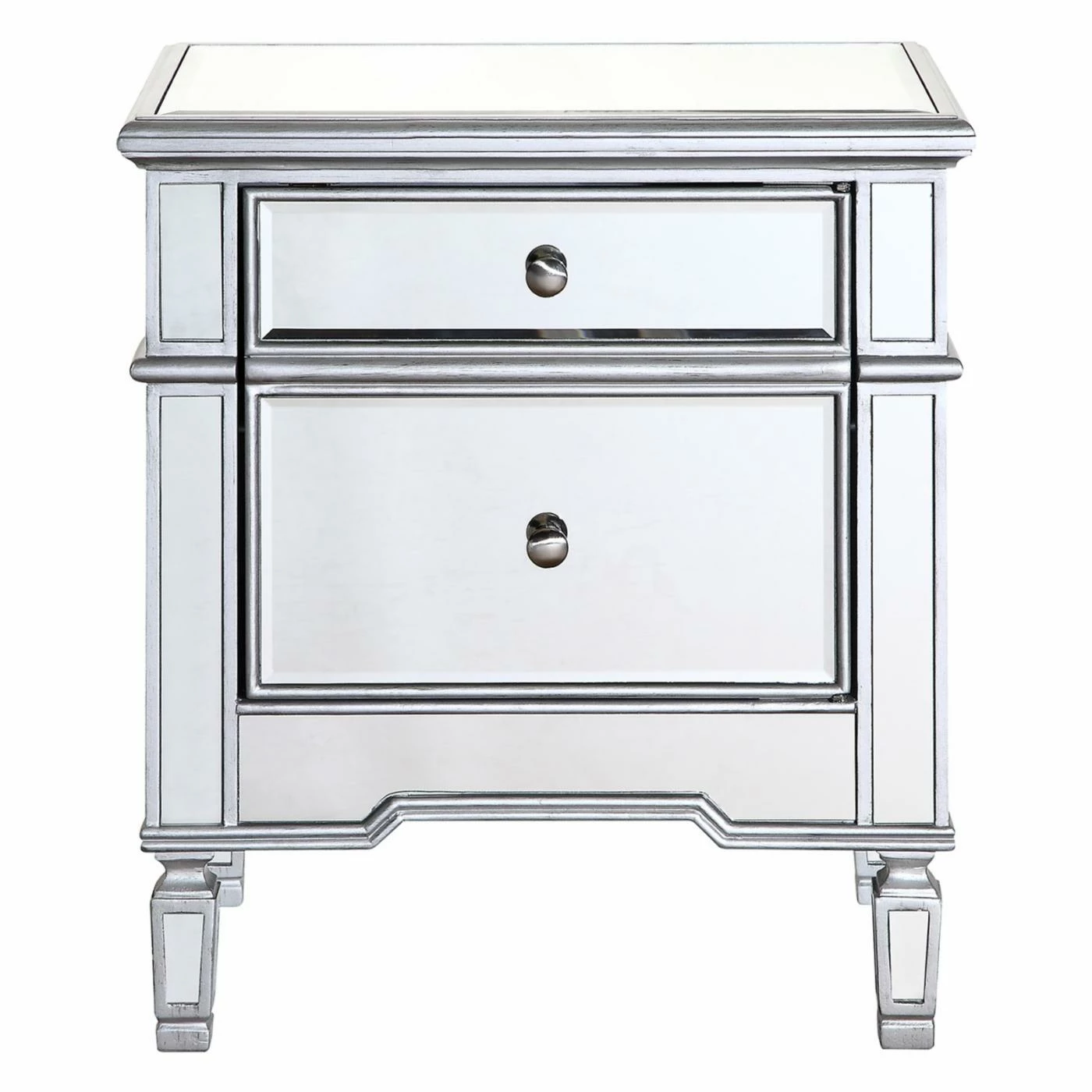 The Elegant Decor 1 Door Living Room Decorative Chest provides opulence and storage space to your living room, bedroom, or bathroom. This sophisticated chest features mirrored panels over a wood frame. The hand-rubbed silver finish and brushed steel knobs create upscale appeal. Stow away all of your essentials in the two drawers.