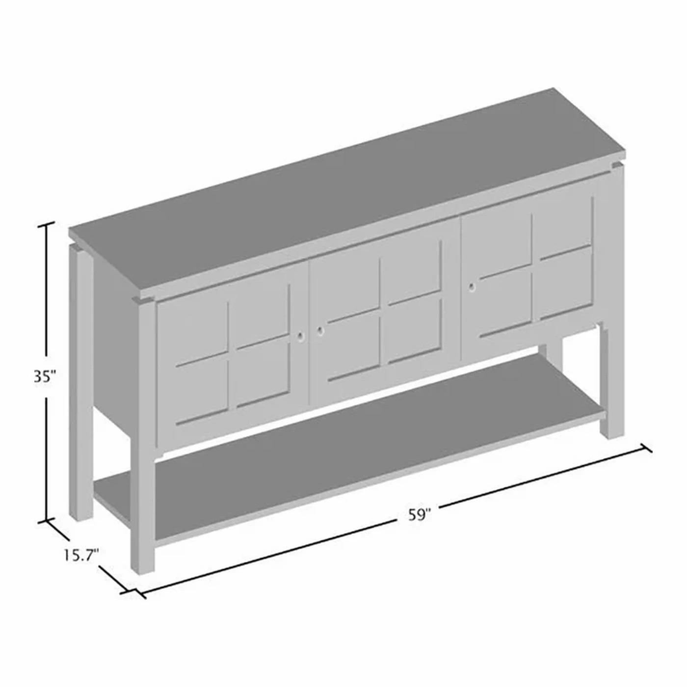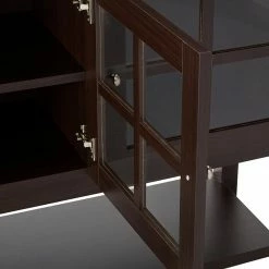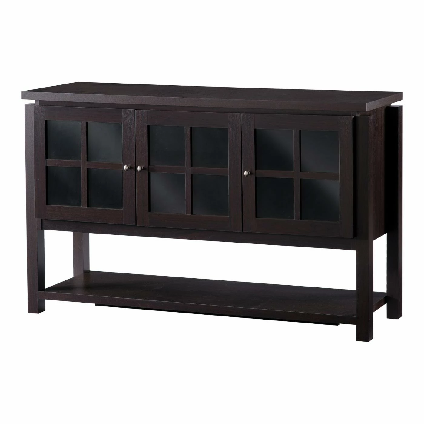 Enhance the storage space in your home with the Furniture of America Cendra Console Table. Featuring three glass-plated cabinet doors with two shelves, this dark walnut console table provides plenty of storage. The large open shelf that runs along the bottom of the table is tall enough for convenient basket storage or display of your favorite dΓ©cor items. Block-style legs deliver sturdy support, and silver knobs on the cabinet doors add a metallic touch that stands out.