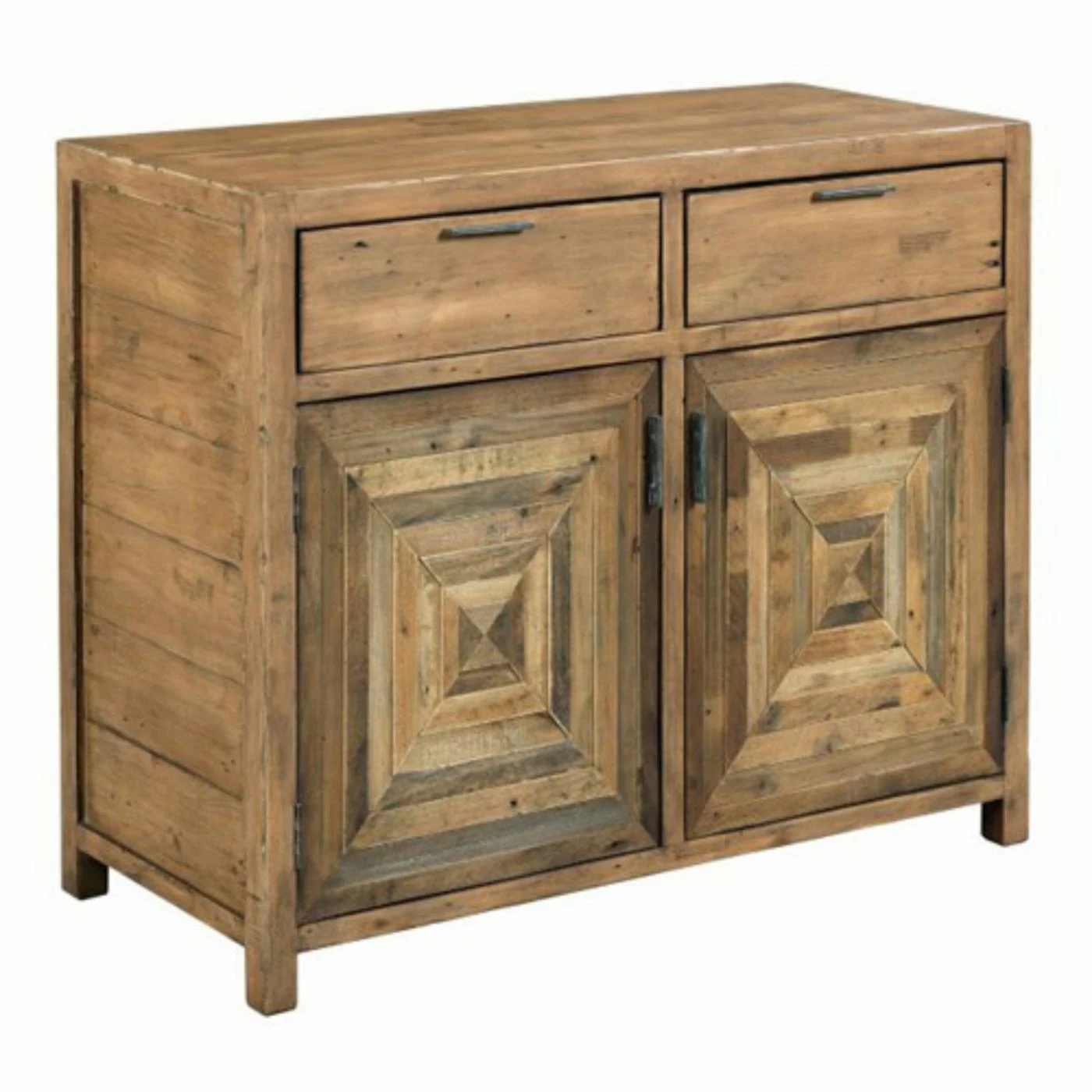 Increase the storage space of any room in rustic style with the Hammary Reclamation Place Accent Cabinet. This solid wood piece boasts two drawers and two cabinet doors. Open the doors to this cabinet to reveal a pair of sawtooth bracket shelves that are separated down the center by a partition. All this storage space makes this cabinet ideal for a living room or dining room. Try coordinating it with one of the other pieces from the Reclamation Place collection.