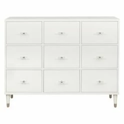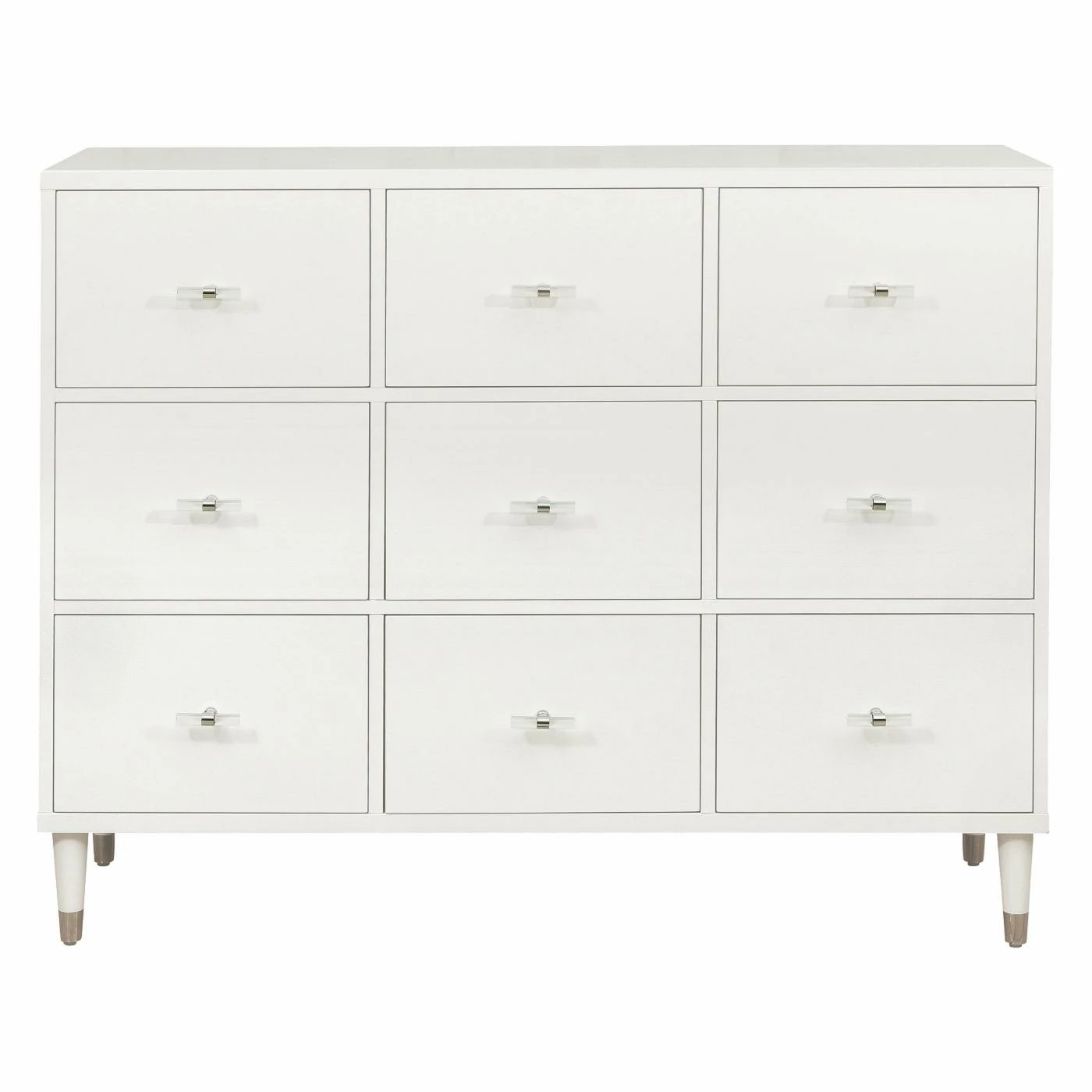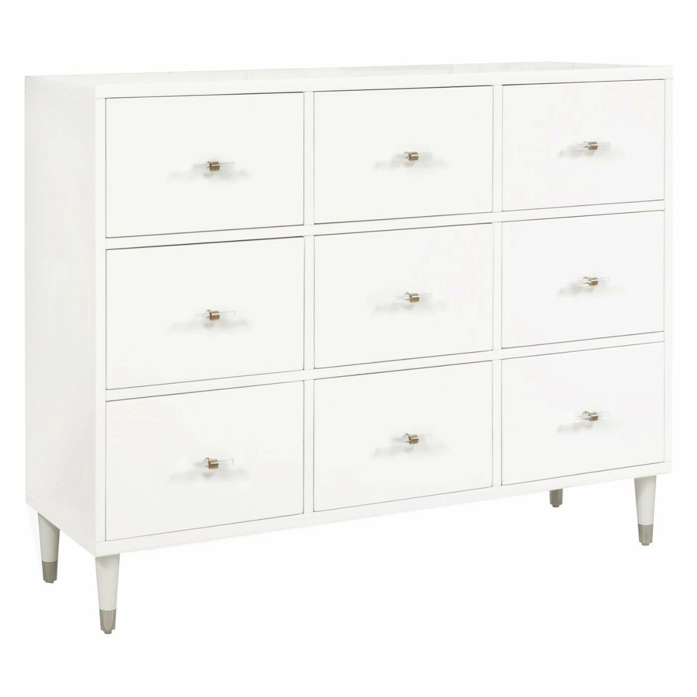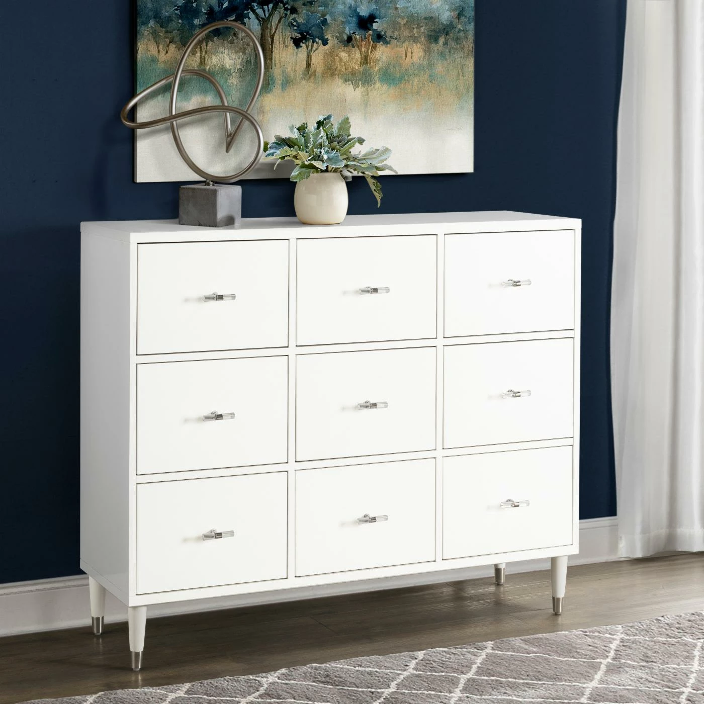 Taking decorative storage to another level is what the HomeFare White 9 DrawerΒ Accent ChestΒ does best. Featuring a clean-lined design and a fresh, white finish, this chest uplifts your living space with refined, modern style. Nine drawers offer generous storage, and each drawer is embellished with jewelry-esque polished nickel and acrylic hardware for a dash of contemporary elegance. Much like a well-accessorized outfit, the tapered legs of this chest are accented with polished-nickel-finished metal foot caps that match the hardware, for an immaculately coordinated concluding touch.