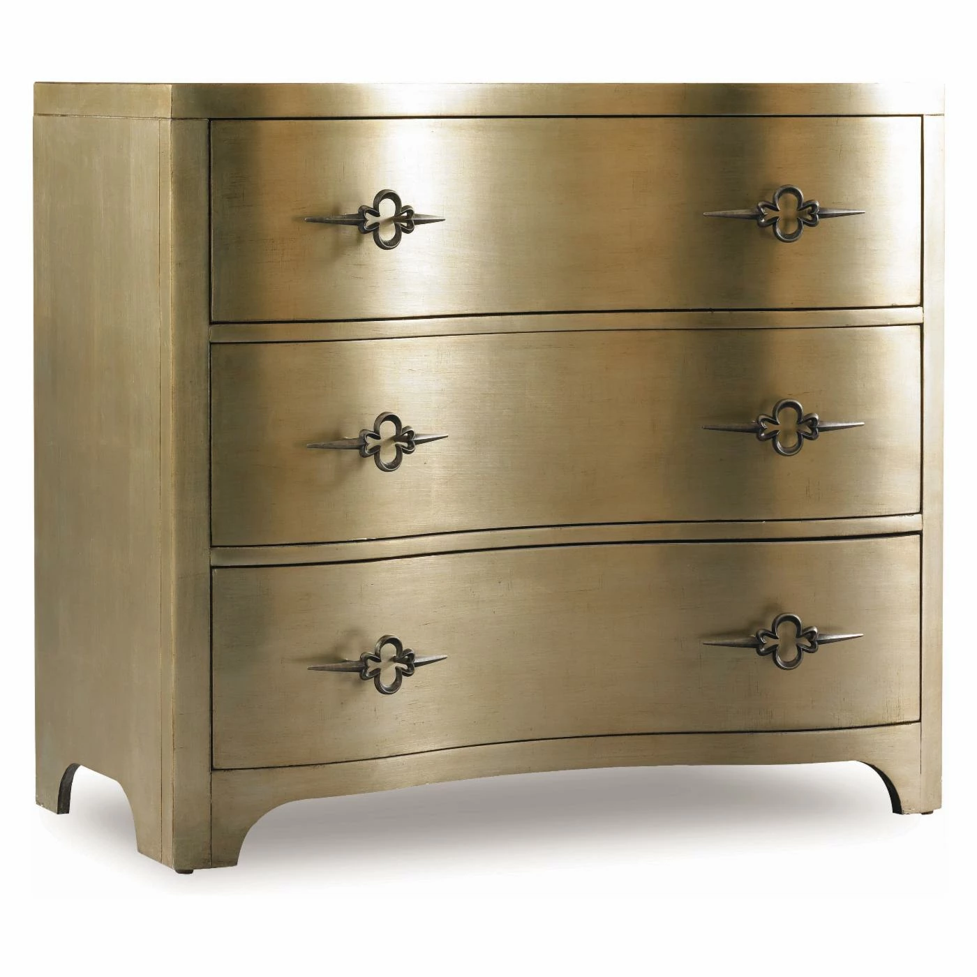 Return to Asian elegance with this dazzling 3-Drawer Shaped Front Chest. Square edges and simple accents contrast nicely the concave bow of the three drawers. We like the faint gold finish with silver undertones and custom-cast aged bronze drawer pulls with unique clover pattern. Constructed of extra-strong engineered hardwoods with quality veneers. This chest is serenely supreme.