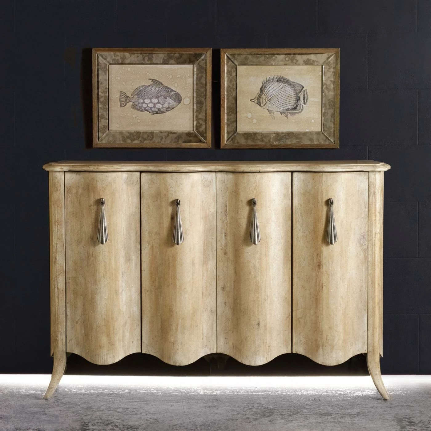 It may be hard to believe that wood can move, but when you look at the Hooker Furniture Melange Draped Credenza, it can be hard to believe that it’s not moving. A body of solid poplar with elm veneers is used to create the undulating surface of this four-door cabinet. Oversized pendant-style pulls add to the feeling of hanging, draped cloth, but an adjustable shelf behind each door give this piece a purpose that’s more than just making strong impressions. A hand-applied, multi-step finish in light wood-tones creates a deep look that’s reminiscent of driftwood or linen.