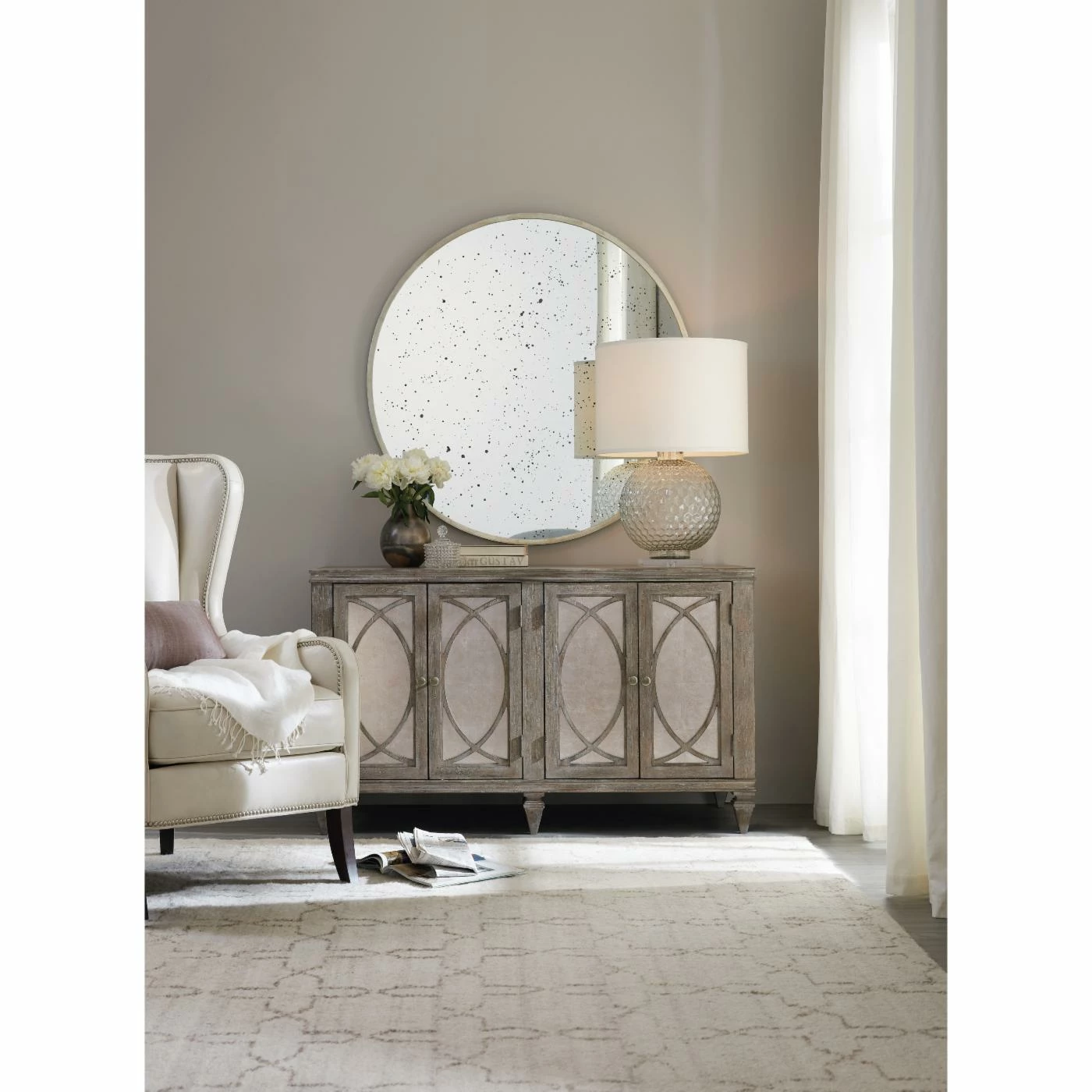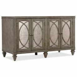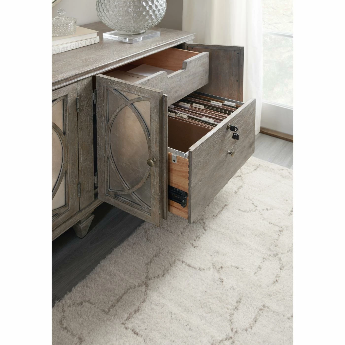 Add vintage glam style to your home office with the Hooker Furniture Rustic Glam Credenza. Four wood framed doors with eglomise glass fronts and fretwork overlays open to reveal abundant storage space plus a pull-out drawer and locking file drawer with pendaflex system. This credenza is built of rubberwood solids and quartered white oak veneers in a multi-step gray finish that includes antiquing, wire brushing, gouging, and rasping. Eglomise glass accents add vintage glam appeal to this office credenza.