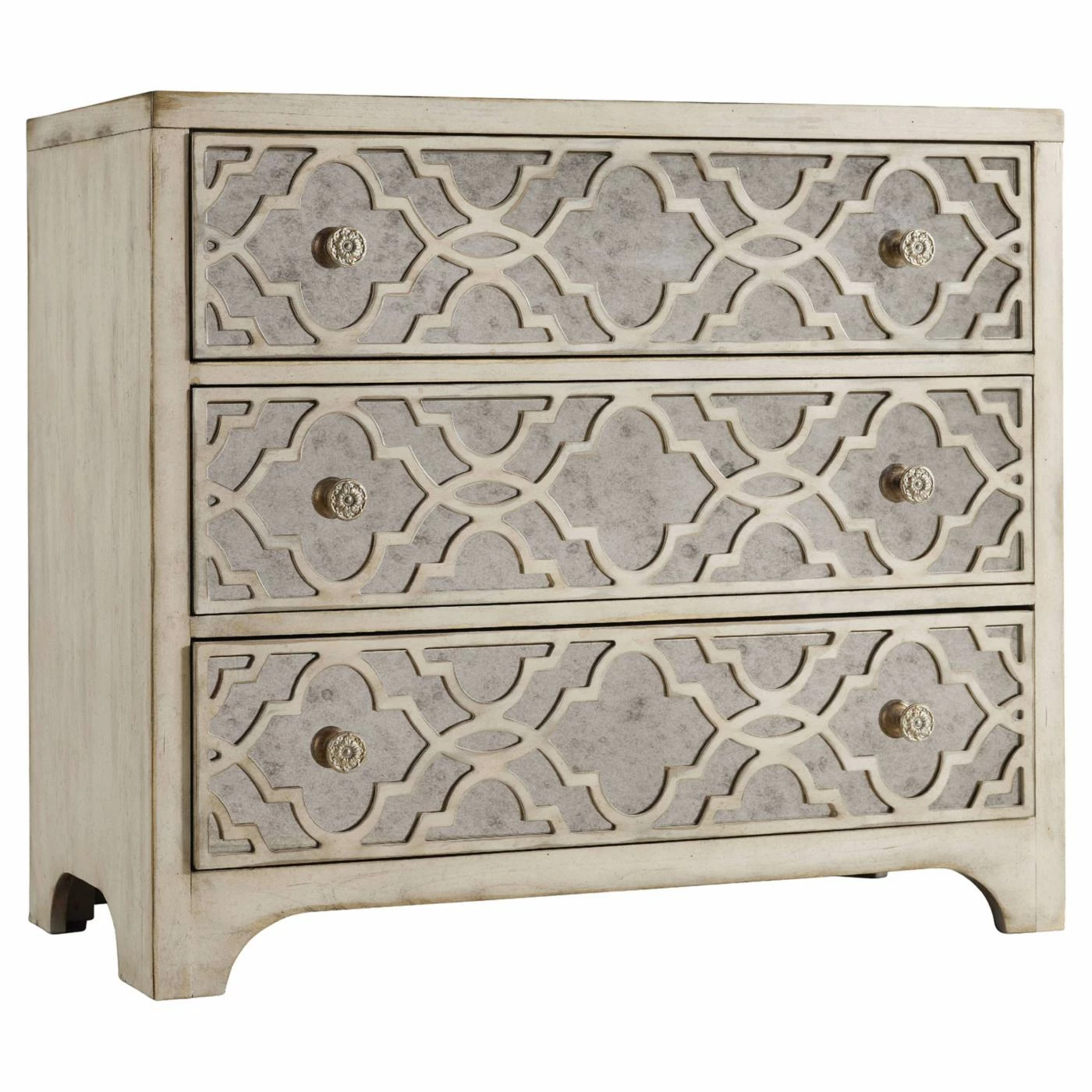 This Hooker Furniture Sanctuary Fretwork Chest makes a statement with its quality craftsmanship and detailed etching on the three drawers. Featuring glass, hardwood, oak veneer construction, it’s finished in luminous pearl essence. Sturdily built, it’s part of the Sanctuary Collection.