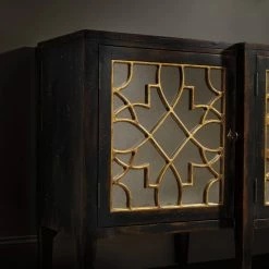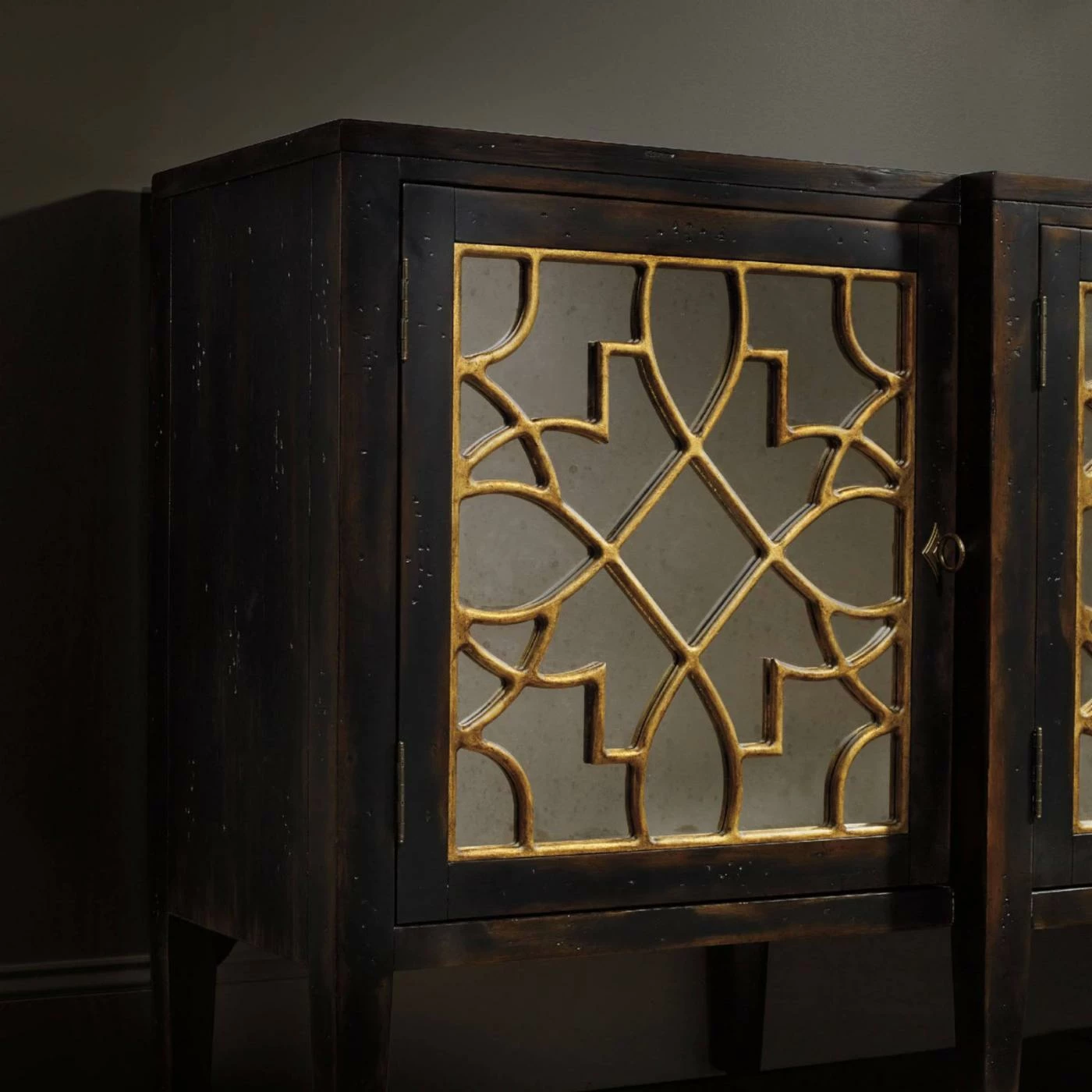 - Ornate golden overlay on antiqued mirror door fronts
