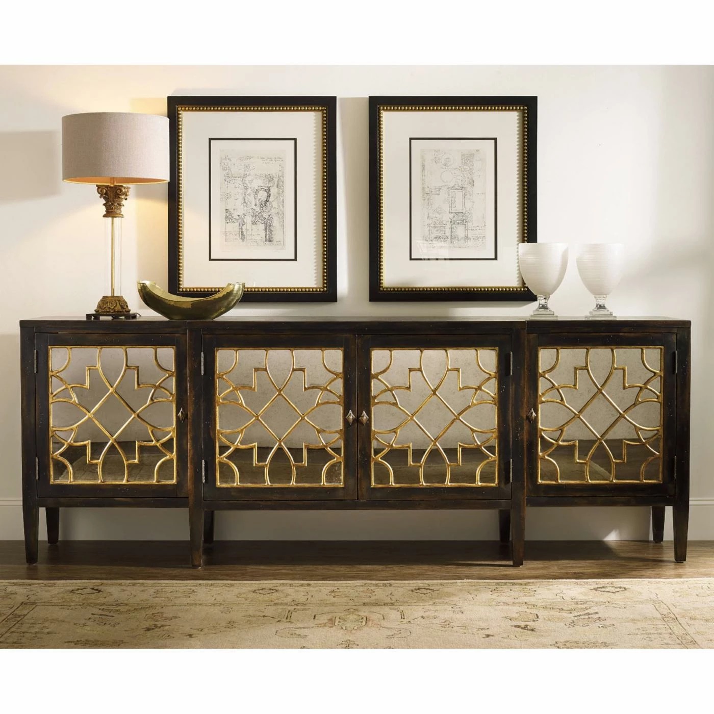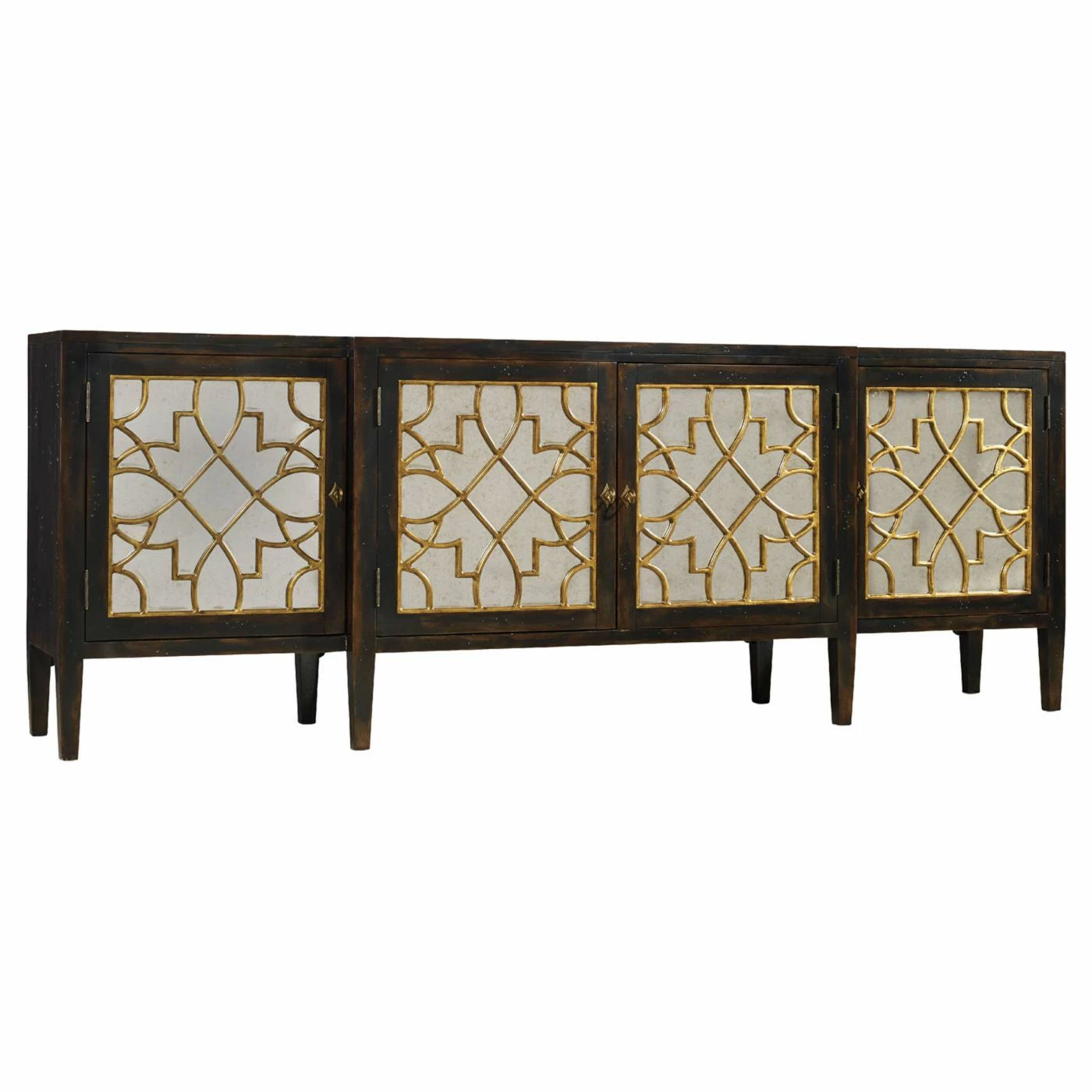The grand and graceful Hooker Furniture Sanctuary Mirrored Console Table adds a gilded overlay to its antiqued mirror door fronts. The two side doors and pair of center doors each have an adjustable shelf. Tapered legs and an ebony finish bring mid-century style to this large scale, rectangle console table.