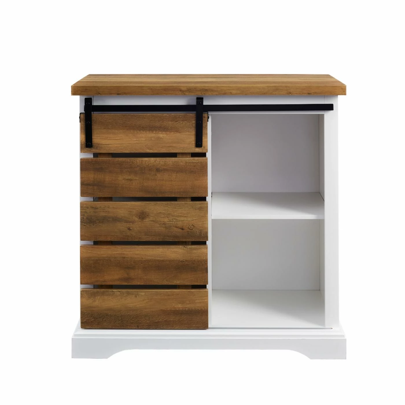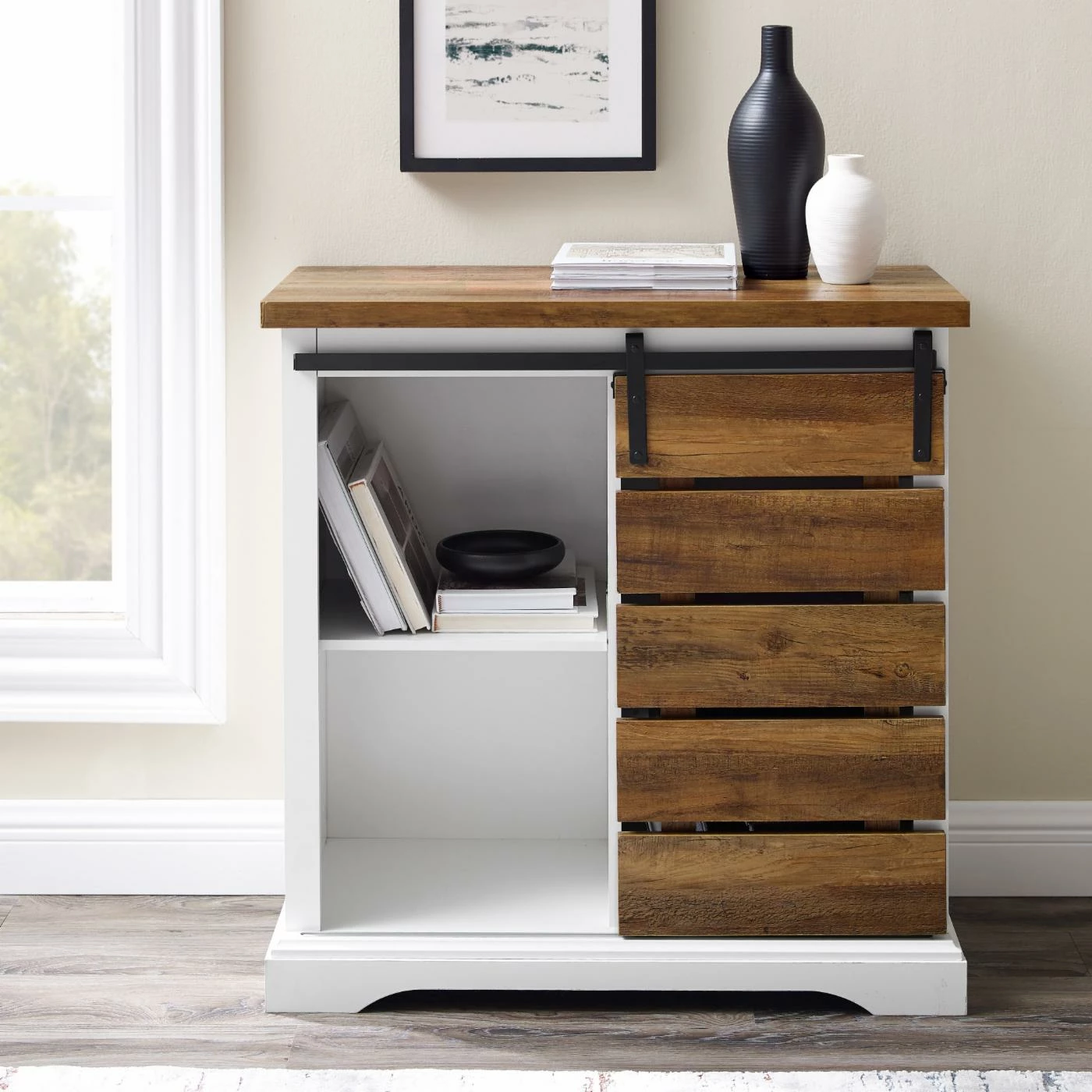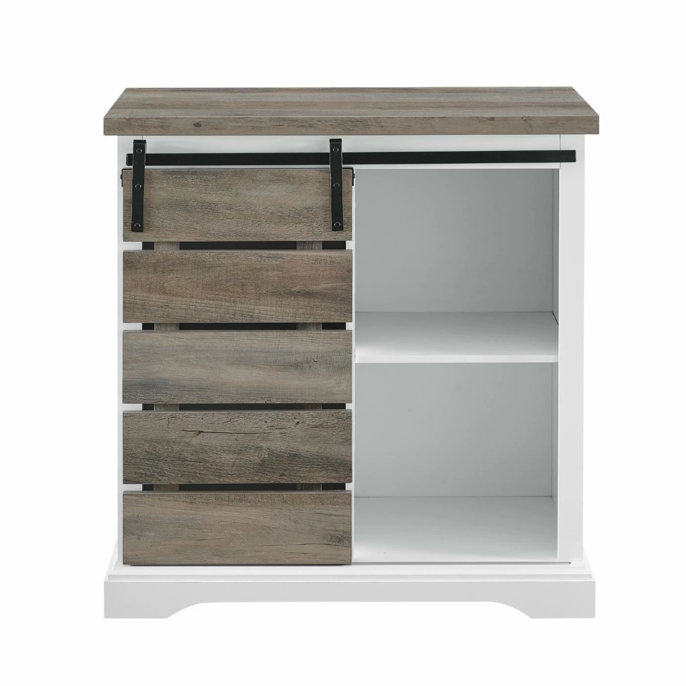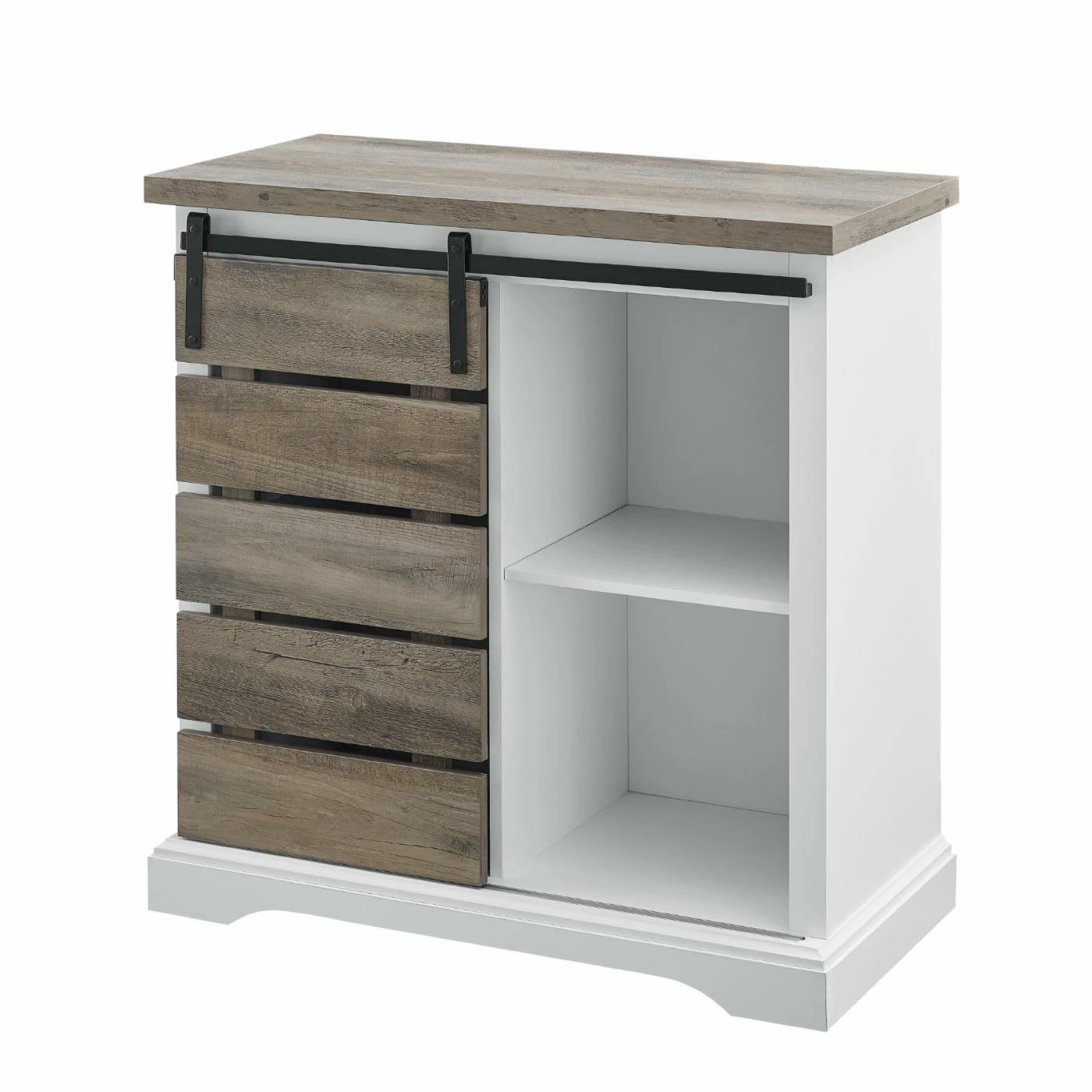 Featuring reclaimed looks in a brand-new package, the HumbleNest Countryside 32 in. Modern Rustic Sliding Slat Door Accent Cabinet is a great addition to any living room, dining room, or entryway. Crafted from laminate and high-grade engineered wood in your choice of available two-tone finishes, this piece blends seamlessly with any color scheme. Two adjustable shelves provide ample storage space while the slatted door front glides smoothly to cover either side.