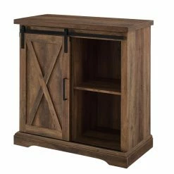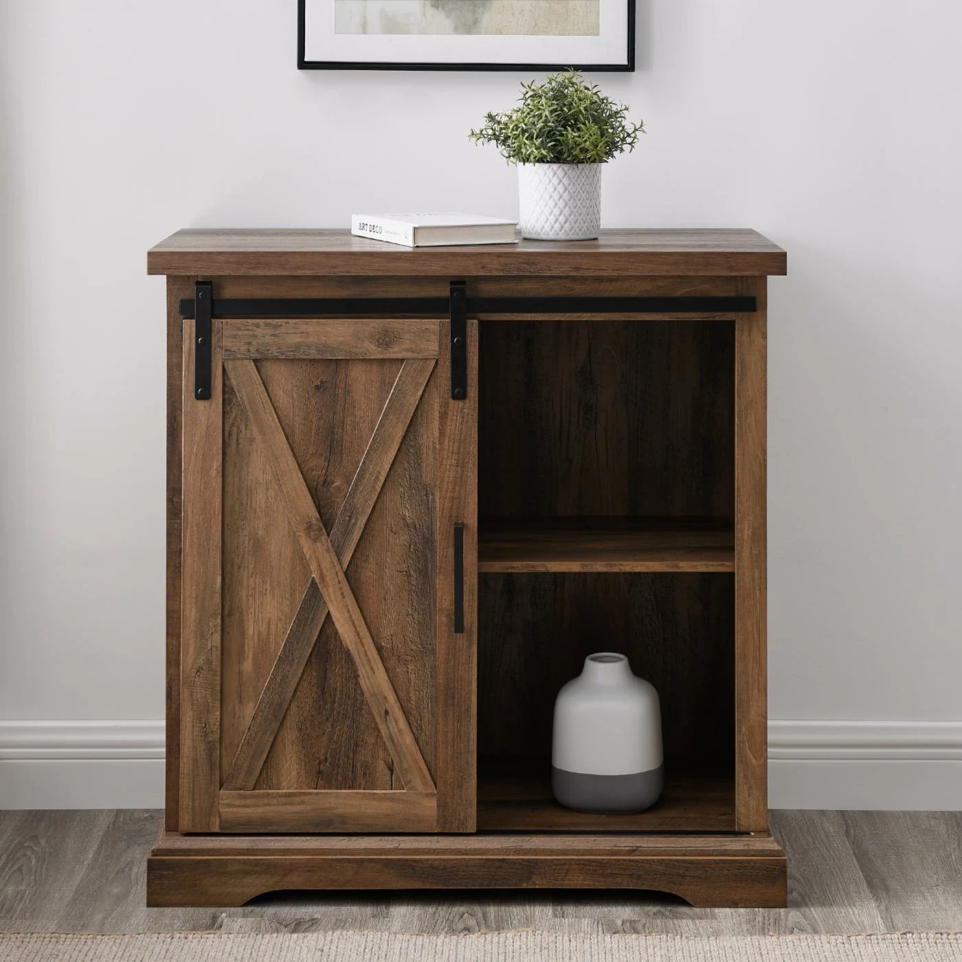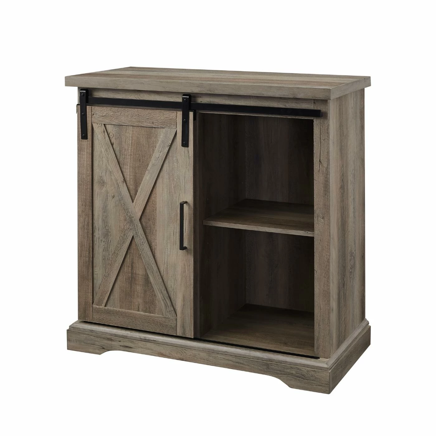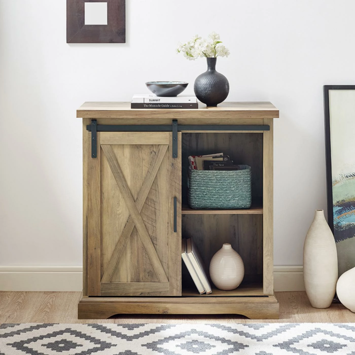 You don’t have to know the difference between farmhouse and traditional style to know you like the HumbleNest Farmers Market 32 in. Rustic Sliding Barn Door Accent Console. Featuring two adjustable shelves behind a sliding X-frame cabinet door, this console stores your media devices, books, or decorative items with ease.