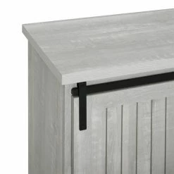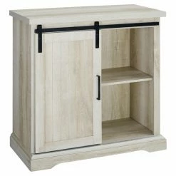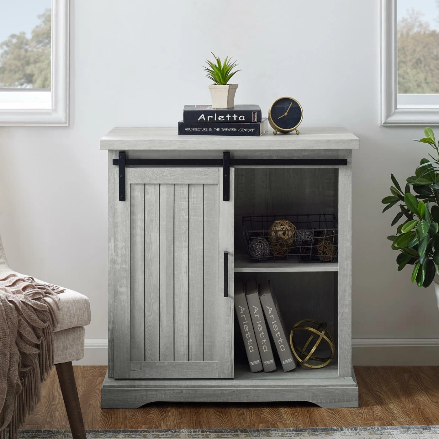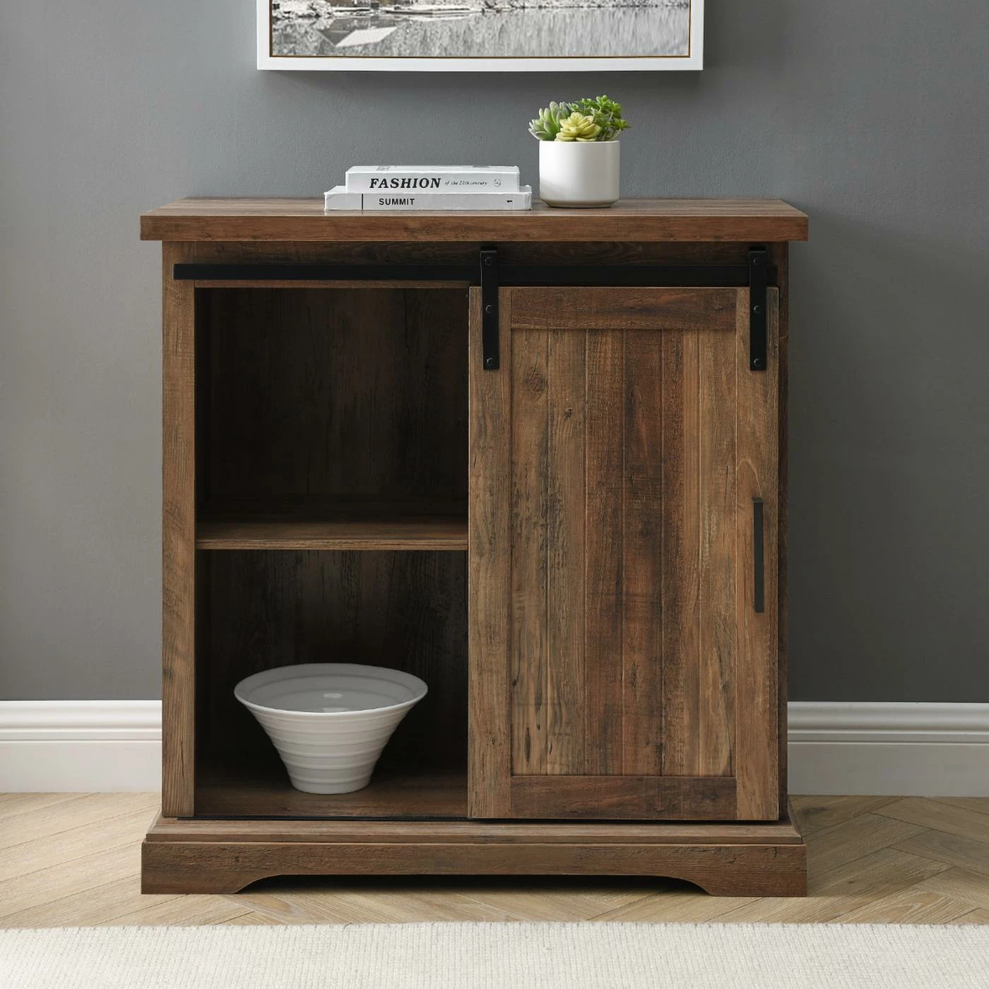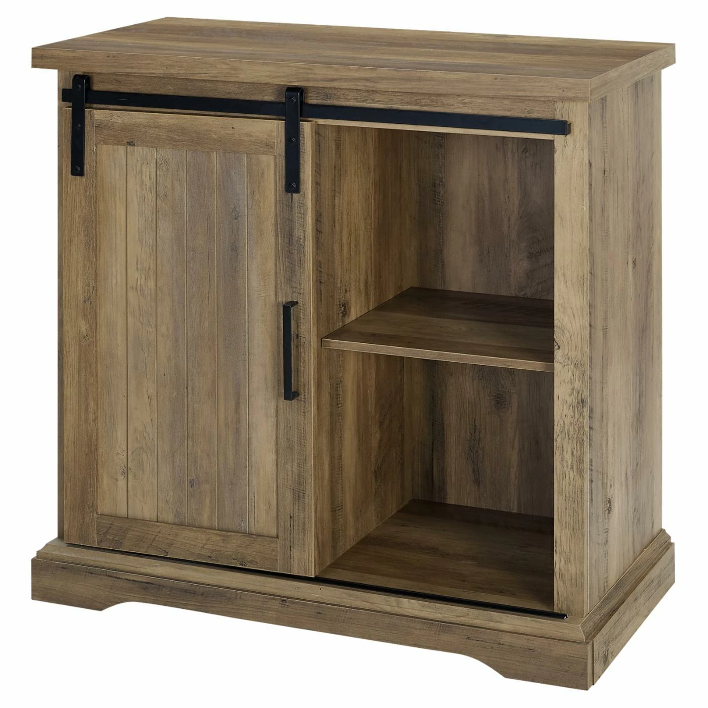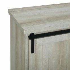 The HumbleNest Farmers Market 32 in. Sliding Barn Door Accent Console‘s sliding barn-style door makes us think of quaint country homes and reclaimed designs. Crafted from high-grade engineered wood and laminate, this durable TV console is a great choice for high-traffic areas. Two adjustable shelves behind the sliding slat cabinet door give you plenty of room to store your media devices while the top is large enough to hold most 34-inch-wide TV screens. Select from the available finishes to find the perfect look for your home.