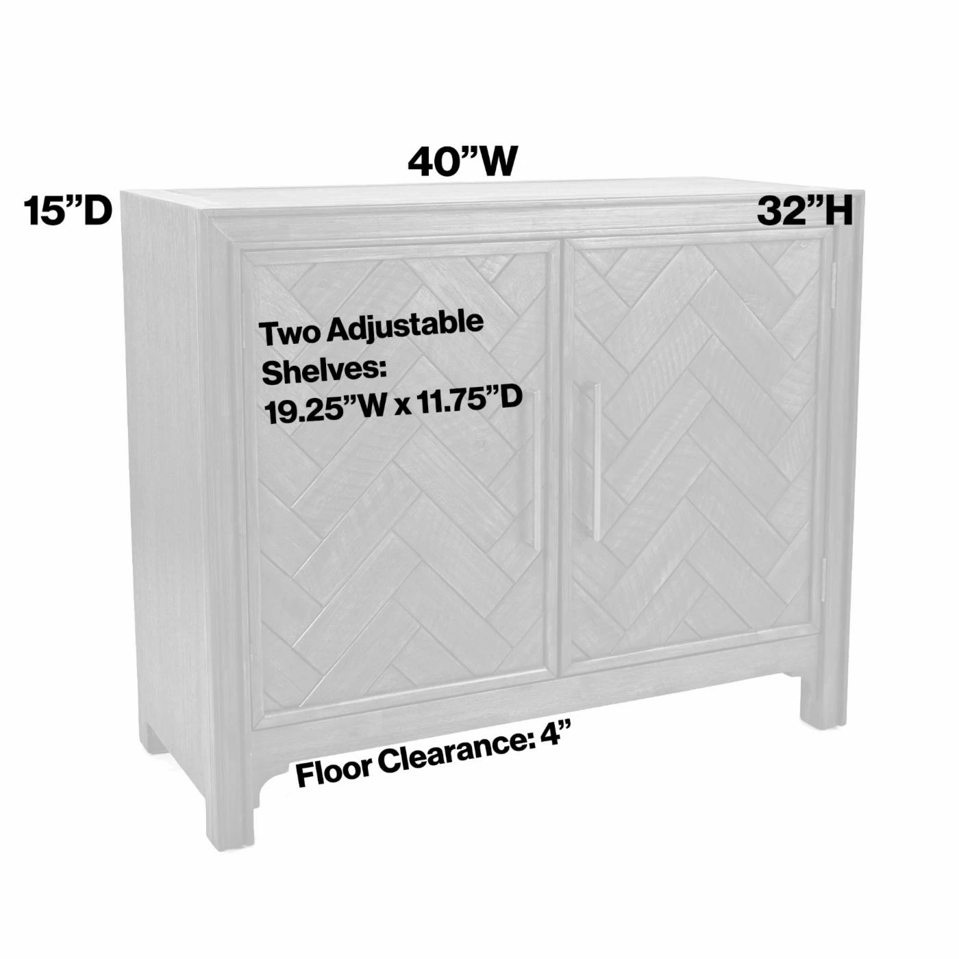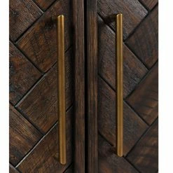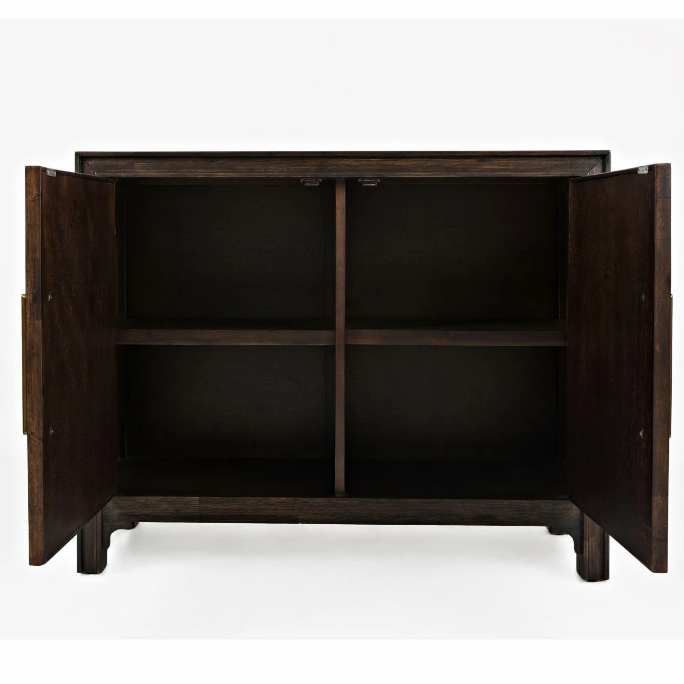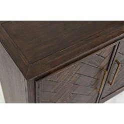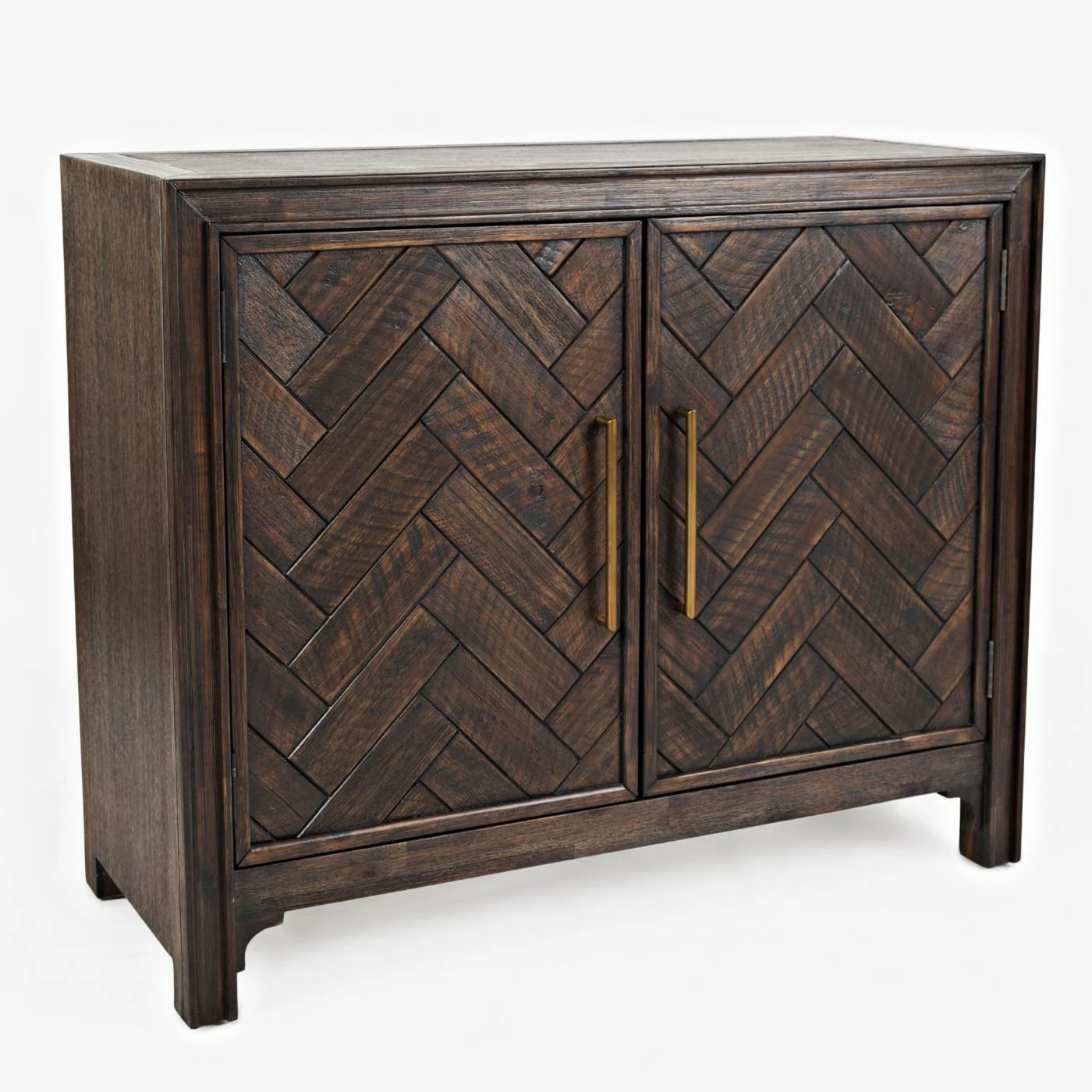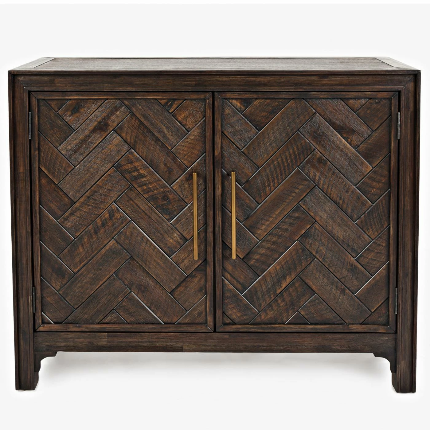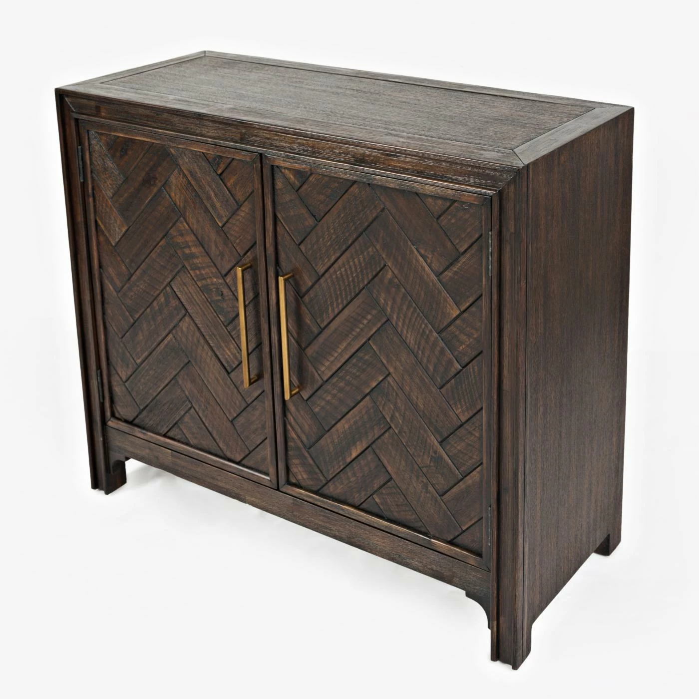 Change up the design of your space with the Jofran Gramercy Dark Chevron 2 Door Accent Cabinet. Featuring a mid-century modern flair and chevron pattern inlay, this accent cabinet is a striking addition to any home. Its wire brushed brown finish and gold accents highlight the beauty of the wood construction. With four shelves for holding everything from books to devices to office supplies, this cabinet gives you versatile storage in undeniable style.