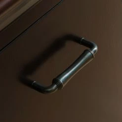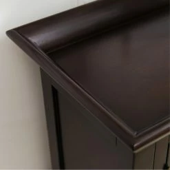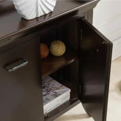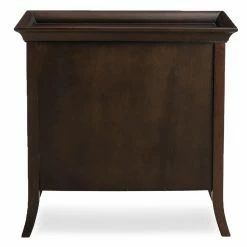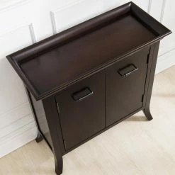 Traditional but far from mundane, the Leick Home Tray Edge Foyer Cabinet is a great way to refresh your entryway, foyer, or hallway. The flared tray edge top and splayed saber legs create a bold silhouette, while the chocolate cherry finish on the solid hardwood and birch veneers coordinates with a variety of palettes. The two doors feature antiqued bronze pulls, and inside, you’ll find an adjustable shelf.