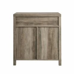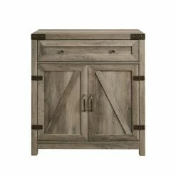 Use the Manor Park Farmhouse Barn Door Accent Cabinet as a storage piece in your farmhouse living room or as a small buffet in your rustic dining area. This accent cabinet features a top drawer with metal telescoping metal drawer glides. Adjustable shelving is concealed behind the two doors with exposed hardware and barn-style fronts. The gray wash finish adds even more rugged, rustic appeal.