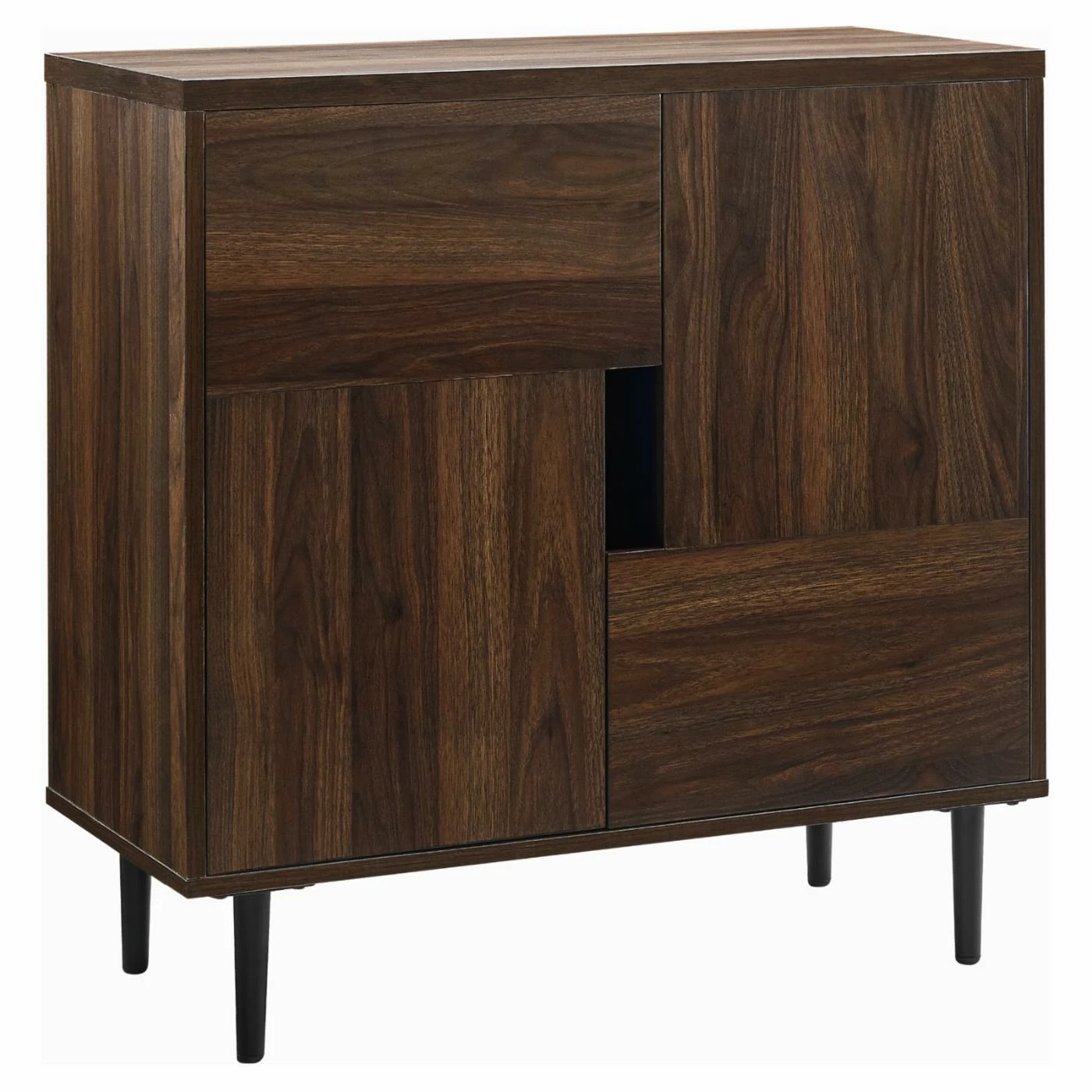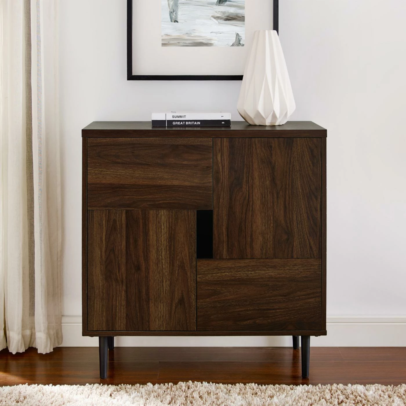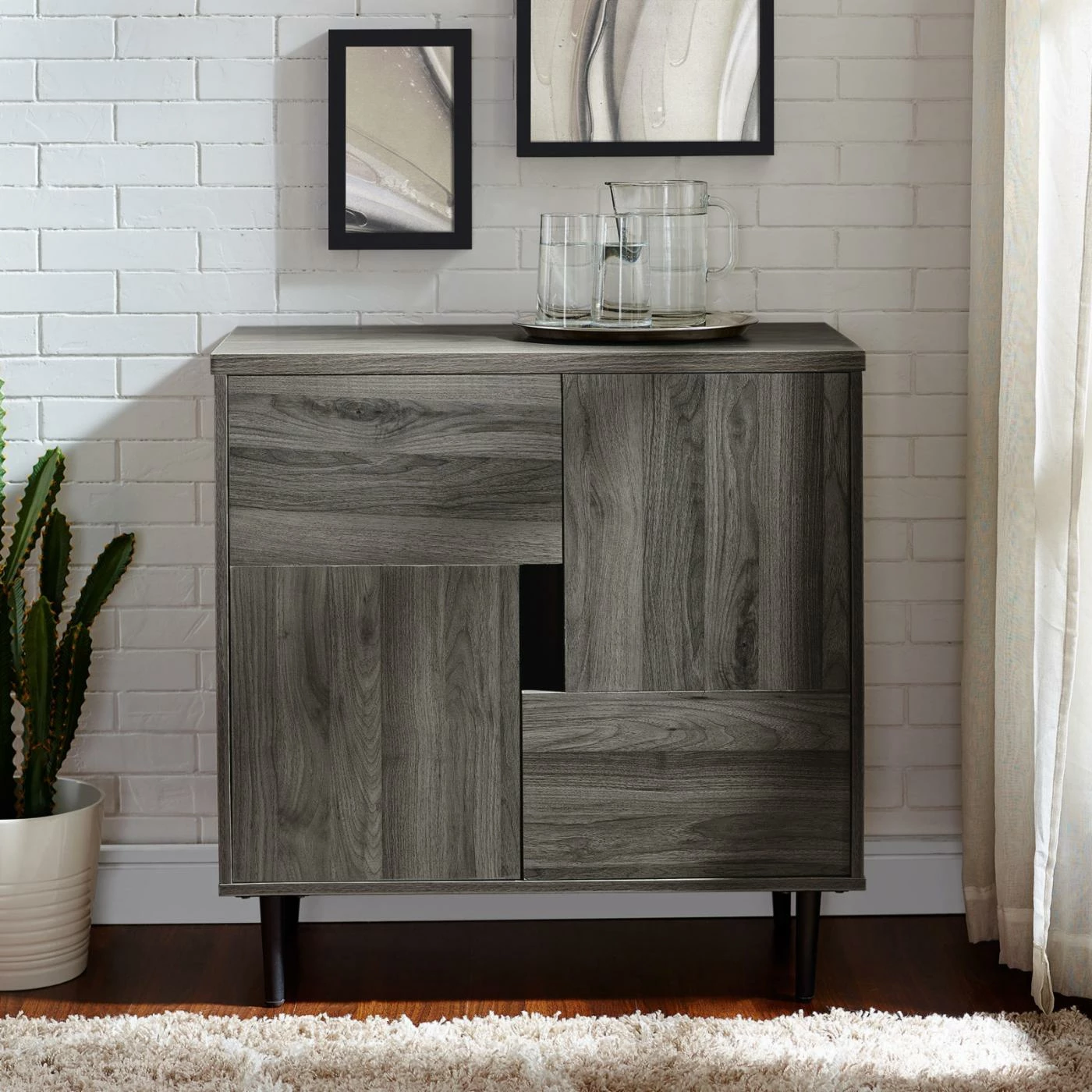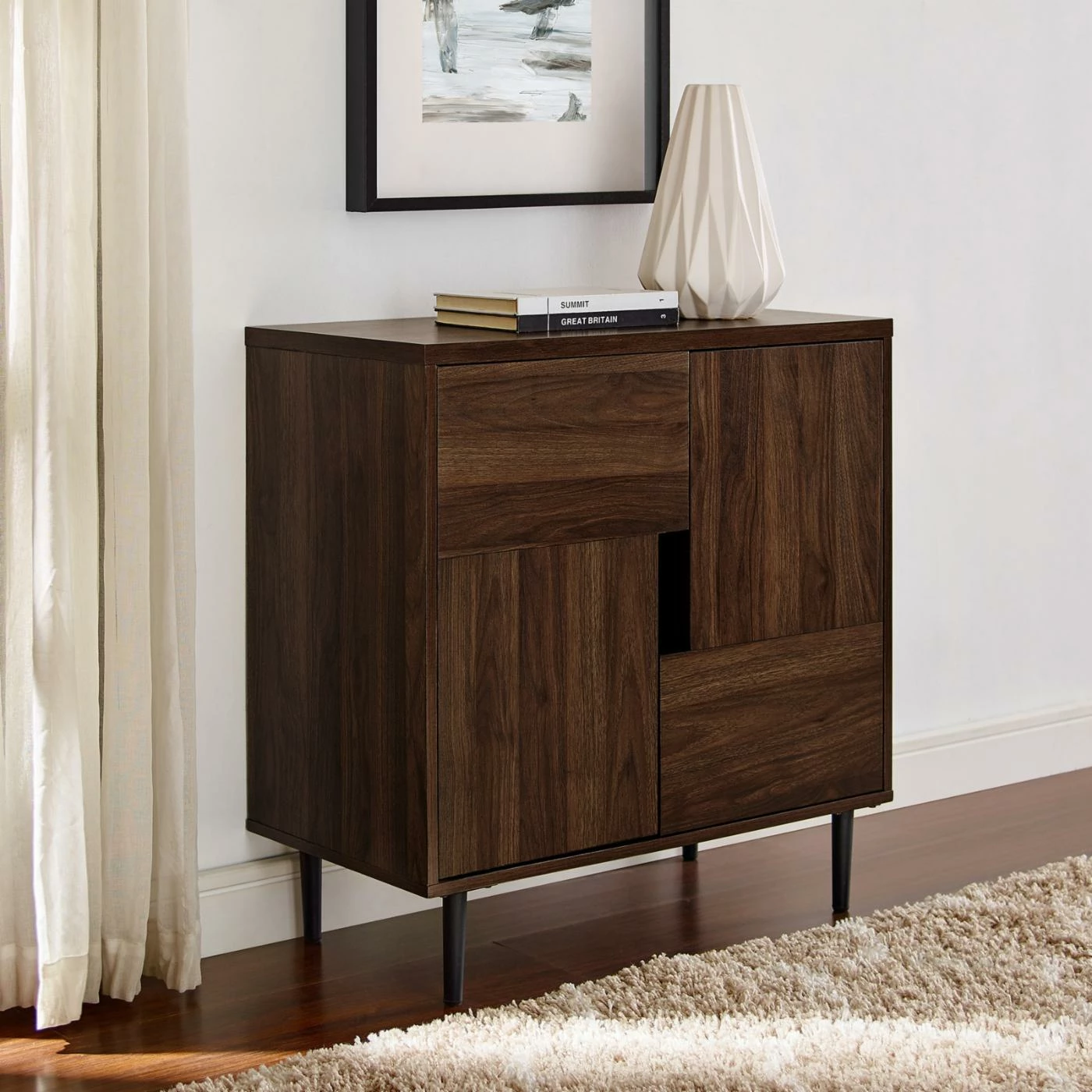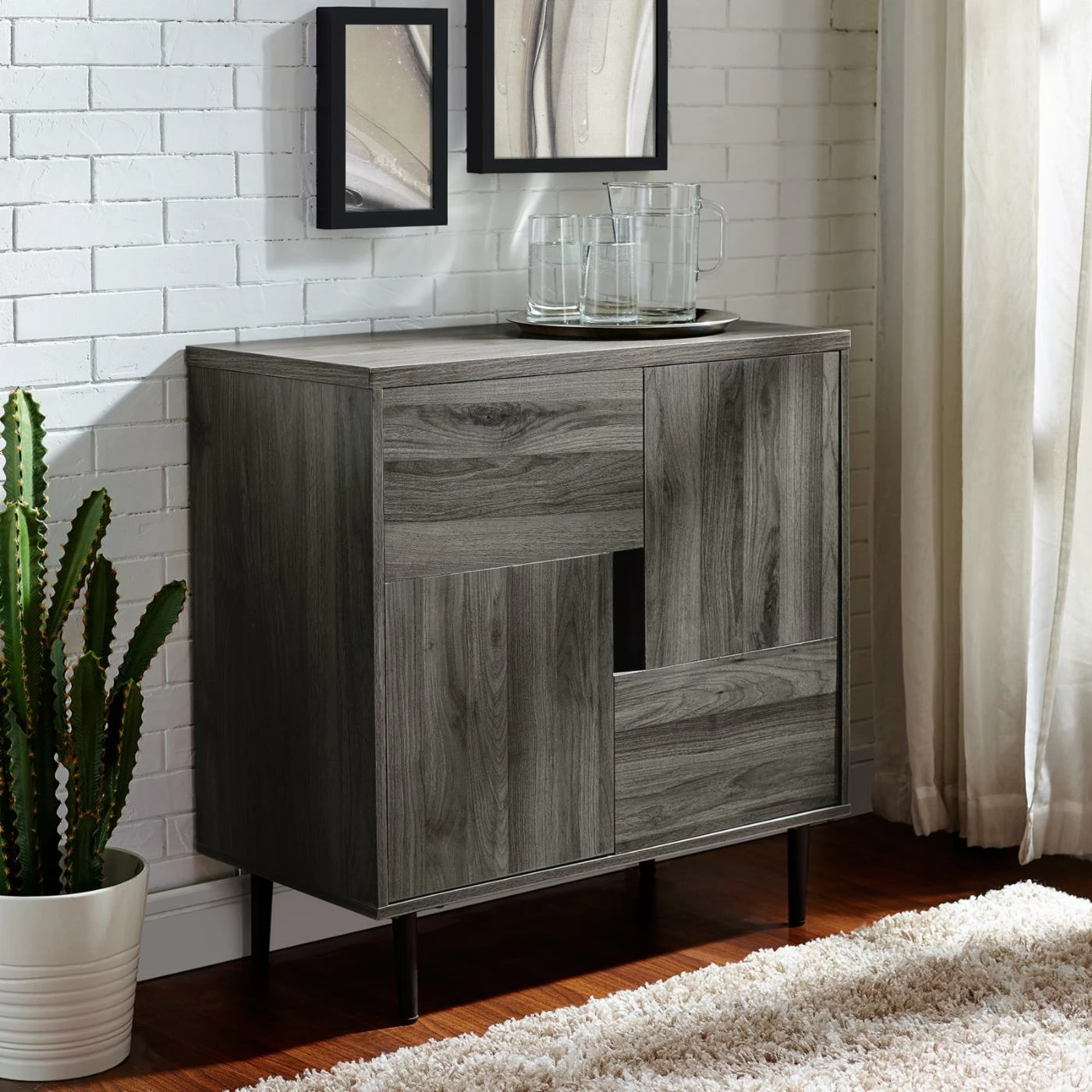 Foster some fun modern storage into your living room with the Manor Park Modern Accent Cabinet. This accent cabinet has two L-shaped doors that form an open rectangle in the center to allow easy opening. Inside, four fixed shelves let you keep books, movies, supplies, and other small items neatly organized. The piece rendered from durable engineered wood with metal legs, topped by a laminate veneer and featuring a bold color accent inside. Choose your preferred finish option from the available.