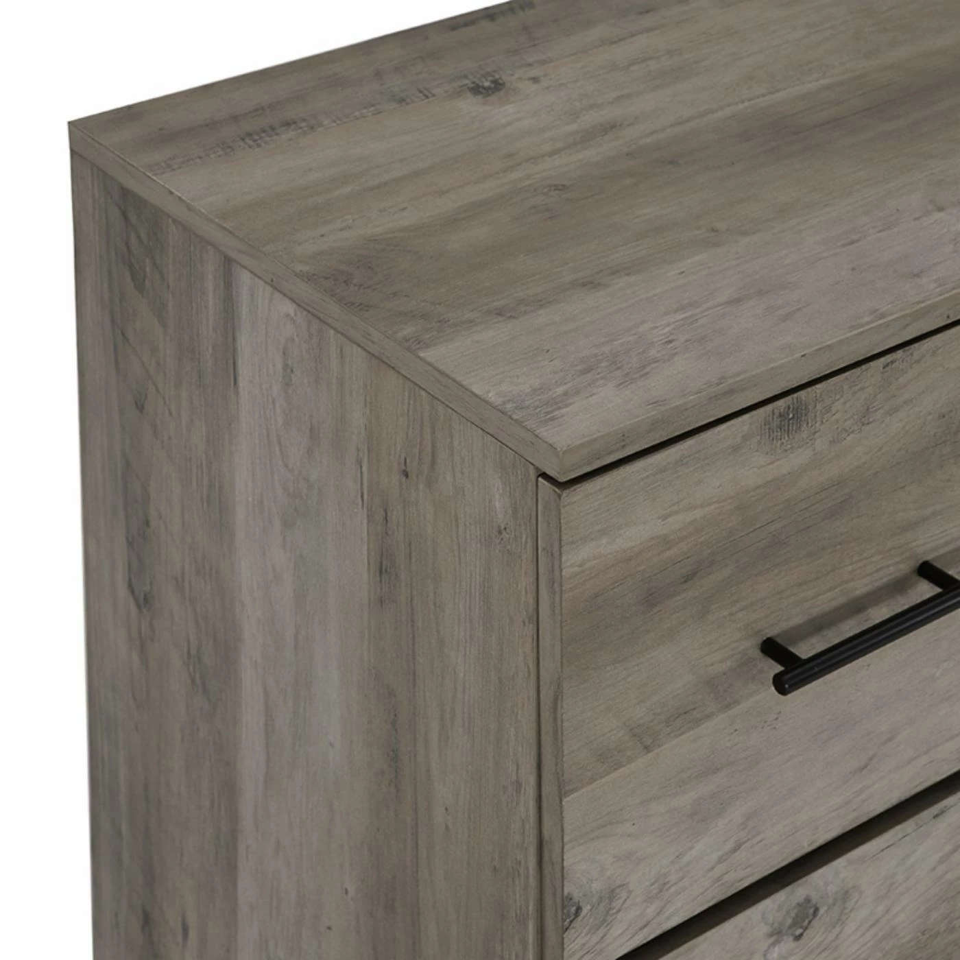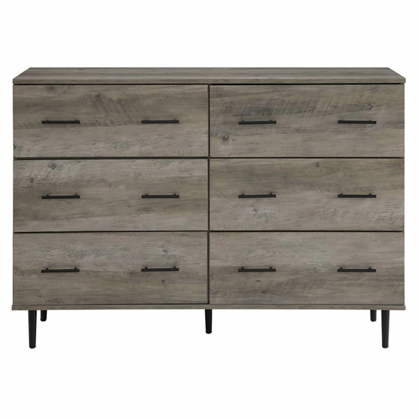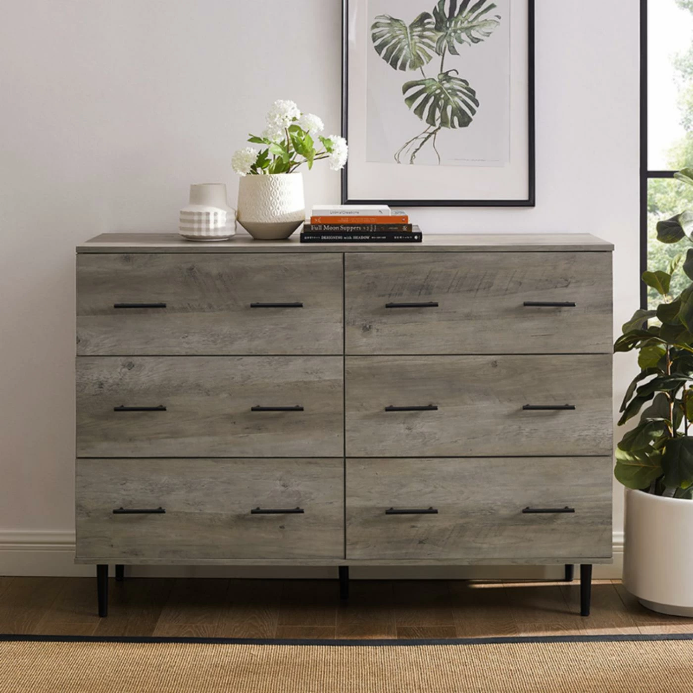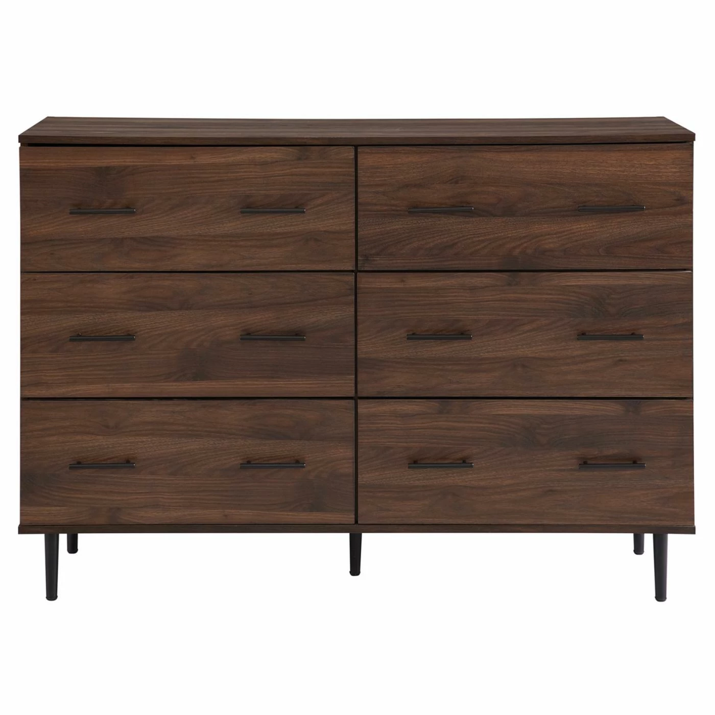 Free up clutter with the Manor Park Rustic Wood 6 DrawerΒ Storage Chest. Skinny round legs in a black finish match the double metal handles with a long design. Choose from the available wood finishes to find the best option for your space. This dresser is constructed from engineered wood and laminate.