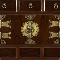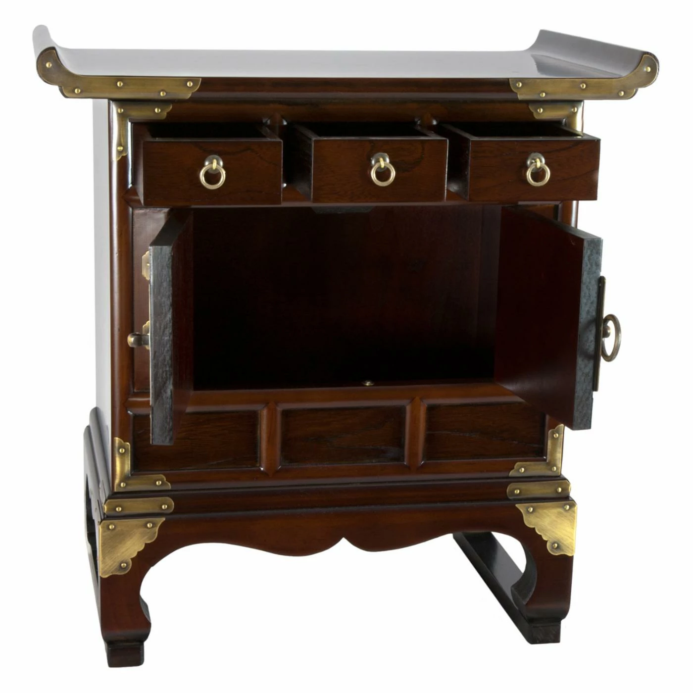 It’s the attention to detail that makes this Oriental Furniture Korean 3 Drawer End Table a modern day heirloom piece. This Oriental end table is well-crafted of fine grained elm wood in a hand-rubbed dark stain. Traditional Oriental polished brass hardware graces the three hand-crafted drawers, two detailed cabinet doors, and both the cantilevered top and carved legs on this end table. Good luck comes from the brass fish lock and key. This end table has a classic tori style cantilevered top with upturned ends and Asian-inspired sled style base.