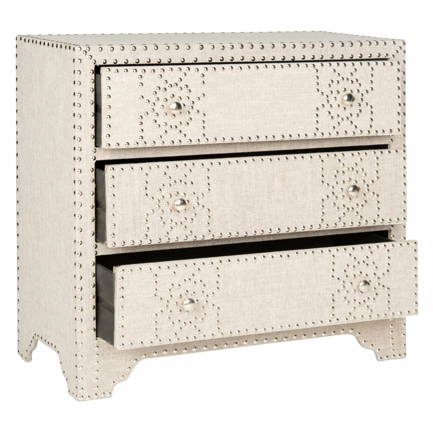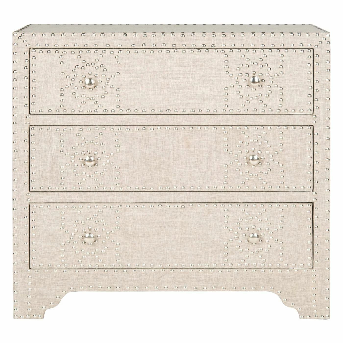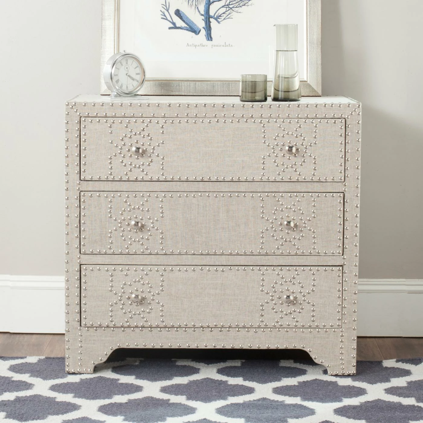 The Safavieh Gordy 3 Drawer Chest in Grey combines exceptional storage and elegant style in one glimmering piece that adds style to any space. This spacious chest is constructed of durable engineered wood and fir so it will stand through the years. Its neutral grey finish ensures it will complement any existing décor in your home, while the gleaming nailhead trim and drawer front accents give it a dramatic update. Three spacious drawers leave plenty of room for storing clothes, accessories, games, and more no matter where it sits in your house.