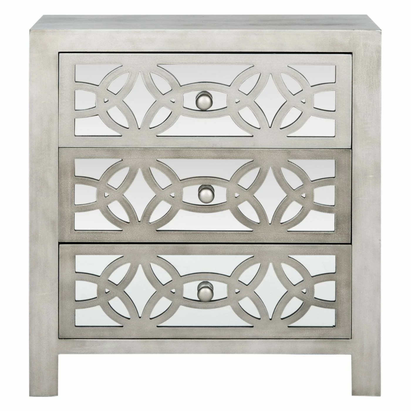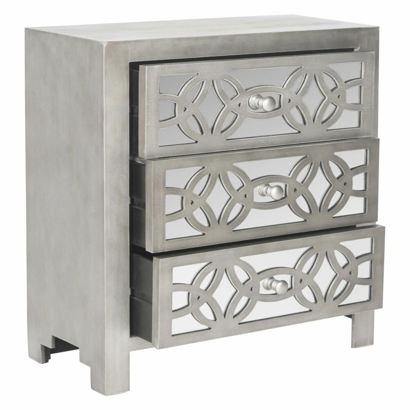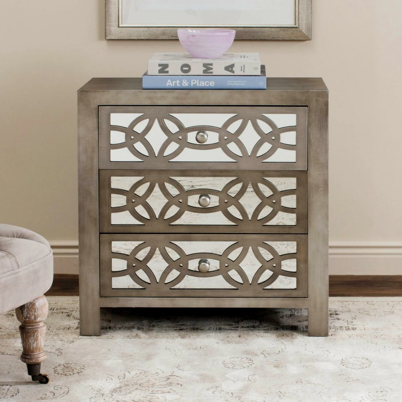 Add chic style and loads more storage space to any room in the house with the Safavieh Tasha 3 Drawer Chest in Grey. This spacious chest is constructed of durable engineered wood and fir so it will stand through the years. Its neutral grey finish complements any existing dΓ©cor, while the intricately detailed drawer fronts add elegance and intrigue. Three spacious drawers leave plenty of room for storing your wardrobe, accessories, or household essentials in effortless style.