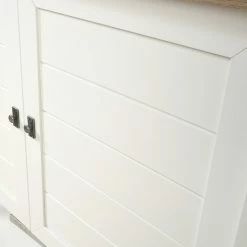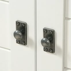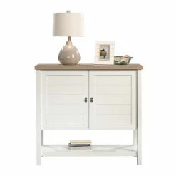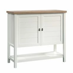 French country style imbues the Sauder Cottage Road Storage Cabinet‘s clean, crisp lines. Crafted with a engineered wood frame finished in fresh dual tones, a white base with a lintel oak top, this console-style cabinet is perfect for bedrooms and dining rooms alike. The crisp base includes two paneled doors that open to four adjustable interior storage shelves. The additional open shelf at the bottom is perfect for books or big serving dishes. The open top offers extra storage and display space, too.