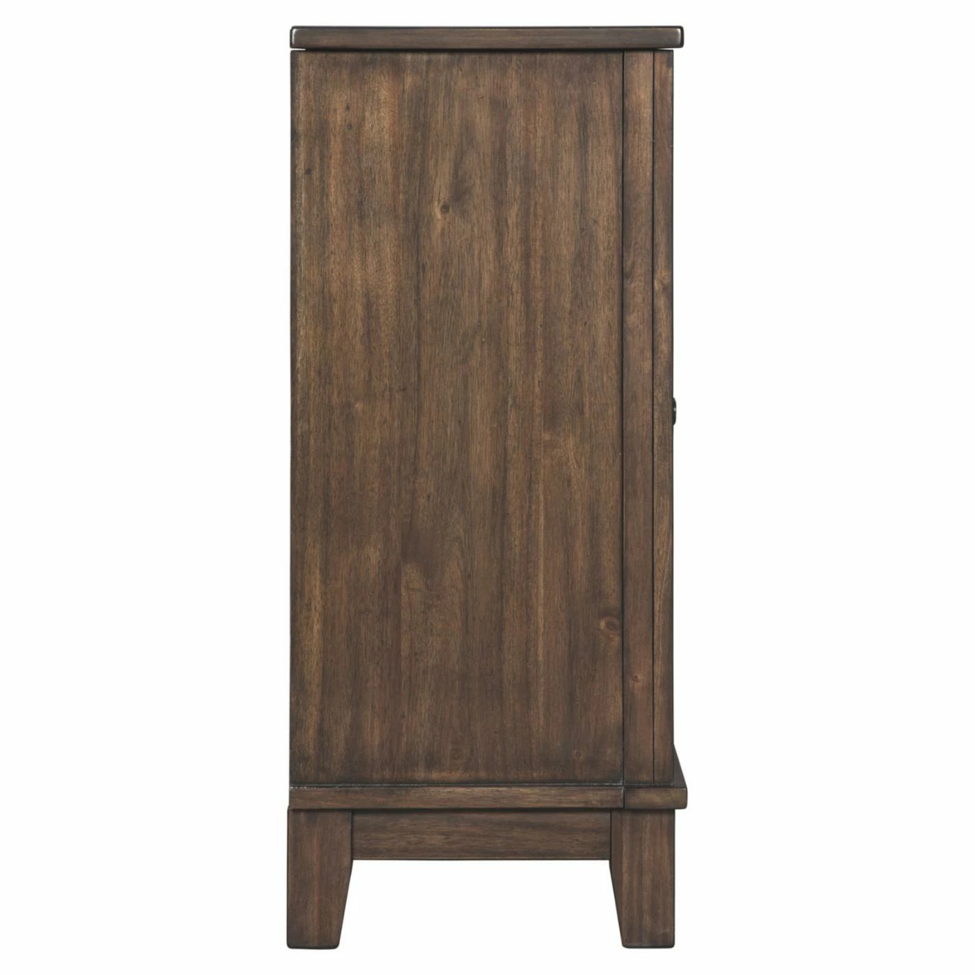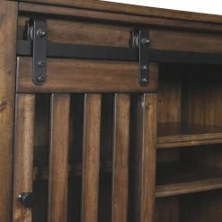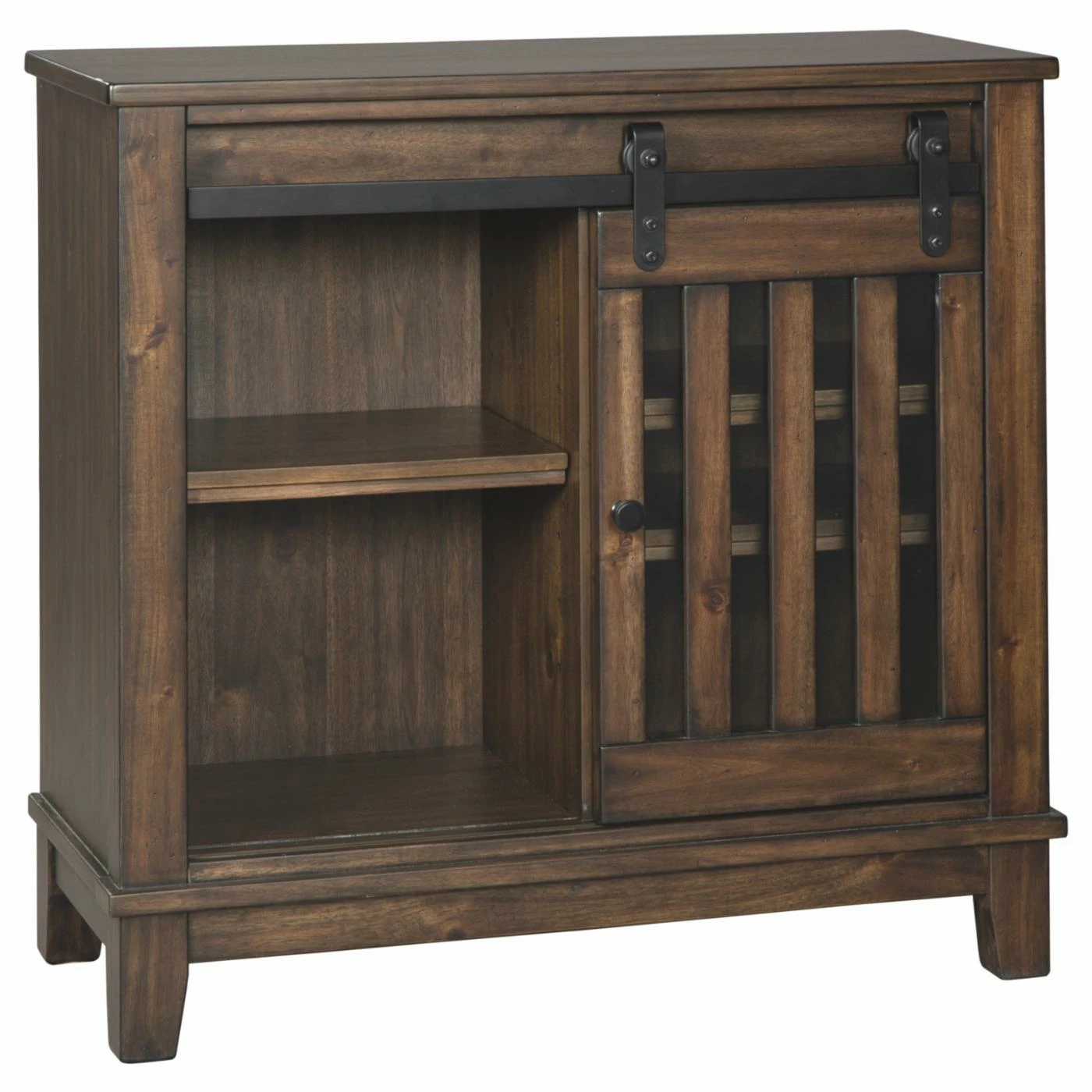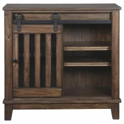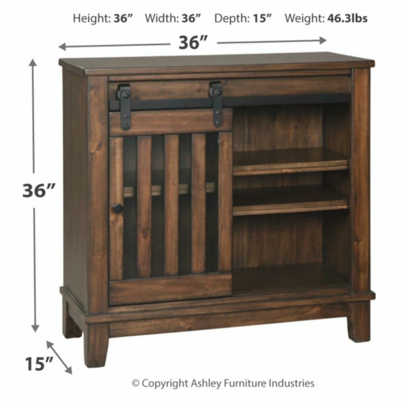 Grace your space with a little down home charm, compliments of the Signature Design by Ashley Brookport Accent Cabinet. With its smooth-gliding, open-slat barn door, deep brown finish, and black metal hardware, this cabinet is a honey of a home accent. Its veneers, solid, and engineered wood construction ensures durability while its three interior, adjustable shelves provide excellent storage. The spacious top can be home to your favorite decorative pieces.