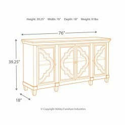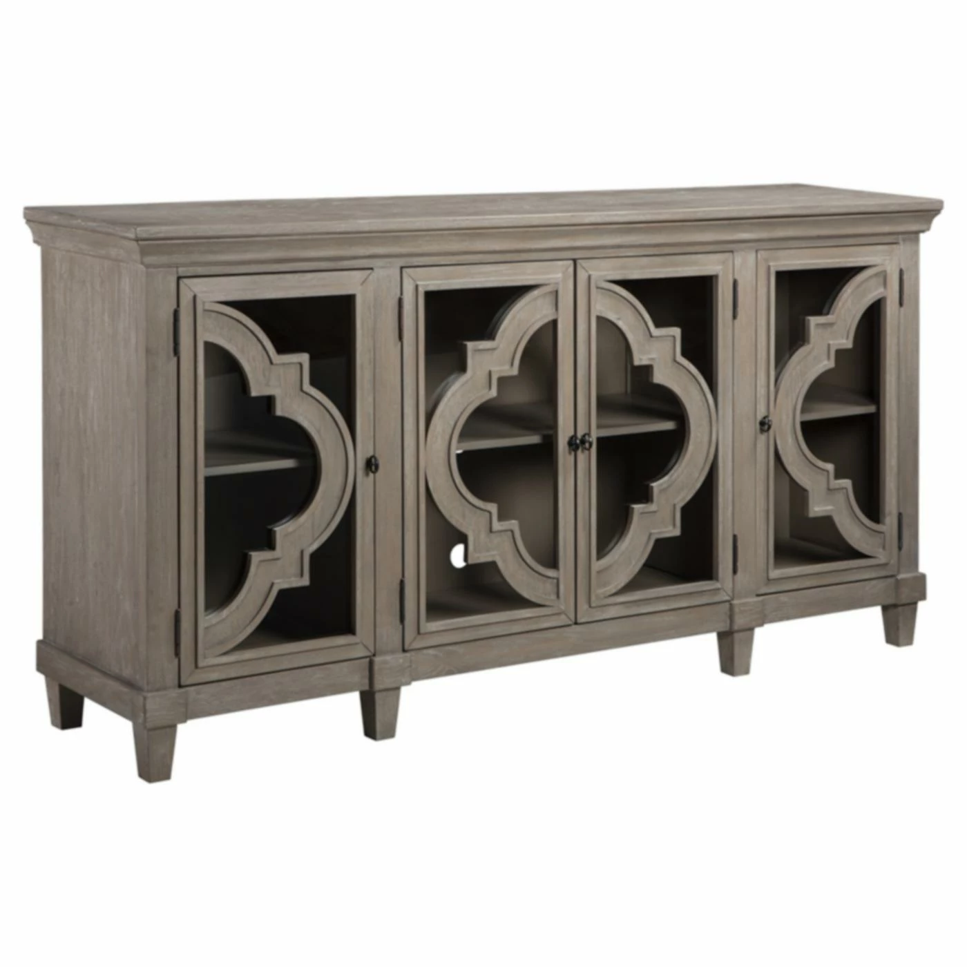 Showcase your favorite dinnerware and collectibles in graceful style with the Signature Design by Ashley Fossil Ridge 76 in. Four Door Accent Cabinet. Made of wood solids and veneers, this sophisticated accent cabinet includes four doors and shelving for maximum storage and display. The openwork, quatrefoil-shaped overlay and gray finish gives the piece an air of luxury ideal for any room.