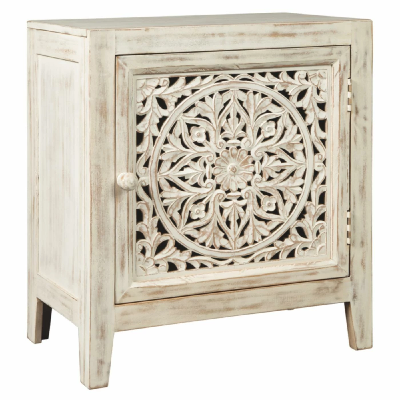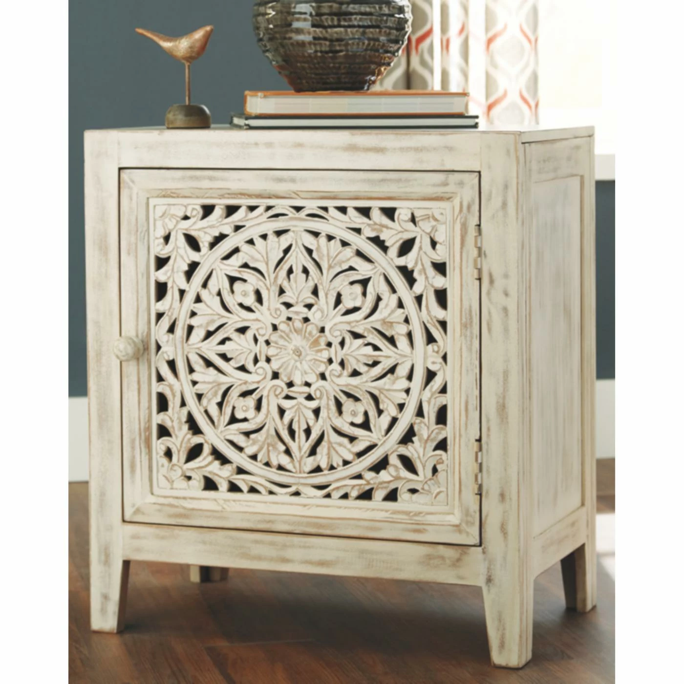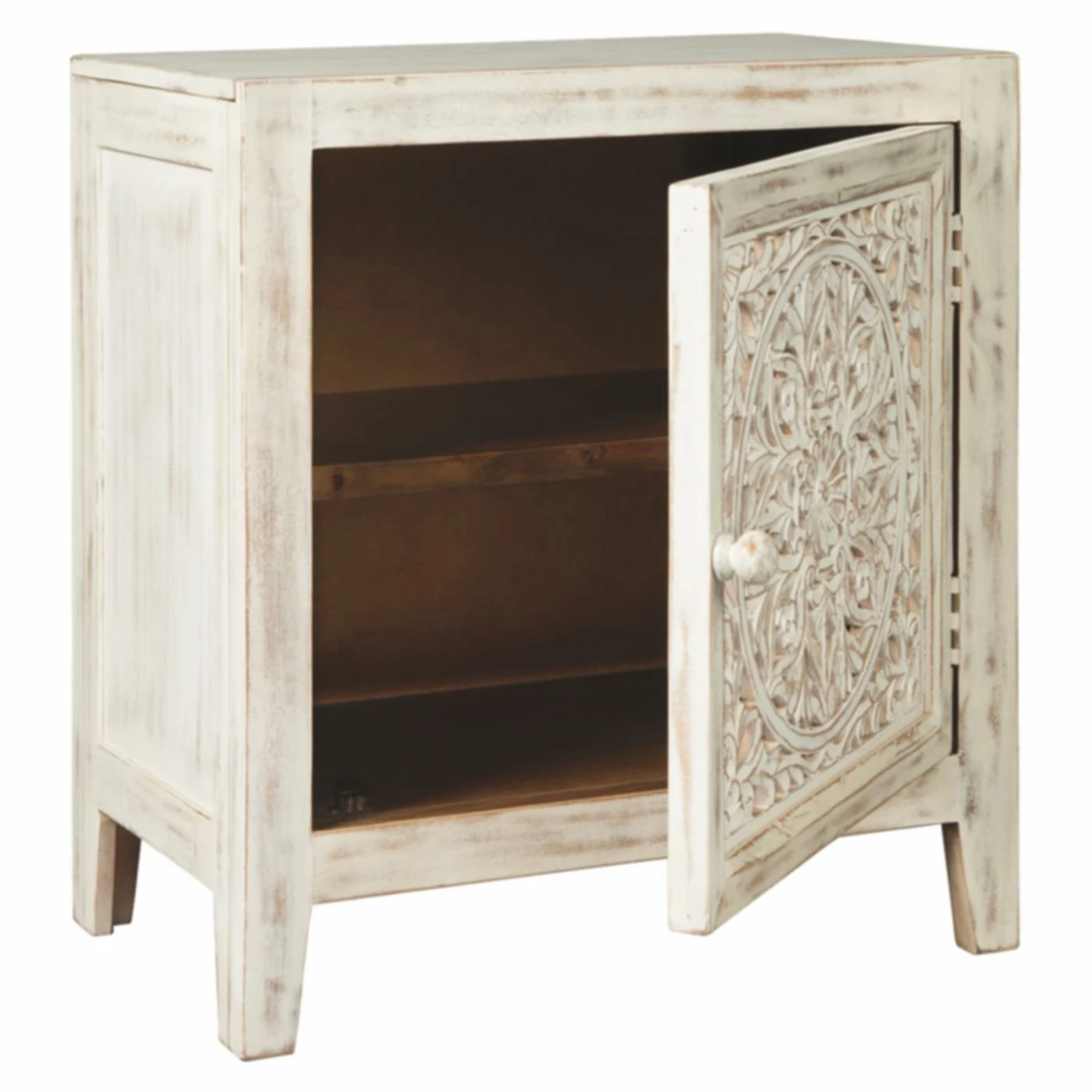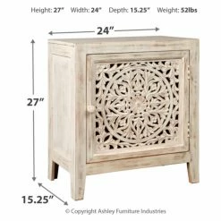 An intricate carved flower medallion graces the Signature Design by Ashley Fossil Ridge Accent Cabinet, making it a show-stopper in your entryway or living room. This cabinet’s solid, engineered wood, and veneers construction is topped in an antique white finish, creating an aesthetic that’s replete with vintage appeal. The single door opens to reveal an interior shelf, allowing you to store odds and ends and keep your space tidy. Its top can be home to your favorite decorative pieces and photos.