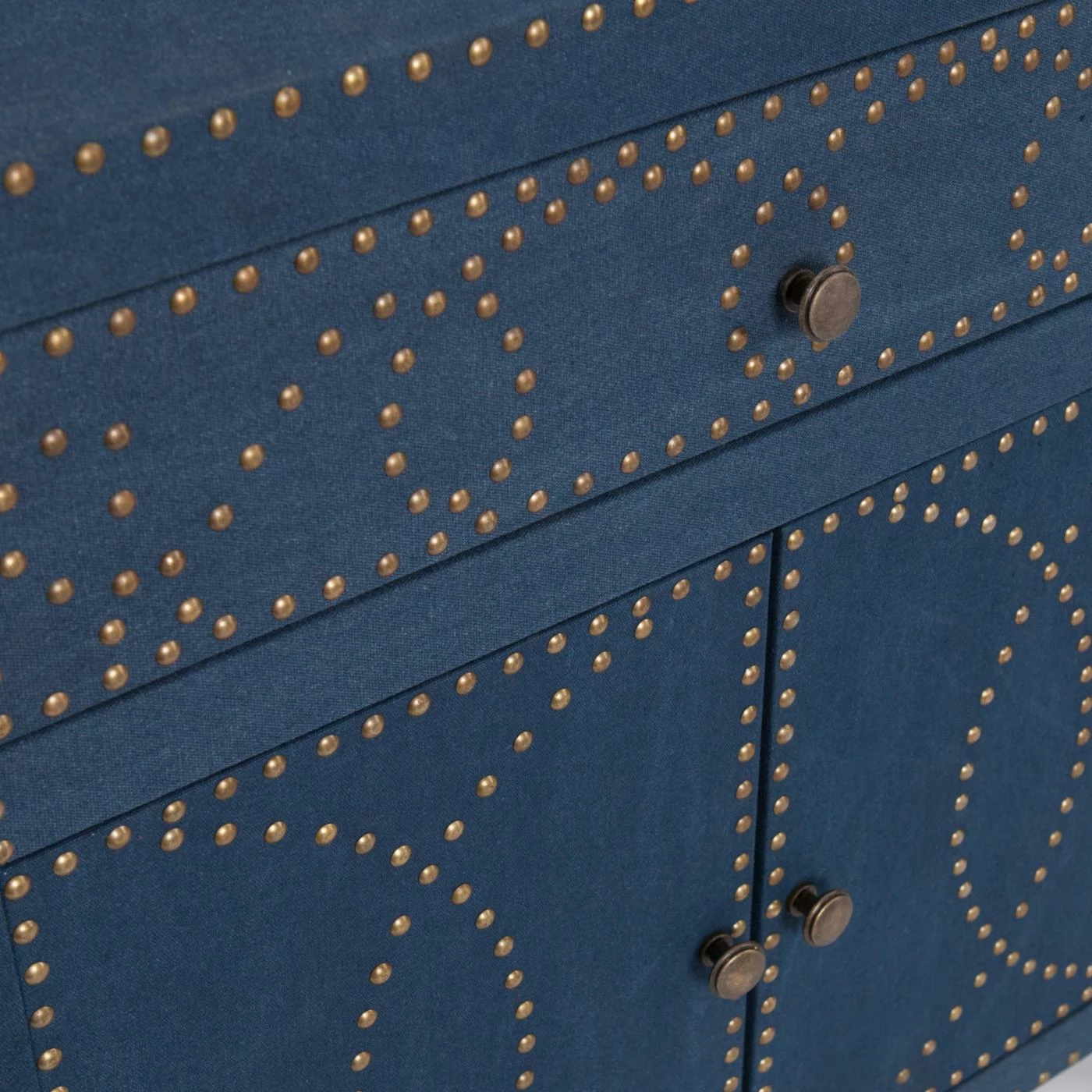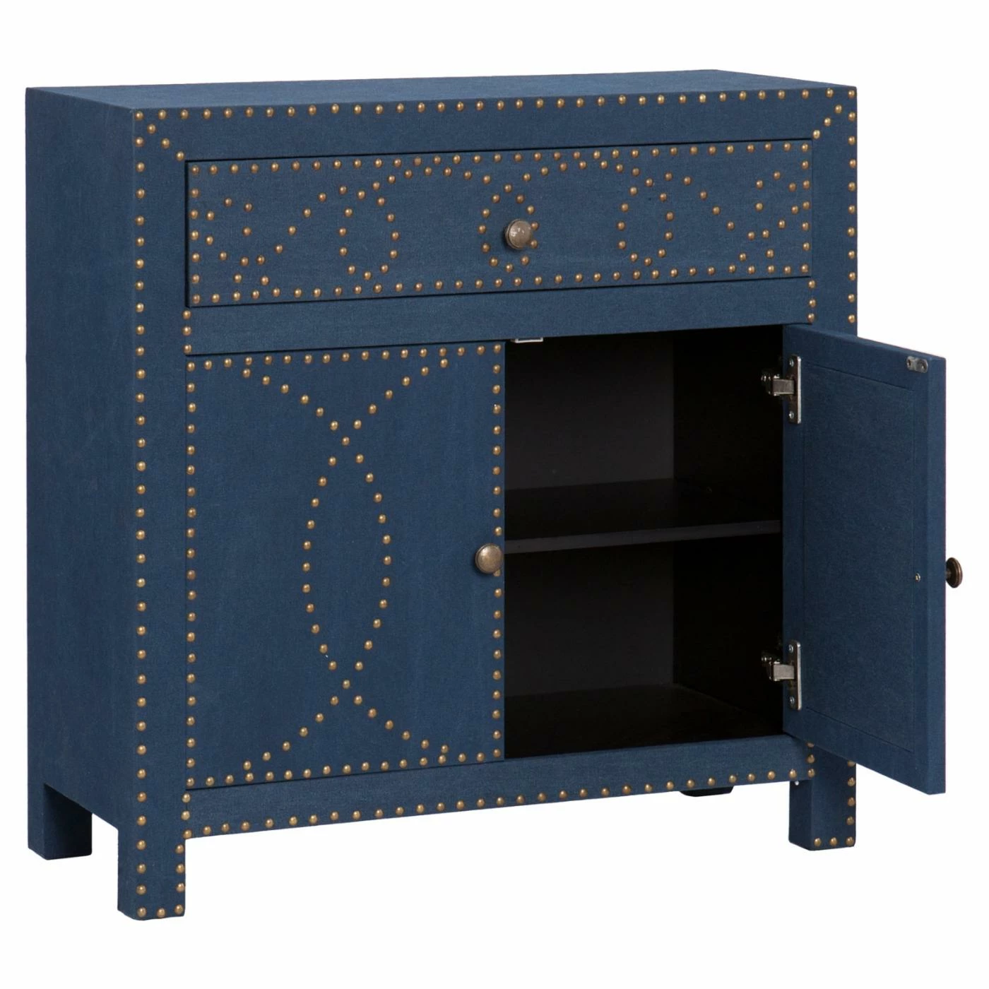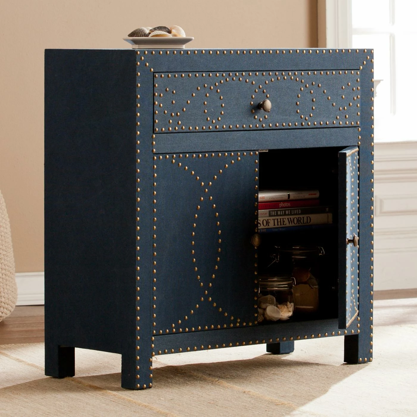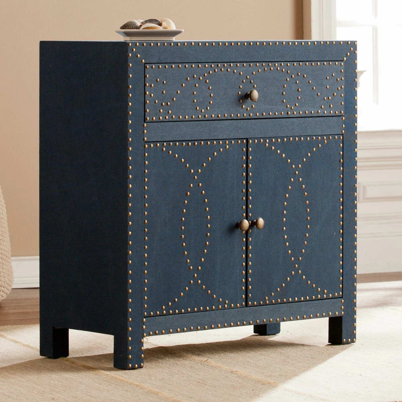 Add bold flair and smart storage with the Southern Enterprises Florian Double Door Cabinet. This cabinet features clean lines and is fully upholstered in soft navy linen. Brass nail head detailing embellishes the front of this cabinet. Its top drawer is lined in fabric and features smooth metal glides. Double doors open to reveal a fixed shelf inside.
