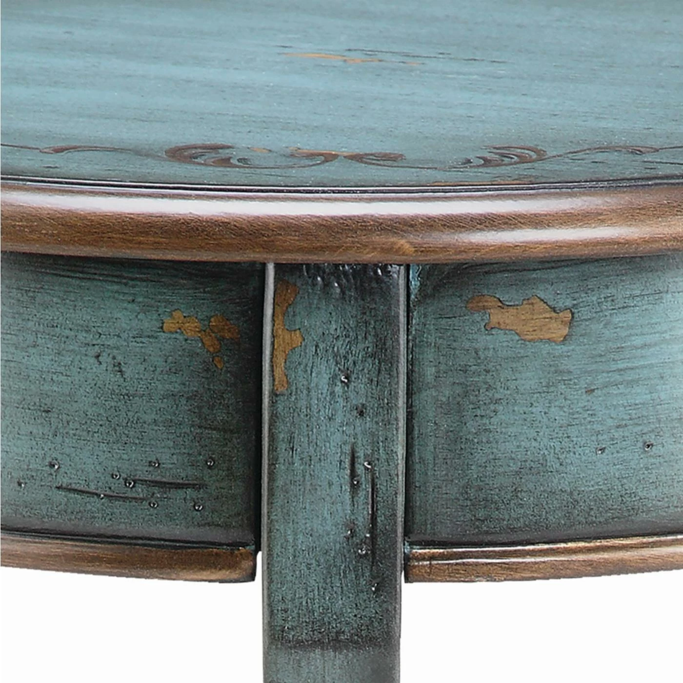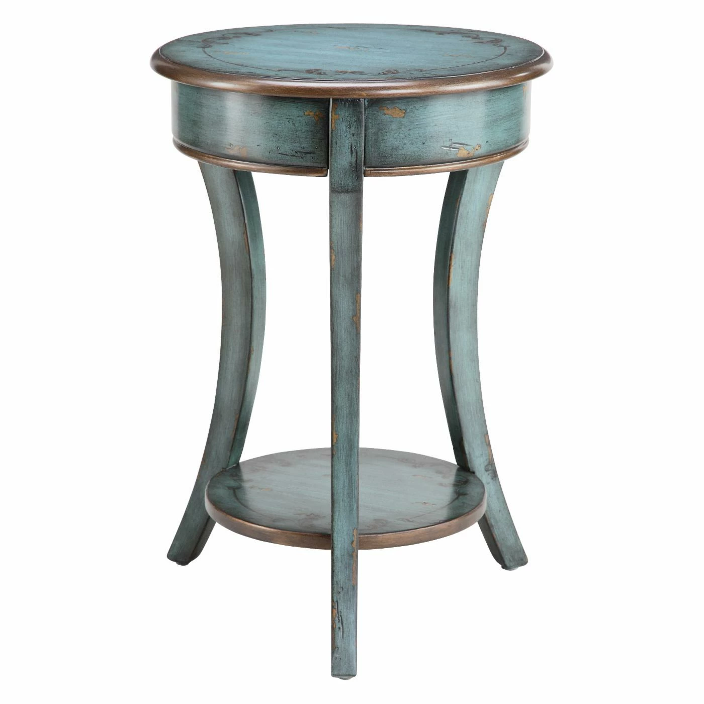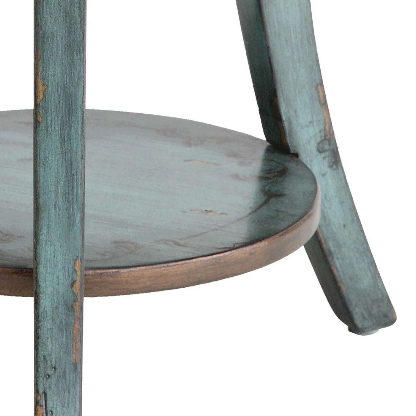 A heavily distressed, hand-painted turquoise and bronze finish gives the Stein World Freya Accent Table big style points. The perfect size for any room, use this round wood table as a stand-alone accent piece or to display your favorite pieces.