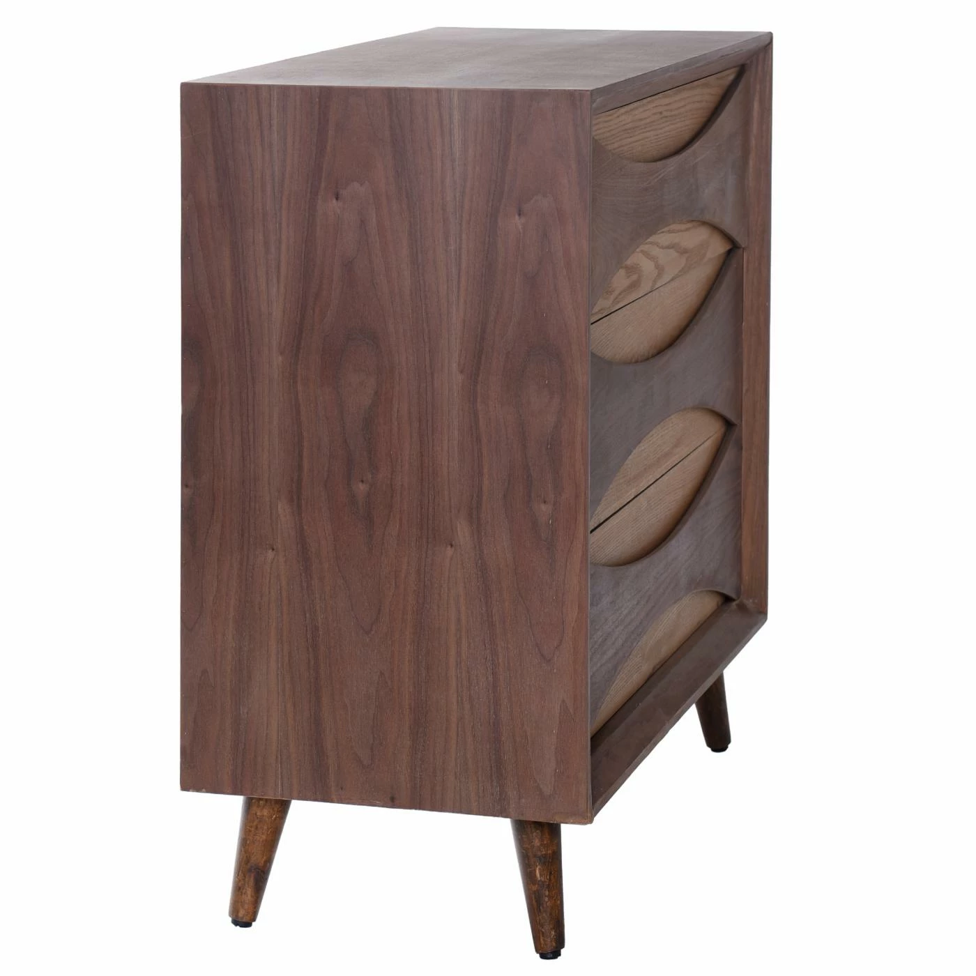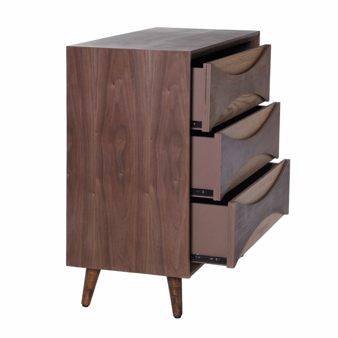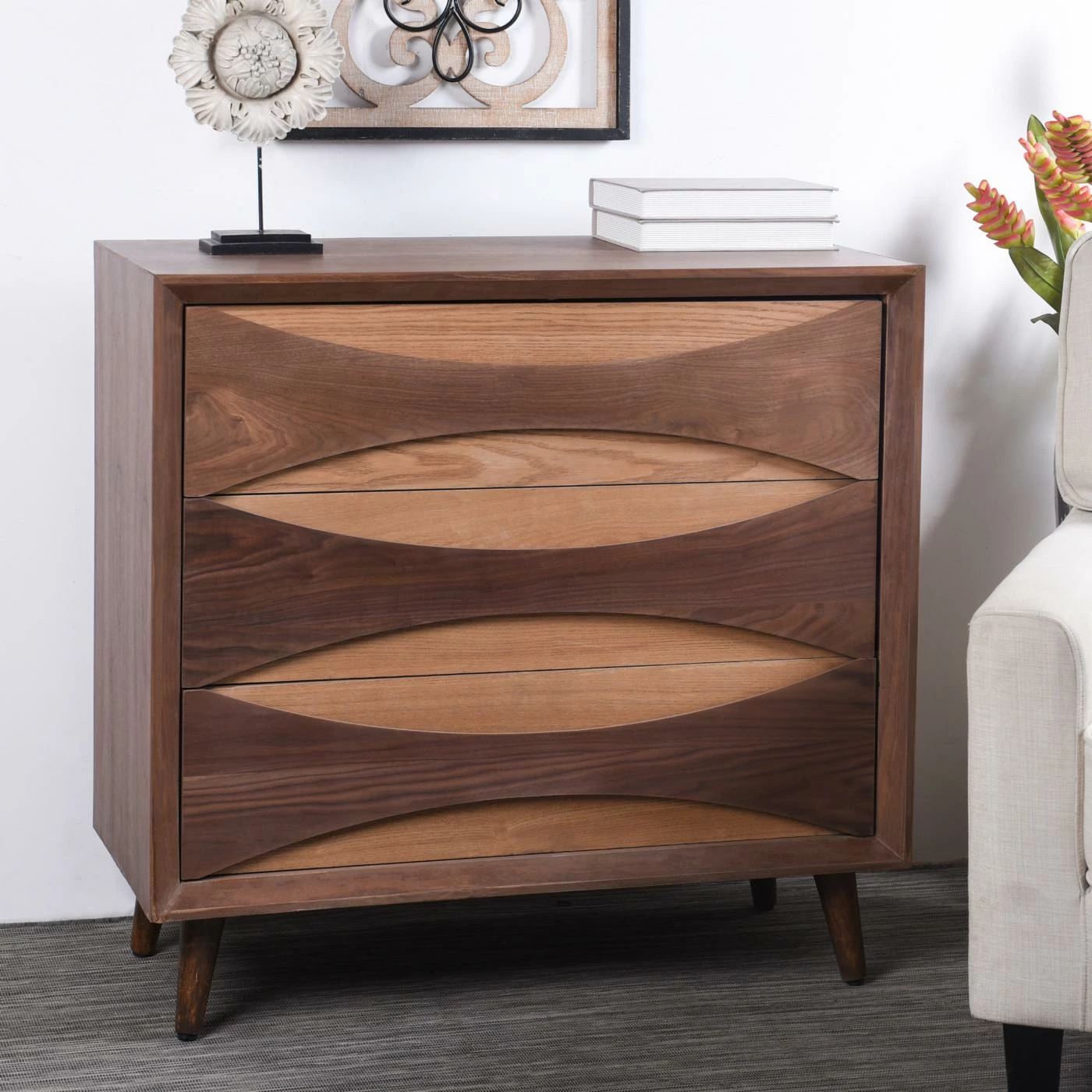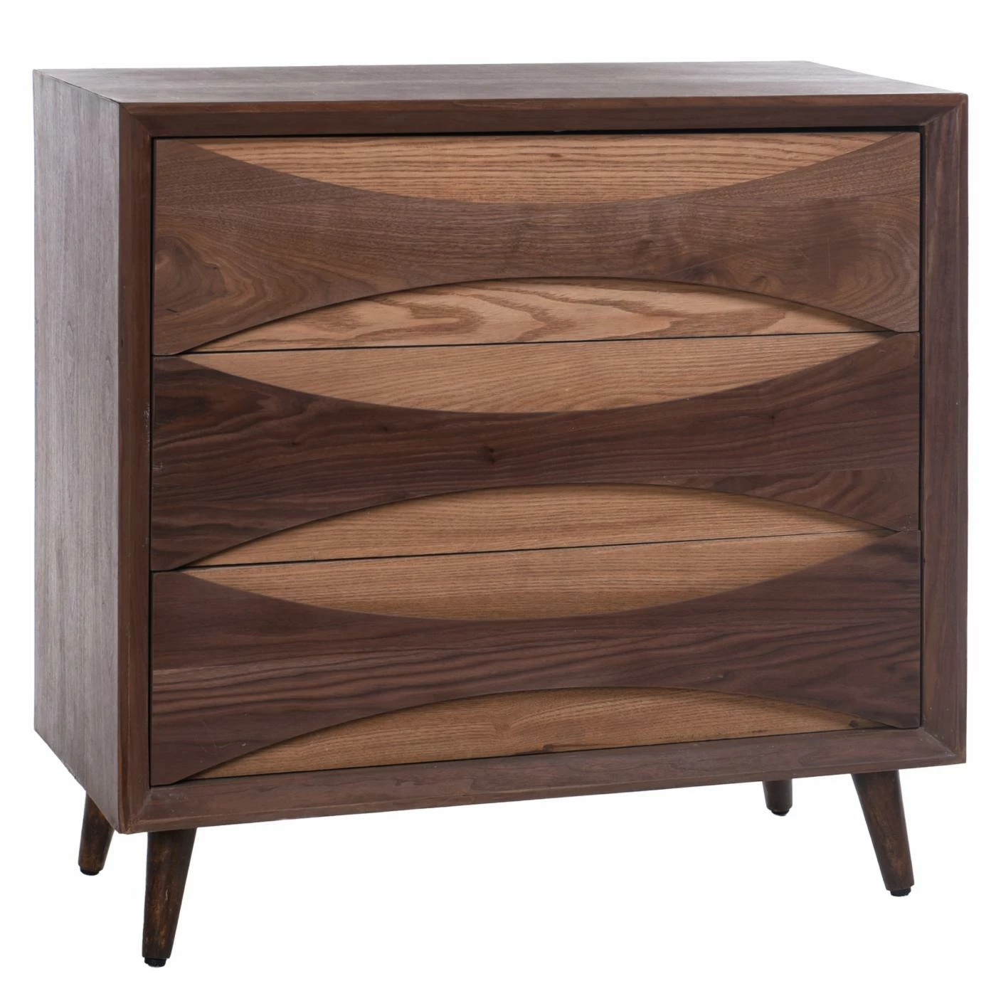 Wood construction and carved details give the StyleCraft 3 Drawer Decorative Chest a natural look. This chest is equipped with three drawers surrounded by a beveled edge. Light and dark walnut finishes add contrast to the curved overlay design. It’s supported by angled, tapered legs for a mid-century modern look.