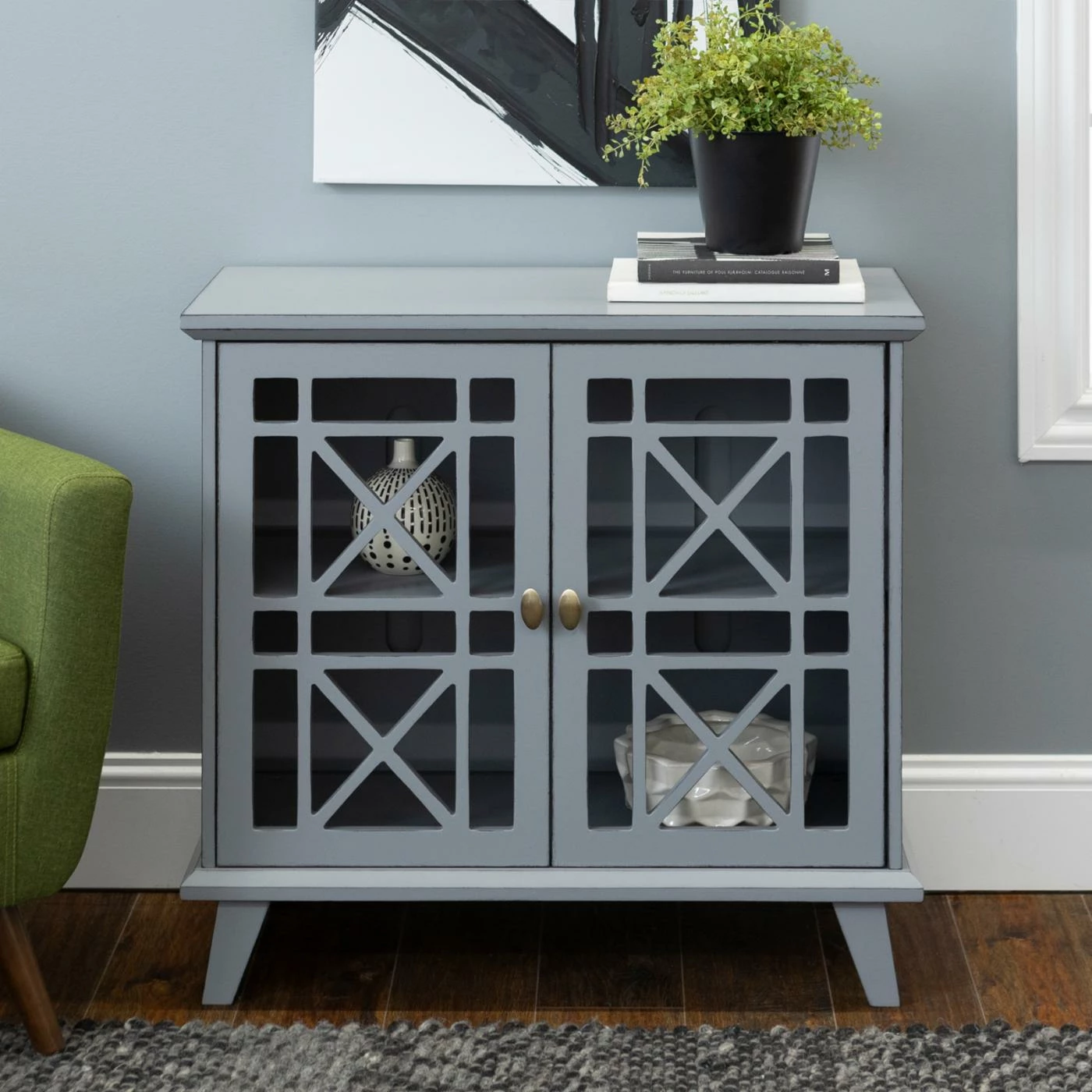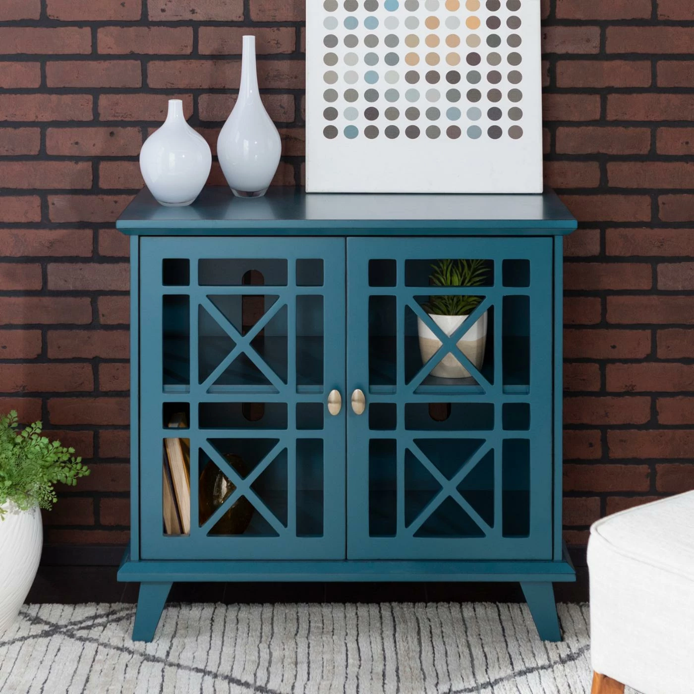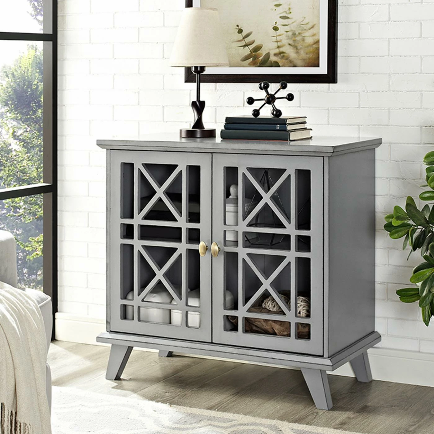 Hallway, entryway, living room, kitchen – spruce up most any space with the Walker Edison Gwen Fretwork Accent Console. The double doors on this accent console feature an open fretwork design. Open the doors to find an adjustable interior shelf that’s perfect for books, home accents, storage baskets, and more. The accent console is crafted of solid wood and high-grade engineered wood (engineered wood), and it’s available in a choice of finishes.