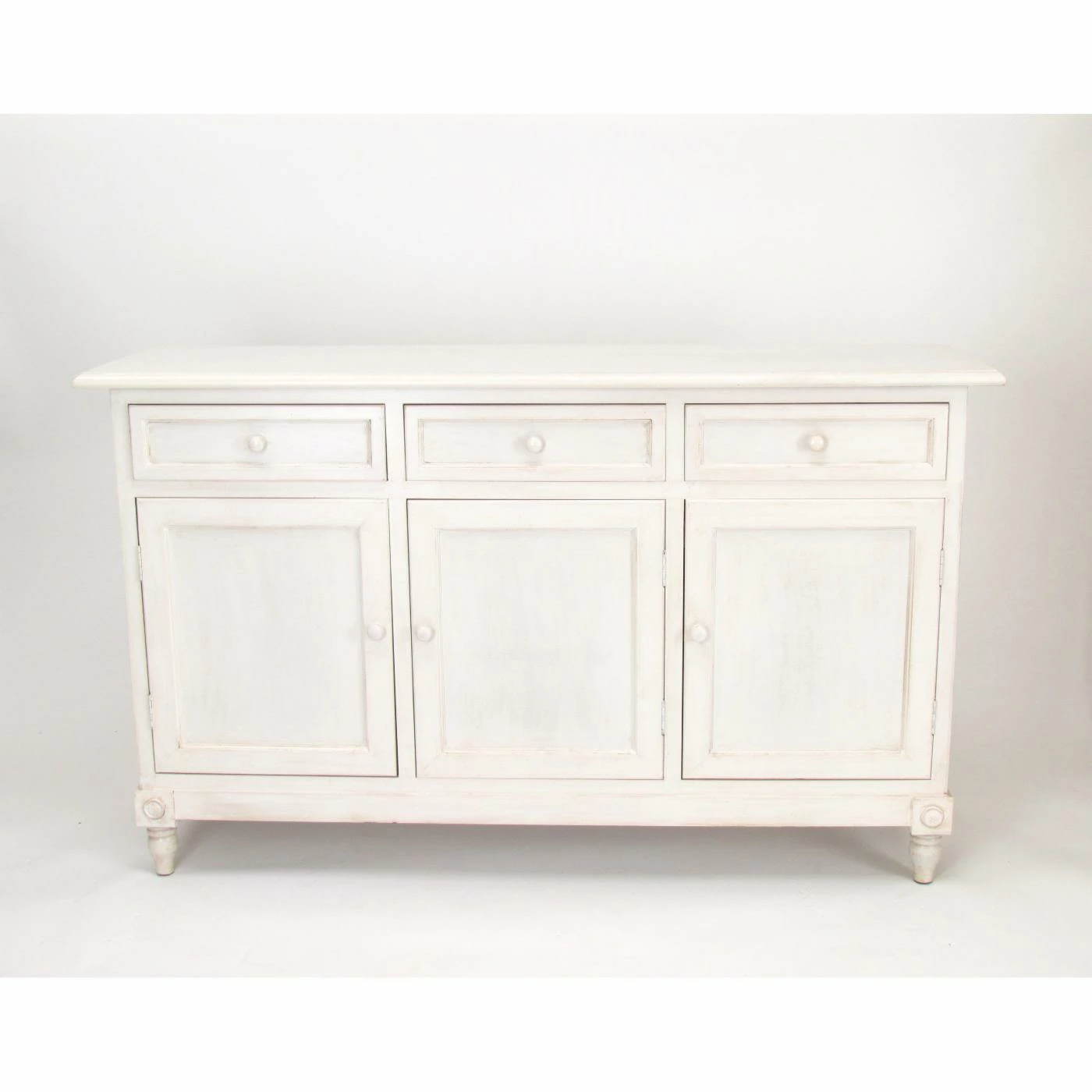 Offering both storage and style, the Wayborn Brookfield Console is a versatile addition to your home. Constructed of sturdy pinewood, this console features an antique whitewash finish. It includes three drawers as well as three doors that open to cabinets that include a fixed shelf.