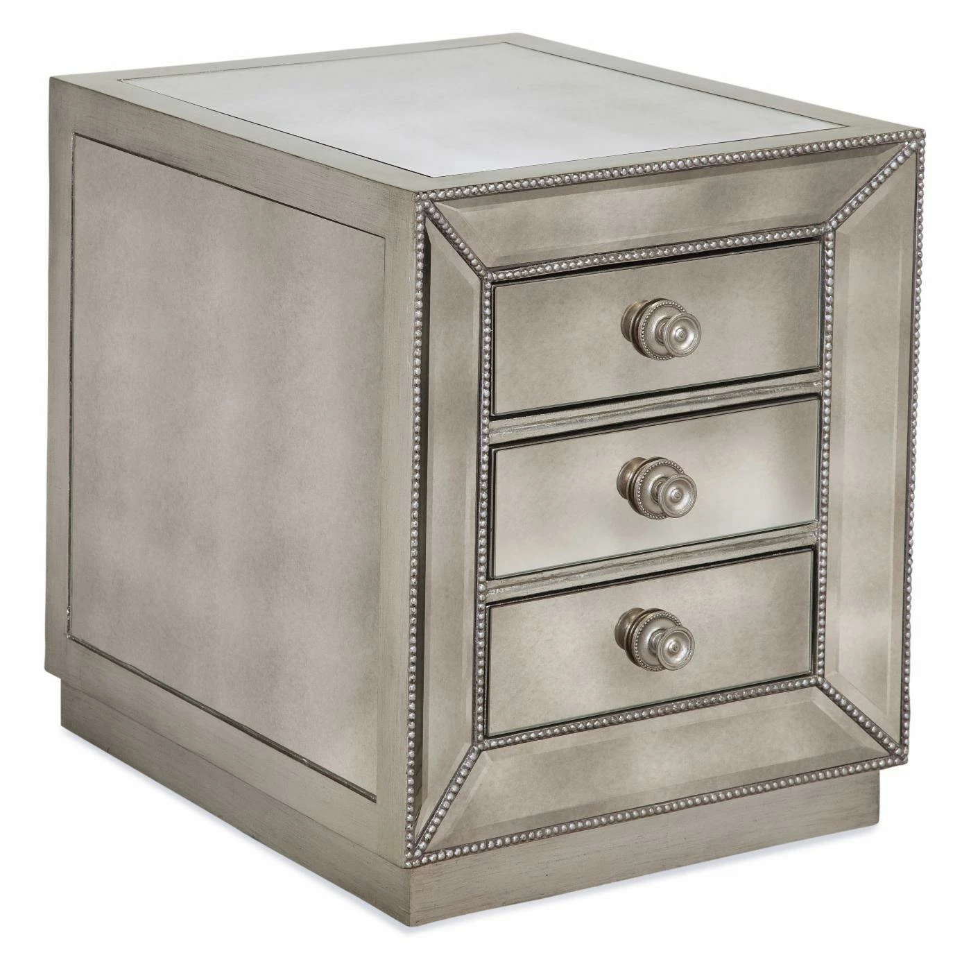 Silver leaf ‘beading’ adorns the front edges of the Bassett Mirror Murano Chairside Chest to add an elegant accent to a glamorous design. Three drawers offer convenient storage space in your living room, and the antiqued mirrored surfaces create a display-ready piece that combines glamorous flair and Old World charm.
